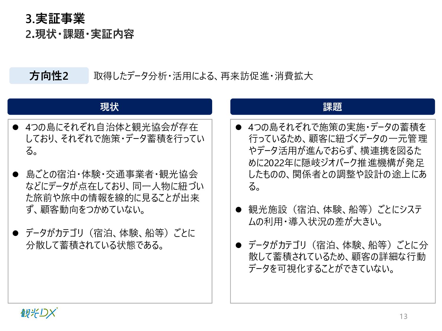 た旅前や旅中の情報を線的に見ることが出来 ず、顧客動向をつかめていない。 ⚫ データがカテゴリ(宿泊、体験、船等)ごとに 分散して蓄積されている状態である。 ⚫ 4つの島それぞれで施策の実施・データの蓄積を 行っているため、顧客に紐づくデータの一元管理 やデータ活用が進んでおらず、横連携を図るた めに2022年に隠岐ジオパーク推進機構が発足 したものの、関係者との調整や設計の途上にあ る。 ⚫ 観光施設(宿泊、体験、船等)ごとにシステ ムの利用・導入状況の差が大きい。 ⚫ データがカテゴリ(宿泊、体験、船等)ごとに分 散して蓄積されているため、顧客の詳細な行動 データを可視化することができていない。 3.実証事業 2.現状・課題・実証内容 方向性2 取得したデータ分析・活用による、再来訪促進・消費拡大
