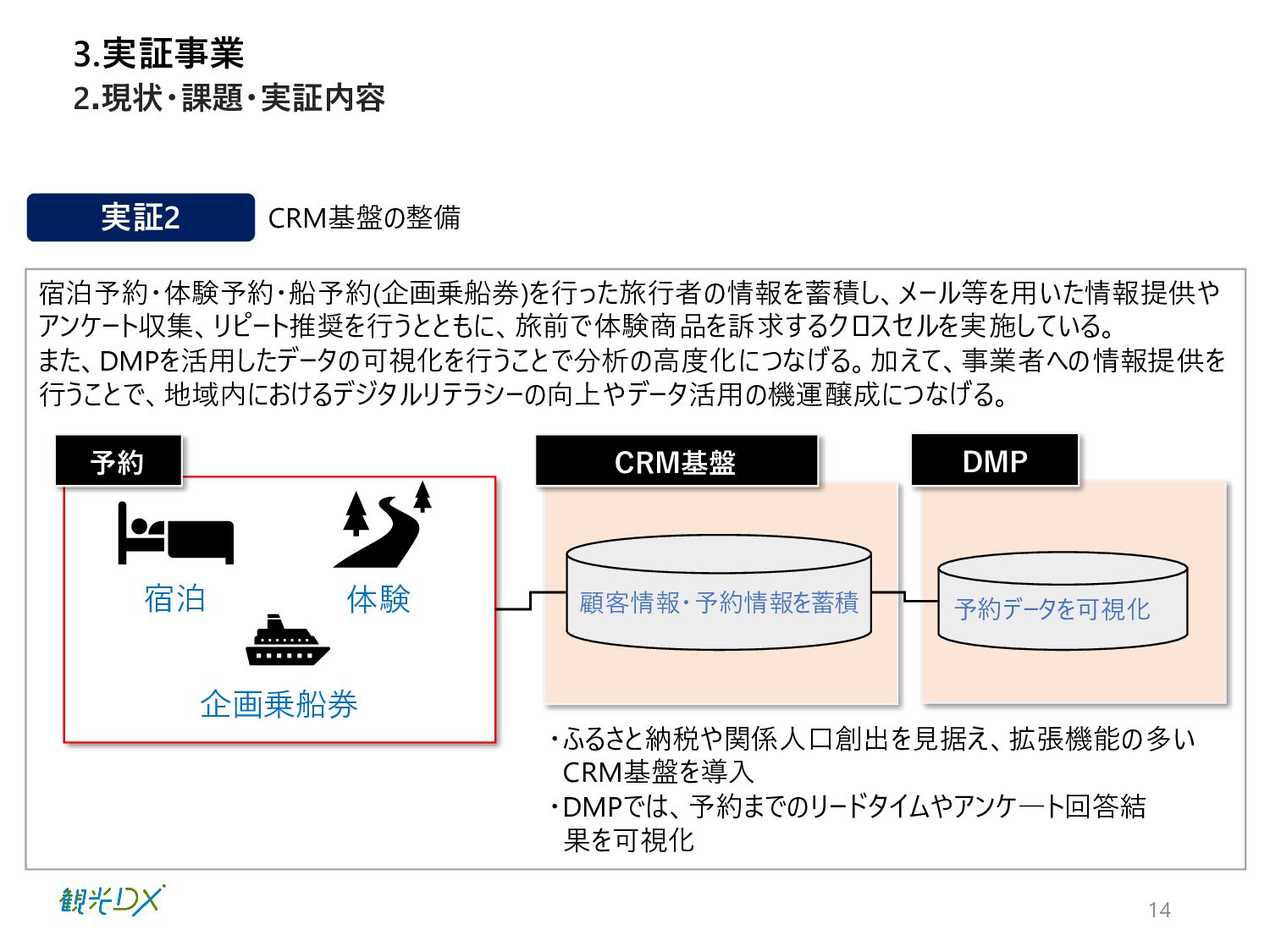 一定の条件を基に顧客情報をリスト化し、 旅前時に体験商品および企画乗船券のク ロスセルを行い、事前予約を促進する。 • グラフィック表現の多彩さや直感的なアク ションに定評のあるDMPを導入し、地域関 係者への共有を図ることが可能 実証内容の概要を示します。 ◼ システム開発 3.実証事業 宿泊 体験 企画乗船券 CRM基盤 DMP 《顧客情報》 ・氏名 ・性別 ・生年月日 ・住所 ・メールアドレス ・メルマガ配信許諾等 《予約情報》 ・宿泊/体験日 ・予約プラン ・人数 ・料金 ・集合場所までのアクセス ・アンケート内容等