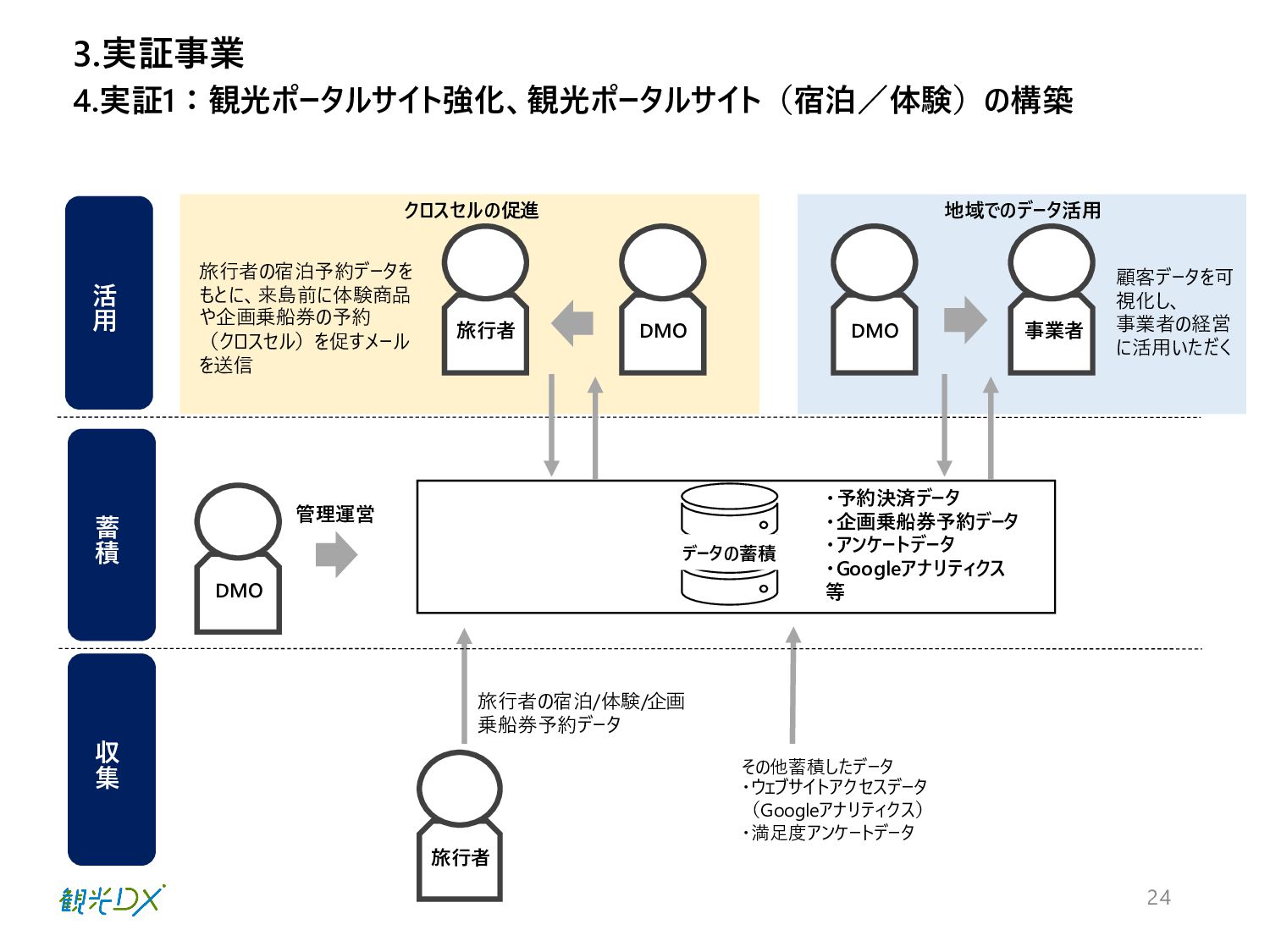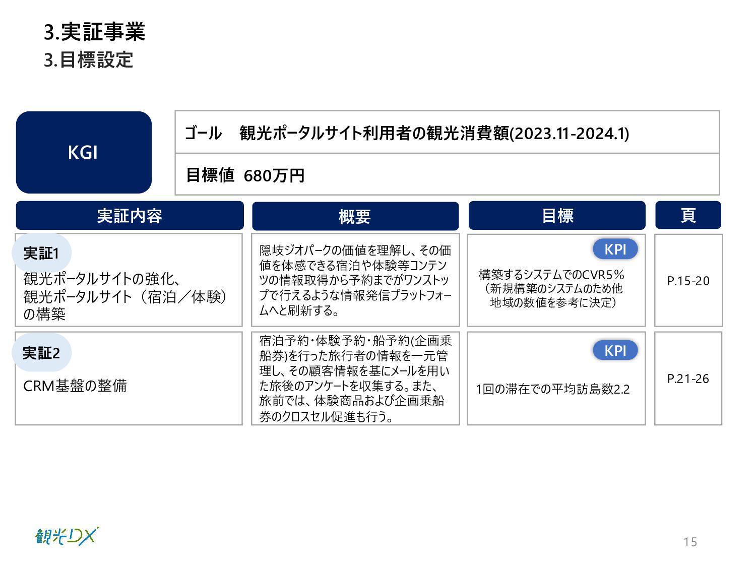 (新規構築のシステムのため他 地域の数値を参考に決定) 概要 頁 実証1 P.15-20 宿泊予約・体験予約・船予約(企画乗 船券)を行った旅行者の情報を一元管 理し、その顧客情報を基にメールを用い た旅後のアンケートを収集する。また、 旅前では、体験商品および企画乗船 券のクロスセル促進も行う。 実証2 P.21-26 ゴール 観光ポータルサイト利用者の観光消費額(2023.11-2024.1) 目標値 KPI 3.実証事業 3.目標設定 680万円 1回の滞在での平均訪島数2.2 KPI 観光ポータルサイトの強化、 観光ポータルサイト(宿泊/体験) の構築 CRM基盤の整備