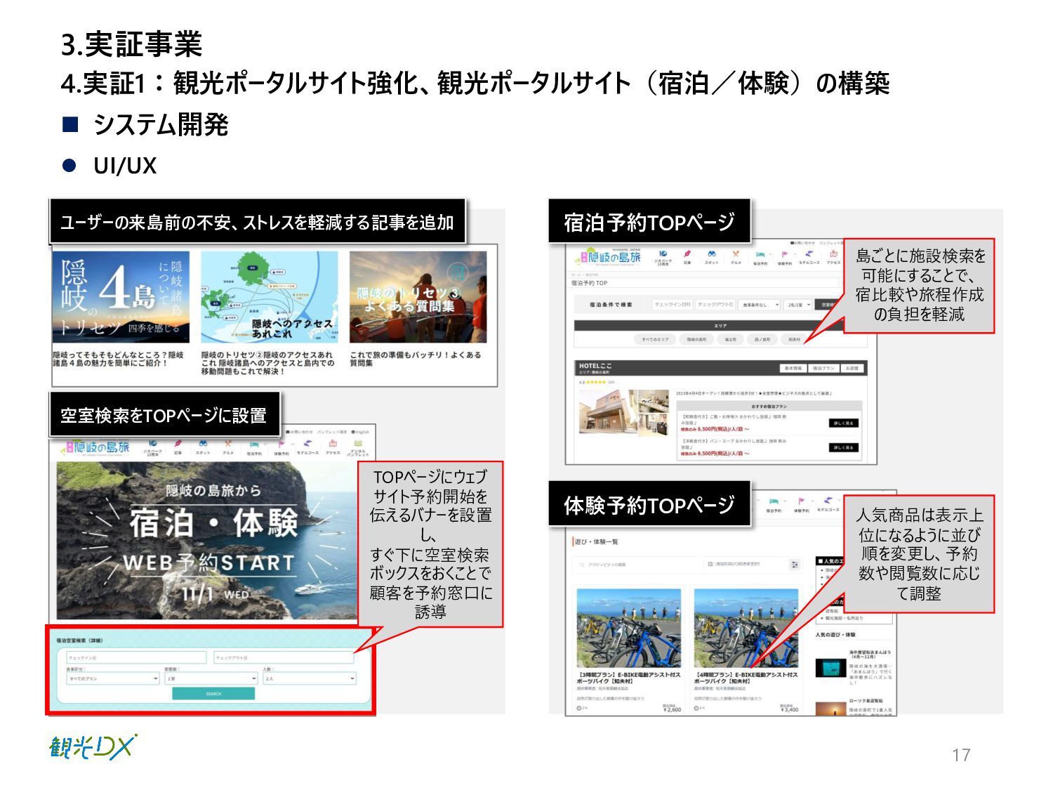16 4.実証1:観光ポータルサイト強化、観光ポータルサイト(宿泊/体験)の構築 ⚫ システム構成 ⚫ コンセプト・機能概要 URL:https://www.e-oki.net ▪観光ポータルサイトの強化 軸①:ユーザーの来島前の不安、ストレスを軽減する ユーザーニーズが非常に高いアクセスや天候情報などを、疑問に