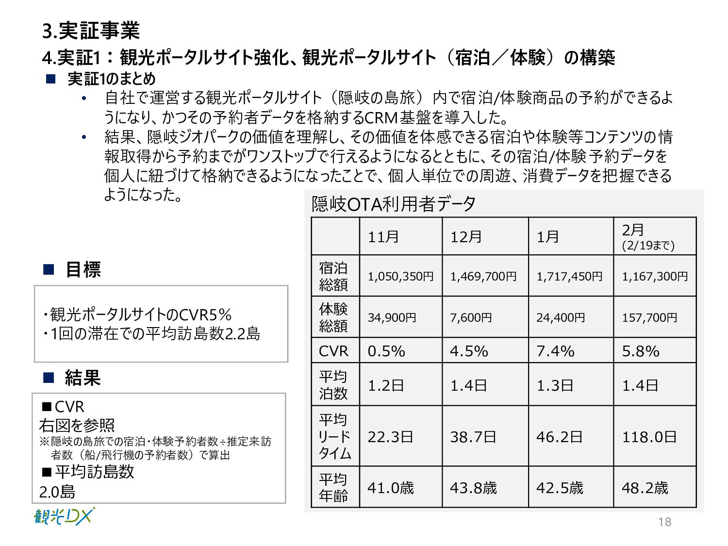 ※隠岐の島旅での宿泊・体験予約者数÷推定来訪 者数(船/飛行機の予約者数)で算出 ▪平均訪島数 2.0島 ◼ 実証1のまとめ • 自社で運営する観光ポータルサイト(隠岐の島旅)内で宿泊/体験商品の予約ができるよ うになり、かつその予約者データを格納するCRM基盤を導入した。 • 結果、隠岐ジオパークの価値を理解し、その価値を体感できる宿泊や体験等コンテンツの情 報取得から予約までがワンストップで行えるようになるとともに、その宿泊/体験予約データを 個人に紐づけて格納できるようになったことで、個人単位での周遊、消費データを把握できる ようになった。 4.実証1:観光ポータルサイト強化、観光ポータルサイト(宿泊/体験)の構築 3.実証事業 11月 12月 1月 2月 (2/19まで) 宿泊 総額 1,050,350円 1,469,700円 1,717,450円 1,167,300円 体験 総額 34,900円 7,600円 24,400円 157,700円 CVR 0.5% 4.5% 7.4% 5.8% 平均 泊数 1.2日 1.4日 1.3日 1.4日 平均 リード タイム 22.3日 38.7日 46.2日 118.0日 平均 年齢 41.0歳 43.8歳 42.5歳 48.2歳