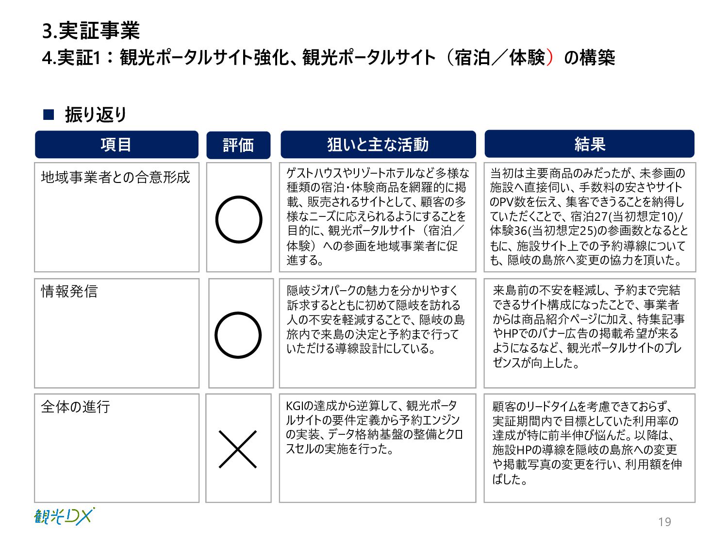様なニーズに応えられるようにすることを 目的に、観光ポータルサイト(宿泊/ 体験)への参画を地域事業者に促 進する。 当初は主要商品のみだったが、未参画の 施設へ直接伺い、手数料の安さやサイト のPV数を伝え、集客できうることを納得し ていただくことで、宿泊27(当初想定10)/ 体験36(当初想定25)の参画数となるとと もに、施設サイト上での予約導線について も、隠岐の島旅へ変更の協力を頂いた。 地域事業者との合意形成 4.実証1:観光ポータルサイト強化、観光ポータルサイト(宿泊/体験)の構築 3.実証事業 情報発信 全体の進行 隠岐ジオパークの魅力を分かりやすく 訴求するとともに初めて隠岐を訪れる 人の不安を軽減することで、隠岐の島 旅内で来島の決定と予約まで行って いただける導線設計にしている。 来島前の不安を軽減し、予約まで完結 できるサイト構成になったことで、事業者 からは商品紹介ページに加え、特集記事 やHPでのバナー広告の掲載希望が来る ようになるなど、観光ポータルサイトのプレ ゼンスが向上した。 KGIの達成から逆算して、観光ポータ ルサイトの要件定義から予約エンジン の実装、データ格納基盤の整備とクロ スセルの実施を行った。 顧客のリードタイムを考慮できておらず、 実証期間内で目標としていた利用率の 達成が特に前半伸び悩んだ。以降は、 施設HPの導線を隠岐の島旅への変更 や掲載写真の変更を行い、利用額を伸 ばした。