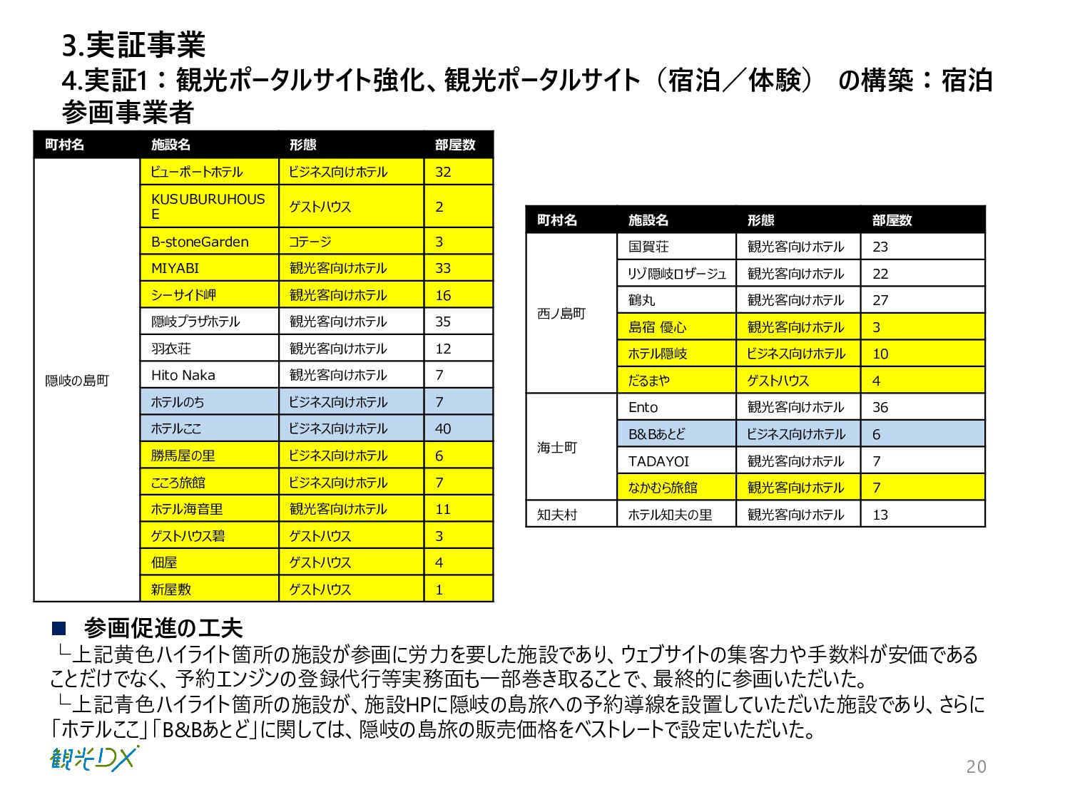 20 4.実証1:観光ポータルサイト強化、観光ポータルサイト(宿泊/体験) の構築:宿泊 参画事業者 3.実証事業 町村名 施設名 形態 部屋数 隠岐の島町
