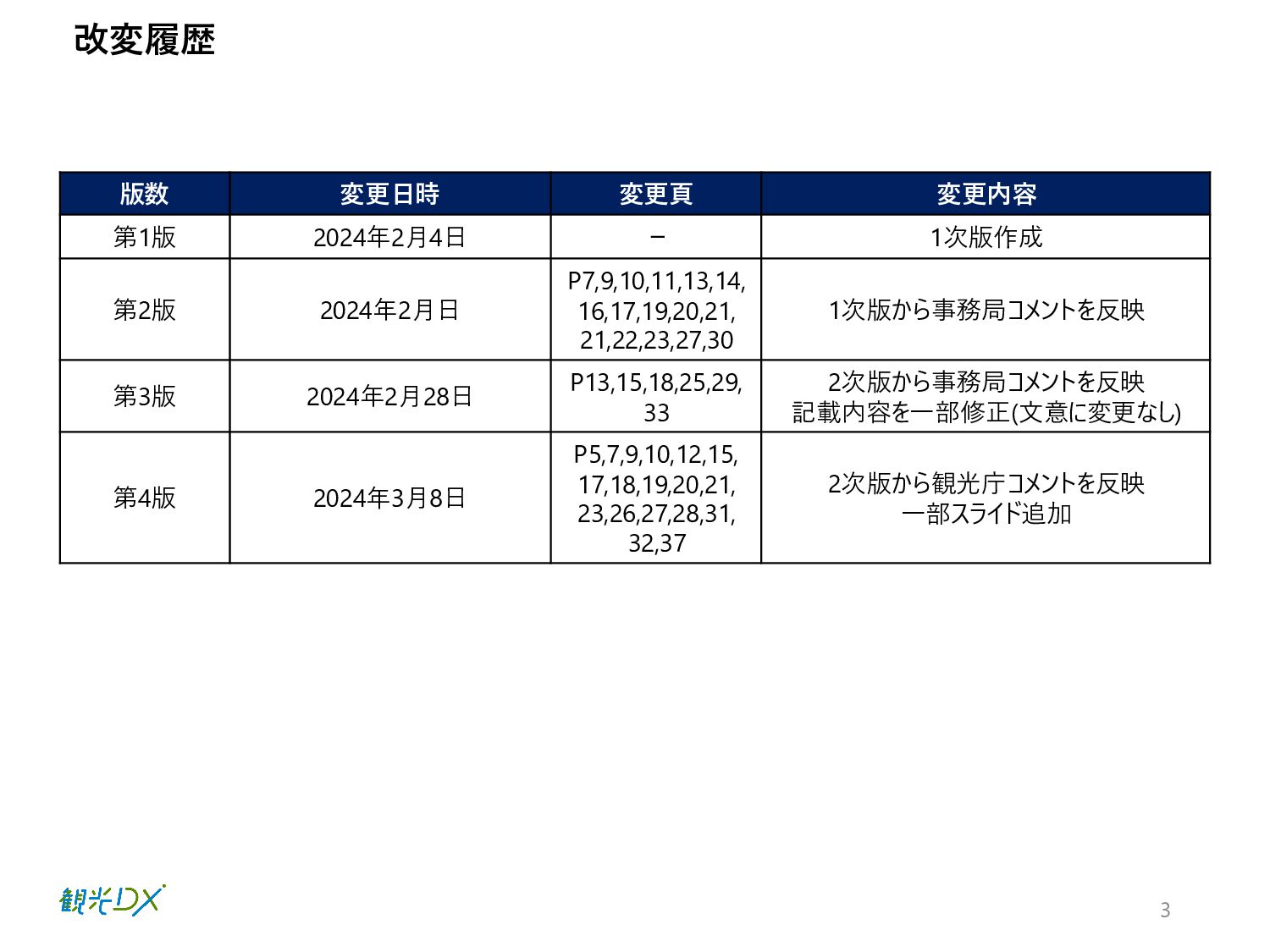 P7,9,10,11,13,14, 16,17,19,20,21, 21,22,23,27,30 1次版から事務局コメントを反映 第3版 2024年2月28日 P13,15,18,25,29, 33 2次版から事務局コメントを反映 記載内容を一部修正(文意に変更なし) 第4版 2024年3月8日 P5,7,9,10,12,15, 17,18,19,20,21, 23,26,27,28,31, 32,37 2次版から観光庁コメントを反映 一部スライド追加 改変履歴 3