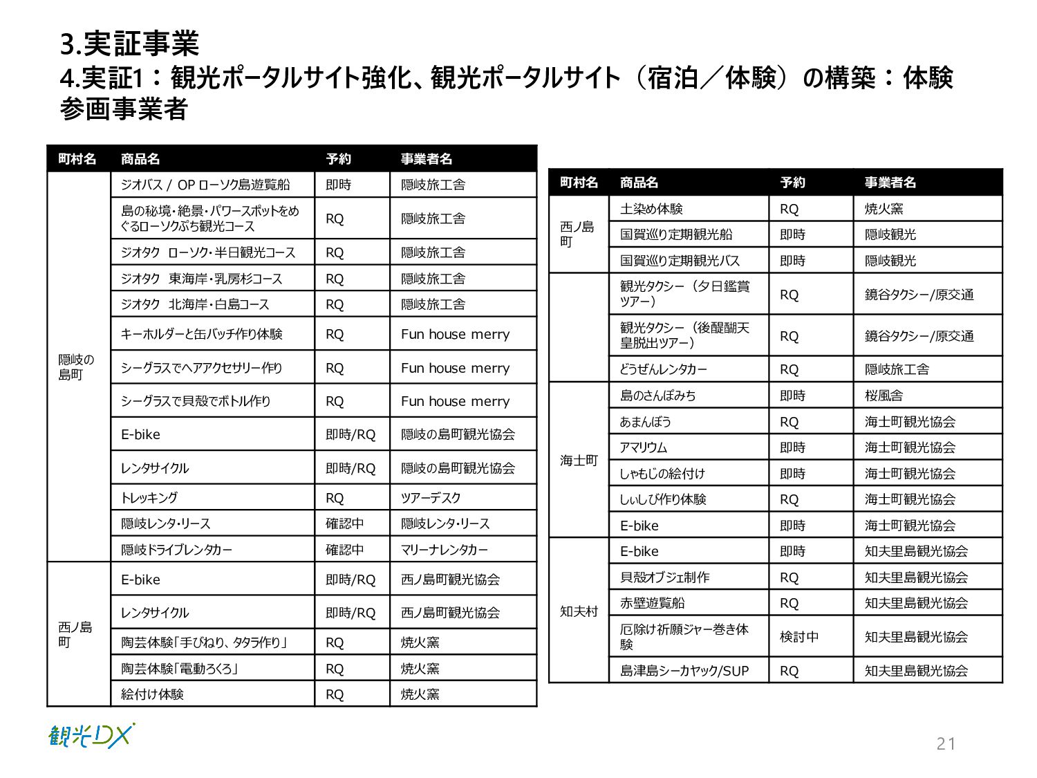 21 4.実証1:観光ポータルサイト強化、観光ポータルサイト(宿泊/体験)の構築:体験 参画事業者 3.実証事業 町村名 商品名 予約 事業者名 隠岐の 島町