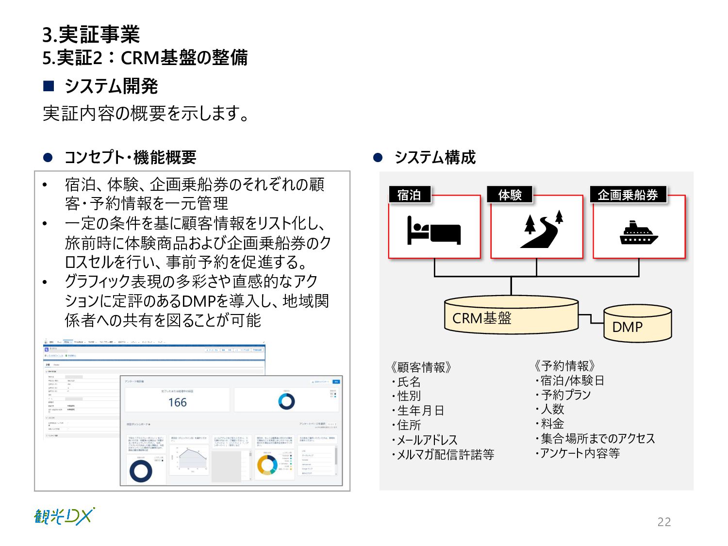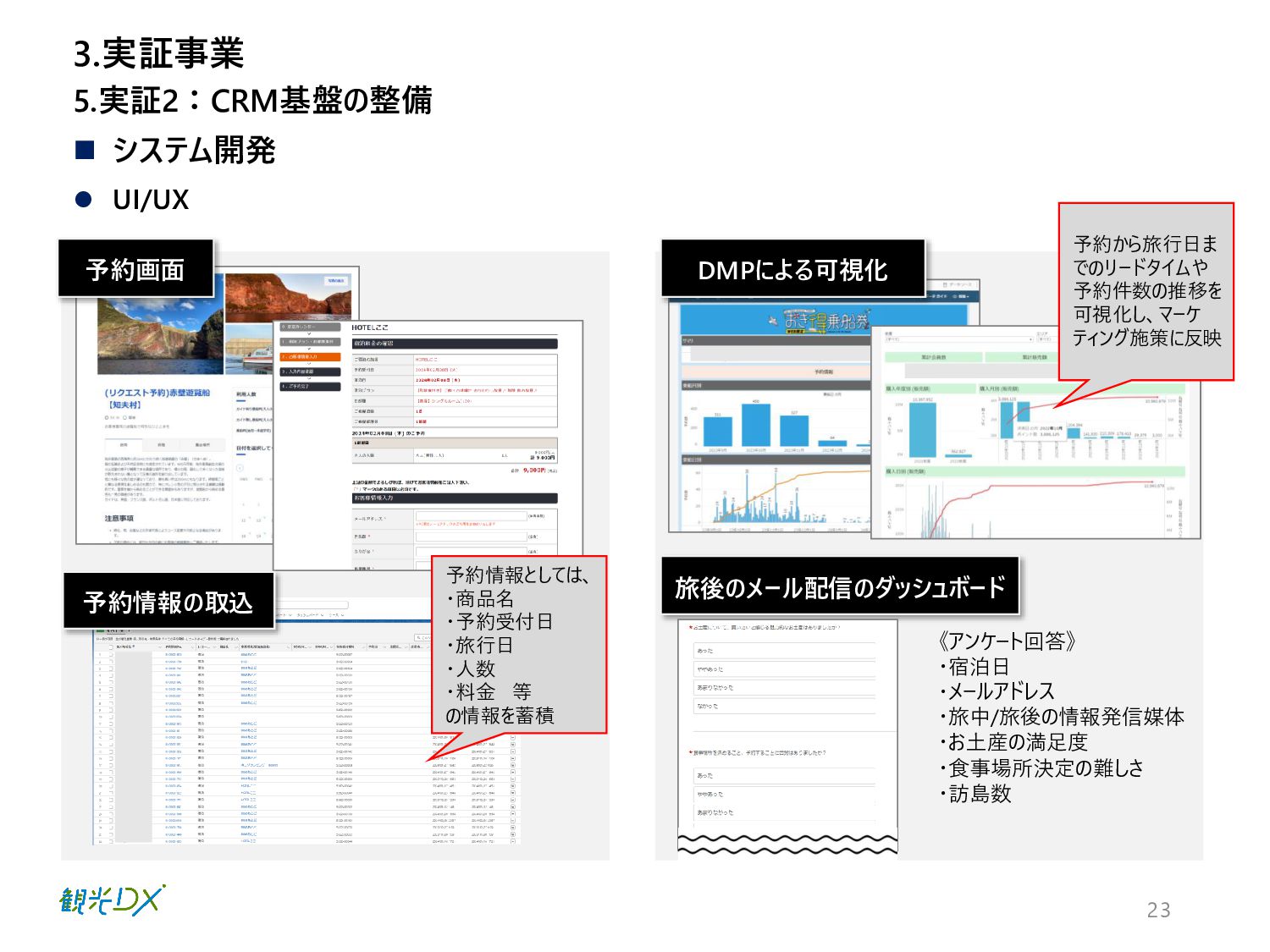 22 5.実証2:CRM基盤の整備 ⚫ システム構成 ⚫ コンセプト・機能概要 • 宿泊、体験、企画乗船券のそれぞれの顧 客・予約情報を一元管理 •