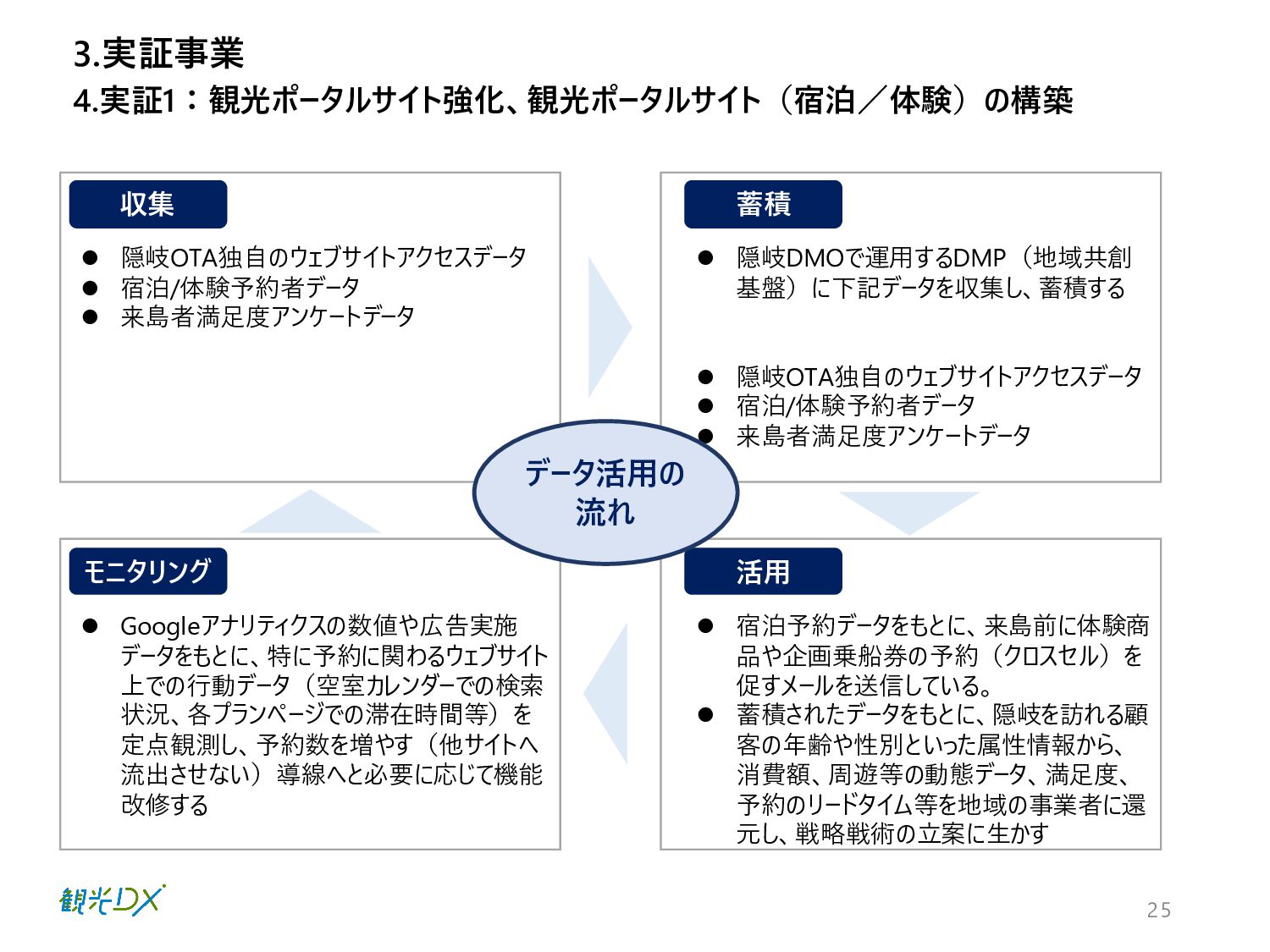 ⚫ 宿泊/体験予約者データ ⚫ 来島者満足度アンケートデータ ⚫ 宿泊予約データをもとに、来島前に体験商 品や企画乗船券の予約(クロスセル)を 促すメールを送信している。 ⚫ 蓄積されたデータをもとに、隠岐を訪れる顧 客の年齢や性別といった属性情報から、 消費額、周遊等の動態データ、満足度、 予約のリードタイム等を地域の事業者に還 元し、戦略戦術の立案に生かす ⚫ Googleアナリティクスの数値や広告実施 データをもとに、特に予約に関わるウェブサイト 上での行動データ(空室カレンダーでの検索 状況、各プランページでの滞在時間等)を 定点観測し、予約数を増やす(他サイトへ 流出させない)導線へと必要に応じて機能 改修する ⚫ 隠岐OTA独自のウェブサイトアクセスデータ ⚫ 宿泊/体験予約者データ ⚫ 来島者満足度アンケートデータ 4.実証1:観光ポータルサイト強化、観光ポータルサイト(宿泊/体験)の構築 データ活用の 流れ 3.実証事業