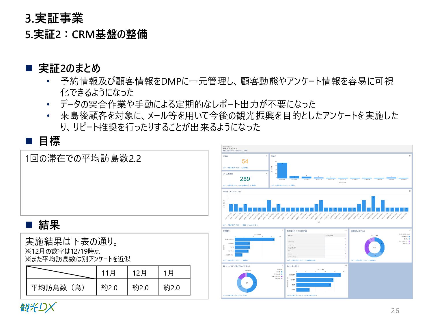 実証2のまとめ • 予約情報及び顧客情報をDMPに一元管理し、顧客動態やアンケート情報を容易に可視 化できるようになった • データの突合作業や手動による定期的なレポート出力が不要になった • 来島後顧客を対象に、メール等を用いて今後の観光振興を目的としたアンケートを実施した り、リピート推奨を行ったりすることが出来るようになった 5.実証2:CRM基盤の整備 3.実証事業 11月 12月 1月 平均訪島数(島) 約2.0 約2.0 約2.0