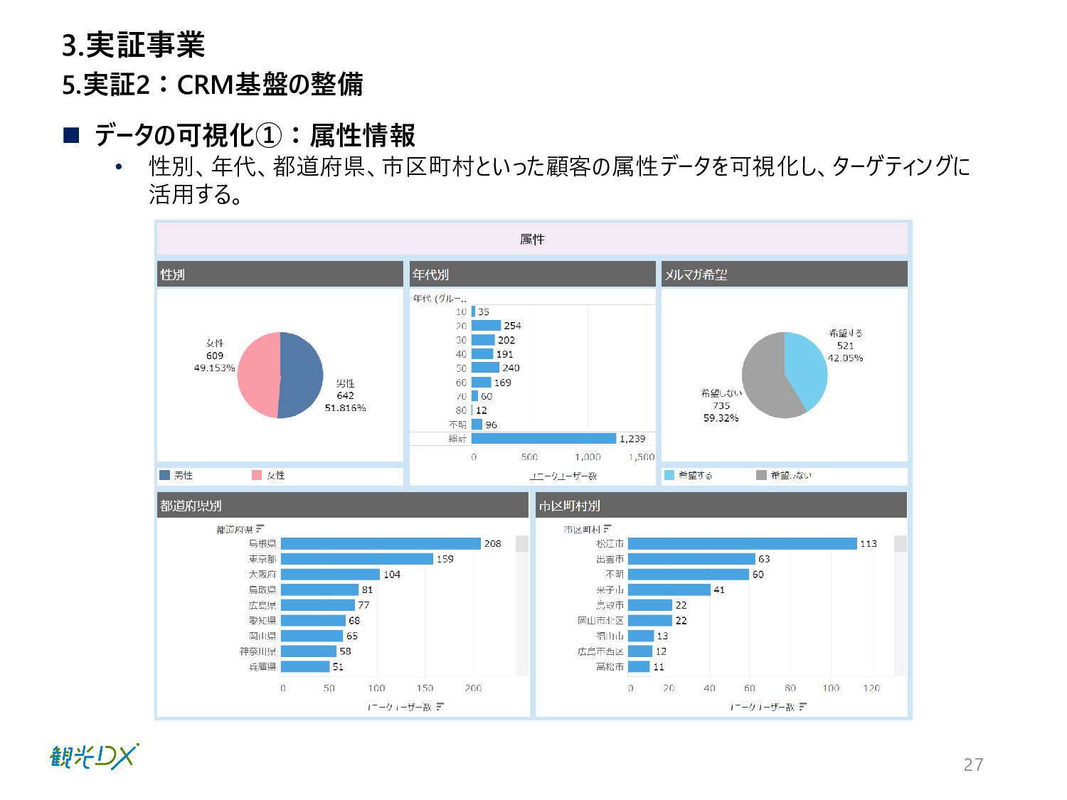 27 ◼ データの可視化①:属性情報 • 性別、年代、都道府県、市区町村といった顧客の属性データを可視化し、ターゲティングに 活用する。 5.実証2:CRM基盤の整備 3.実証事業