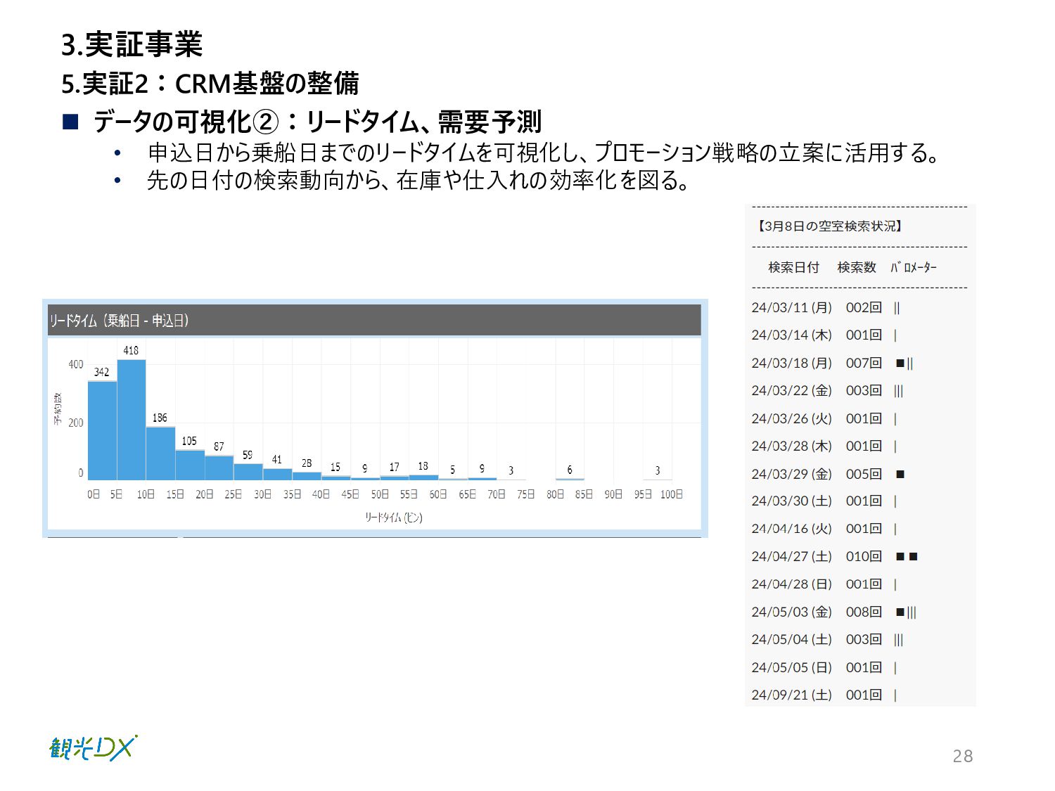 28 ◼ データの可視化②:リードタイム、需要予測 • 申込日から乗船日までのリードタイムを可視化し、プロモーション戦略の立案に活用する。 • 先の日付の検索動向から、在庫や仕入れの効率化を図る。 5.実証2:CRM基盤の整備 3.実証事業