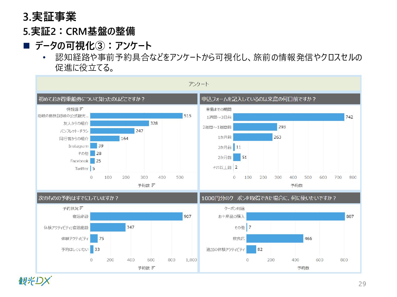 29 ◼ データの可視化③:アンケート • 認知経路や事前予約具合などをアンケートから可視化し、旅前の情報発信やクロスセルの 促進に役立てる。 5.実証2:CRM基盤の整備 3.実証事業