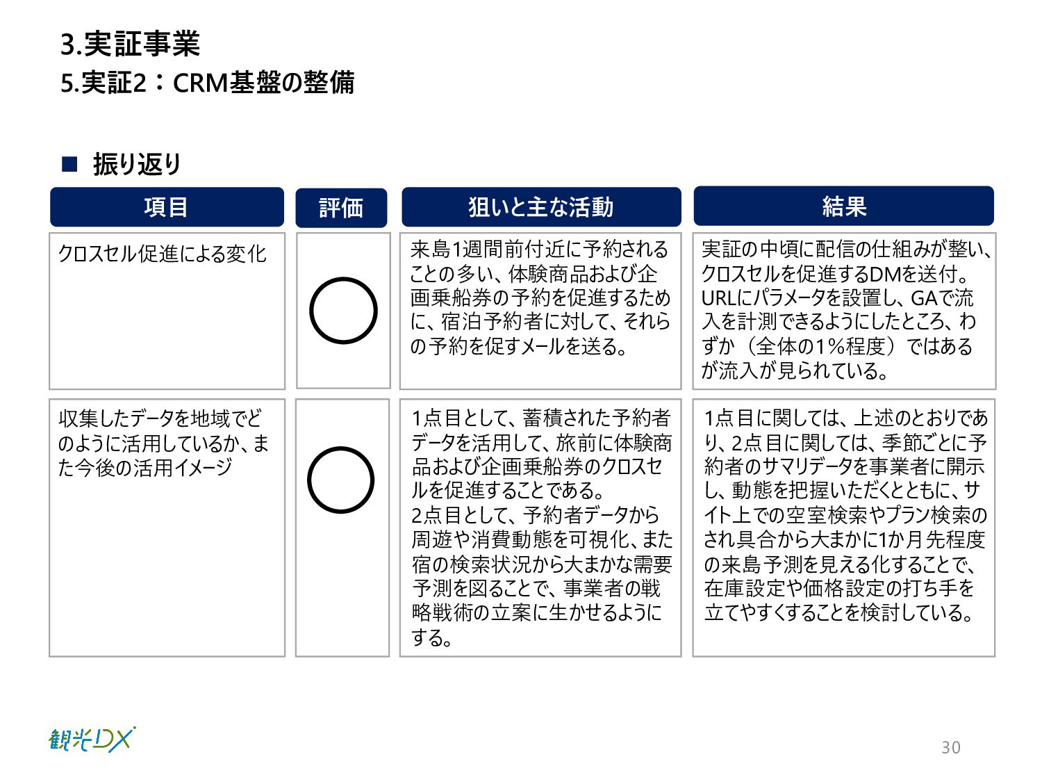 に、宿泊予約者に対して、それら の予約を促すメールを送る。 実証の中頃に配信の仕組みが整い、 クロスセルを促進するDMを送付。 URLにパラメータを設置し、GAで流 入を計測できるようにしたところ、わ ずか(全体の1%程度)ではある が流入が見られている。 クロスセル促進による変化 5.実証2:CRM基盤の整備 3.実証事業 収集したデータを地域でど のように活用しているか、ま た今後の活用イメージ 1点目として、蓄積された予約者 データを活用して、旅前に体験商 品および企画乗船券のクロスセ ルを促進することである。 2点目として、予約者データから 周遊や消費動態を可視化、また 宿の検索状況から大まかな需要 予測を図ることで、事業者の戦 略戦術の立案に生かせるように する。 1点目に関しては、上述のとおりであ り、2点目に関しては、季節ごとに予 約者のサマリデータを事業者に開示 し、動態を把握いただくとともに、サ イト上での空室検索やプラン検索の され具合から大まかに1か月先程度 の来島予測を見える化することで、 在庫設定や価格設定の打ち手を 立てやすくすることを検討している。