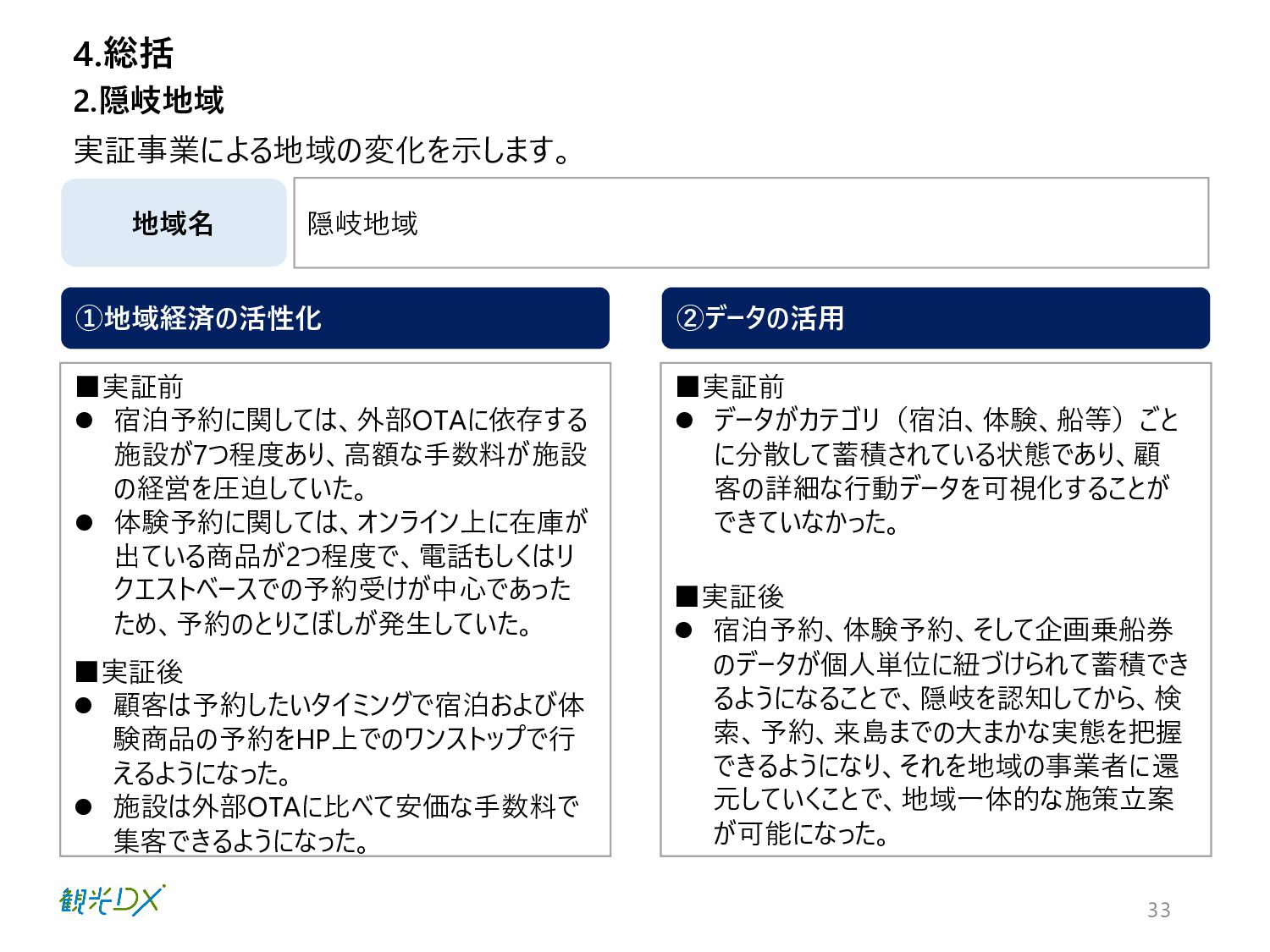 ⚫ 体験予約に関しては、オンライン上に在庫が 出ている商品が2つ程度で、電話もしくはリ クエストベースでの予約受けが中心であった ため、予約のとりこぼしが発生していた。 ▪実証後 ⚫ 顧客は予約したいタイミングで宿泊および体 験商品の予約をHP上でのワンストップで行 えるようになった。 ⚫ 施設は外部OTAに比べて安価な手数料で 集客できるようになった。 ▪実証前 ⚫ データがカテゴリ(宿泊、体験、船等)ごと に分散して蓄積されている状態であり、顧 客の詳細な行動データを可視化することが できていなかった。 ▪実証後 ⚫ 宿泊予約、体験予約、そして企画乗船券 のデータが個人単位に紐づけられて蓄積でき るようになることで、隠岐を認知してから、検 索、予約、来島までの大まかな実態を把握 できるようになり、それを地域の事業者に還 元していくことで、地域一体的な施策立案 が可能になった。 4.総括 隠岐地域 2.隠岐地域