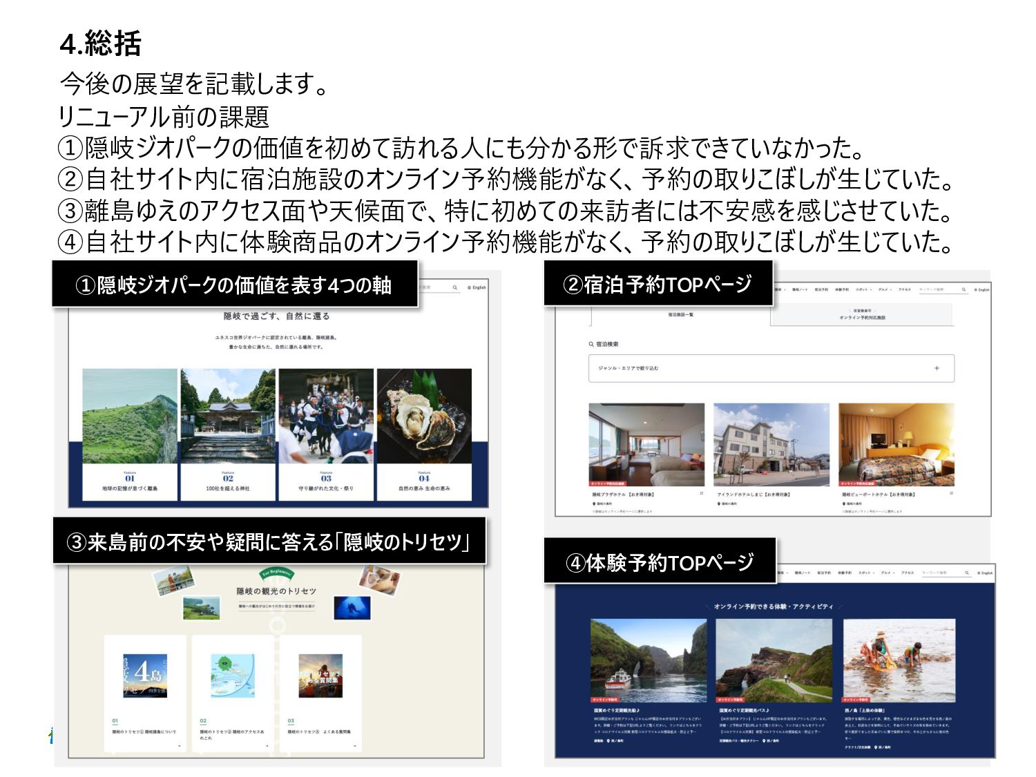 ③離島ゆえのアクセス面や天候面で、特に初めての来訪者には不安感を感じさせていた。 ④自社サイト内に体験商品のオンライン予約機能がなく、予約の取りこぼしが生じていた。