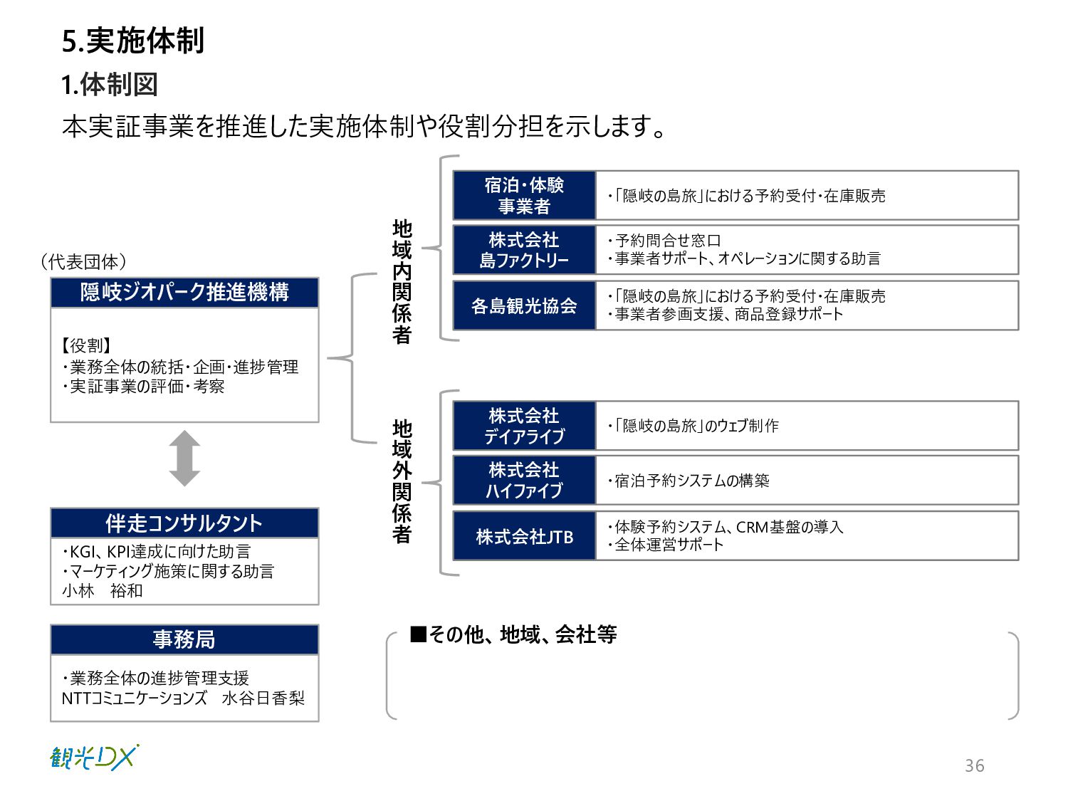 本実証事業を推進した実施体制や役割分担を示します。 1.体制図 5.実施体制 36 【役割】 ・業務全体の統括・企画・進捗管理 ・実証事業の評価・考察 隠岐ジオパーク推進機構 (代表団体) ▪その他、地域、会社等