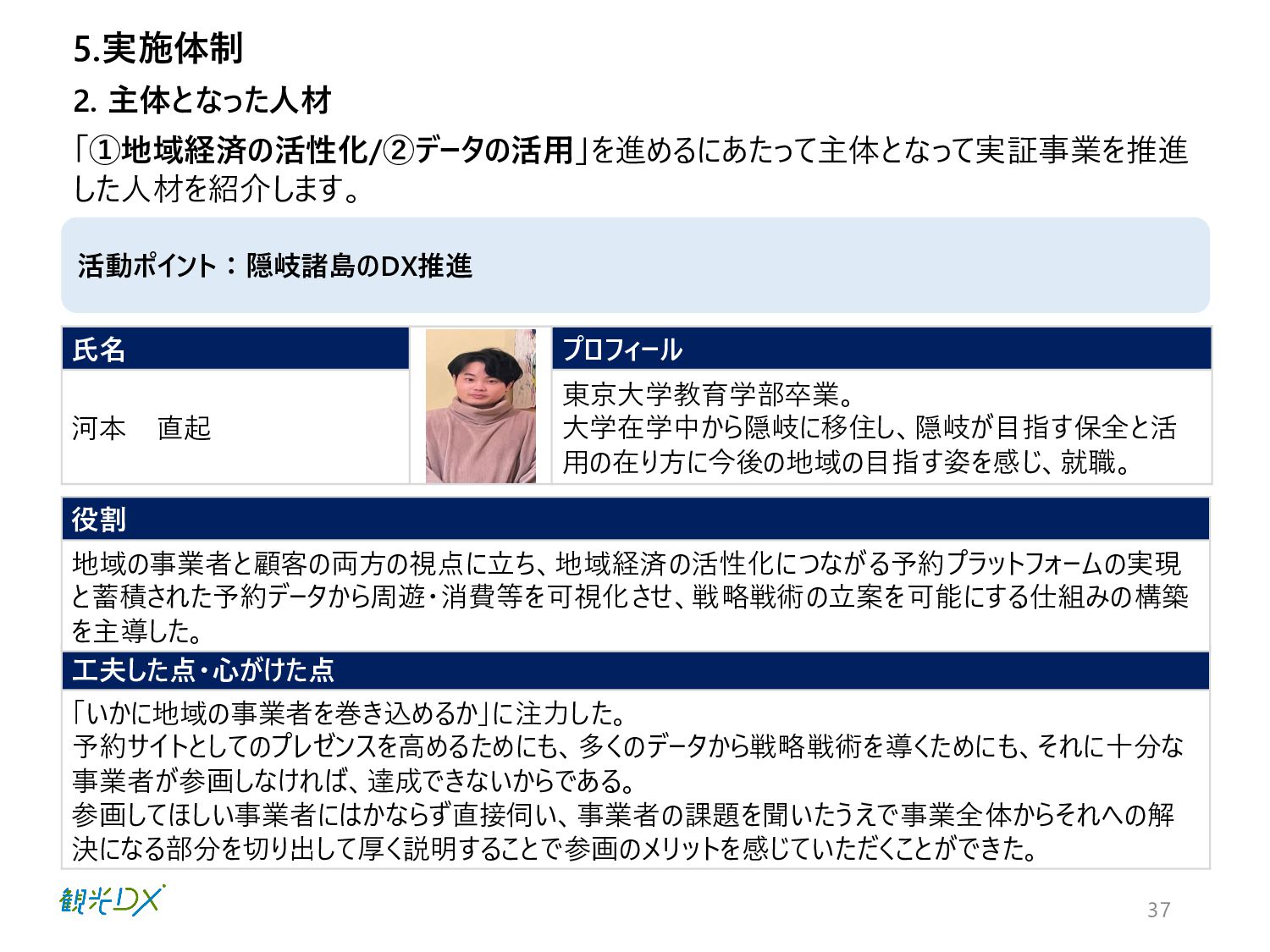 写真 プロフィール 河本 直起 東京大学教育学部卒業。 大学在学中から隠岐に移住し、隠岐が目指す保全と活 用の在り方に今後の地域の目指す姿を感じ、就職。 5.実施体制 活動ポイント:隠岐諸島のDX推進 役割 地域の事業者と顧客の両方の視点に立ち、地域経済の活性化につながる予約プラットフォームの実現 と蓄積された予約データから周遊・消費等を可視化させ、戦略戦術の立案を可能にする仕組みの構築 を主導した。 写真 2. 主体となった人材