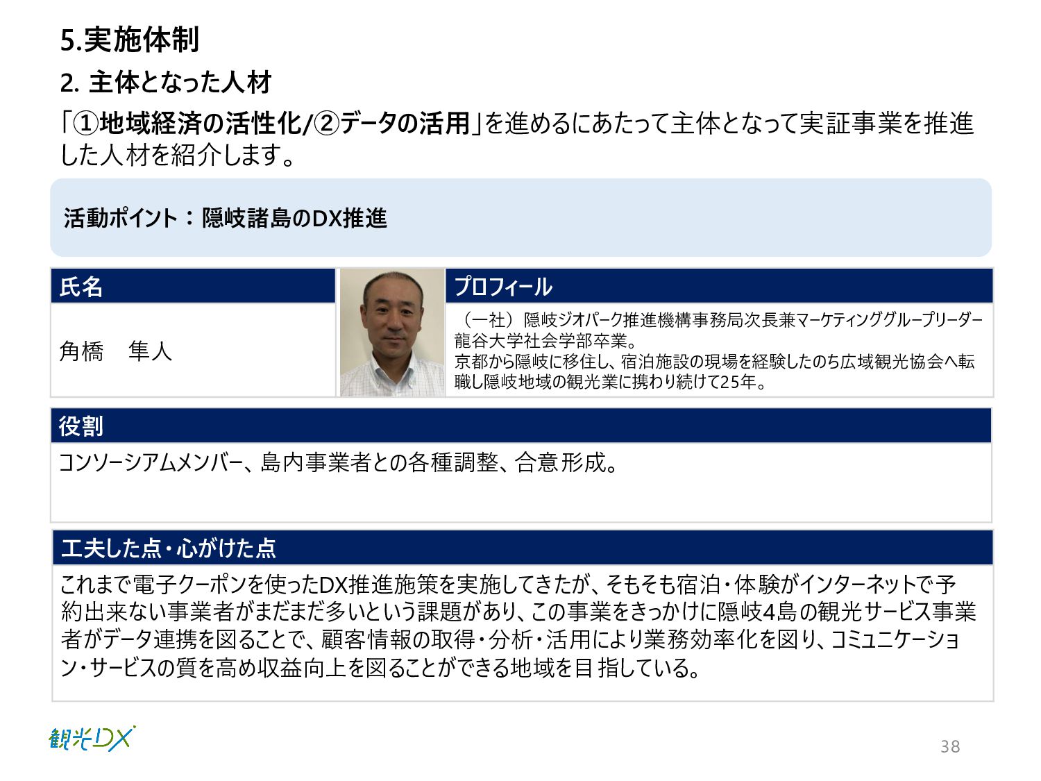 工夫した点・心がけた点 これまで電子クーポンを使ったDX推進施策を実施してきたが、そもそも宿泊・体験がインターネットで予 約出来ない事業者がまだまだ多いという課題があり、この事業をきっかけに隠岐4島の観光サービス事業 者がデータ連携を図ることで、顧客情報の取得・分析・活用により業務効率化を図り、コミュニケーショ ン・サービスの質を高め収益向上を図ることができる地域を目指している。 「①地域経済の活性化/②データの活用」を進めるにあたって主体となって実証事業を推進 した人材を紹介します。 38 氏名 写真