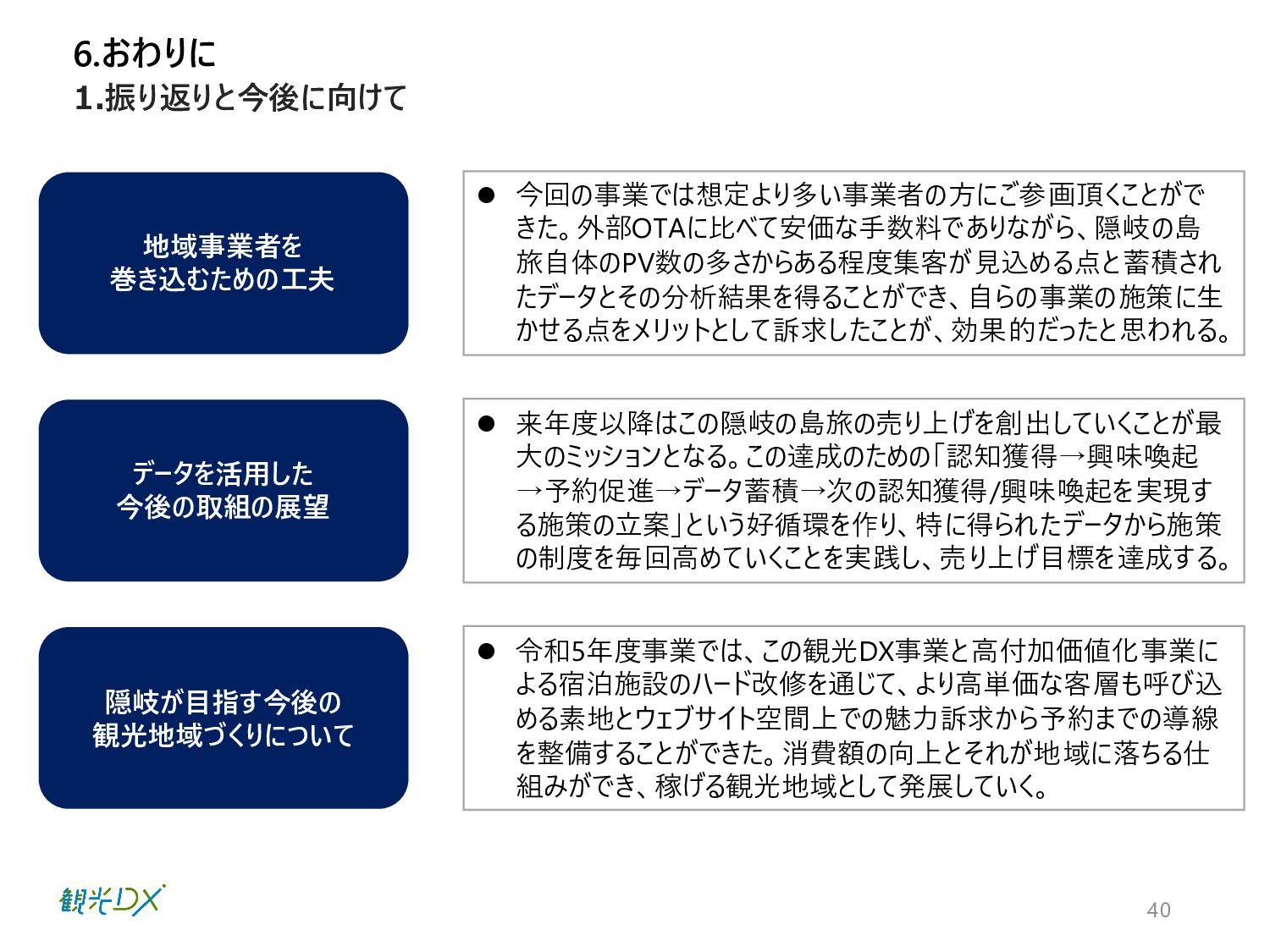 1.振り返りと今後に向けて データを活用した 今後の取組の展望 隠岐が目指す今後の 観光地域づくりについて ⚫ 来年度以降はこの隠岐の島旅の売り上げを創出していくことが最 大のミッションとなる。この達成のための「認知獲得→興味喚起 →予約促進→データ蓄積→次の認知獲得/興味喚起を実現す る施策の立案」という好循環を作り、特に得られたデータから施策 の制度を毎回高めていくことを実践し、売り上げ目標を達成する。 ⚫ 令和5年度事業では、この観光DX事業と高付加価値化事業に よる宿泊施設のハード改修を通じて、より高単価な客層も呼び込 める素地とウェブサイト空間上での魅力訴求から予約までの導線 を整備することができた。消費額の向上とそれが地域に落ちる仕 組みができ、稼げる観光地域として発展していく。