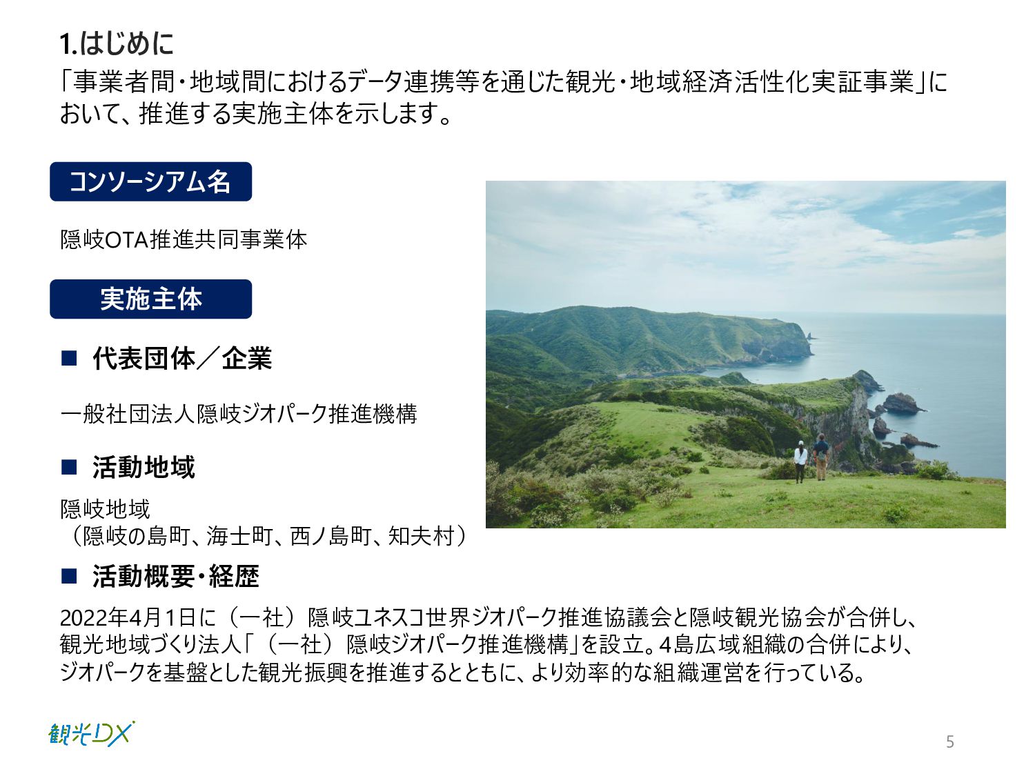 5 「事業者間・地域間におけるデータ連携等を通じた観光・地域経済活性化実証事業」に おいて、推進する実施主体を示します。 実施主体 隠岐OTA推進共同事業体 隠岐地域 (隠岐の島町、海士町、西ノ島町、知夫村) ◼ 代表団体/企業 ◼