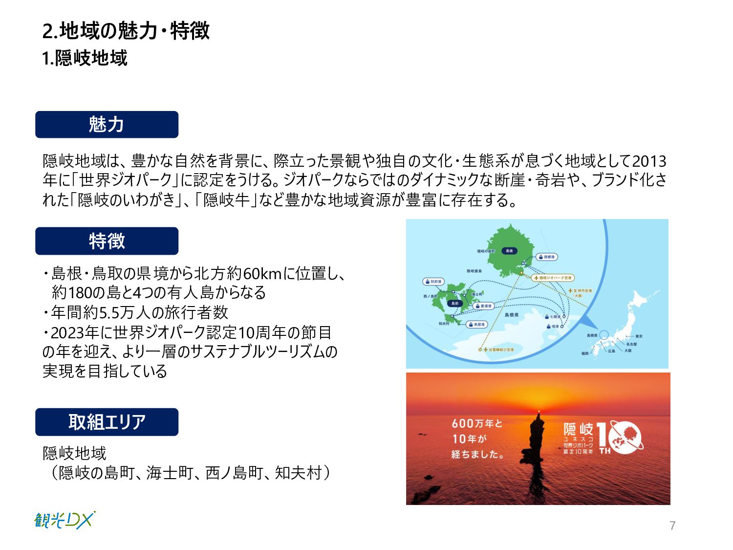 2.地域の魅力・特徴 1.隠岐地域 7 ・島根・鳥取の県境から北方約60kmに位置し、 約180の島と4つの有人島からなる ・年間約5.5万人の旅行者数 ・2023年に世界ジオパーク認定10周年の節目 の年を迎え、より一層のサステナブルツーリズムの 実現を目指している 隠岐地域は、豊かな自然を背景に、際立った景観や独自の文化・生態系が息づく地域として2013
