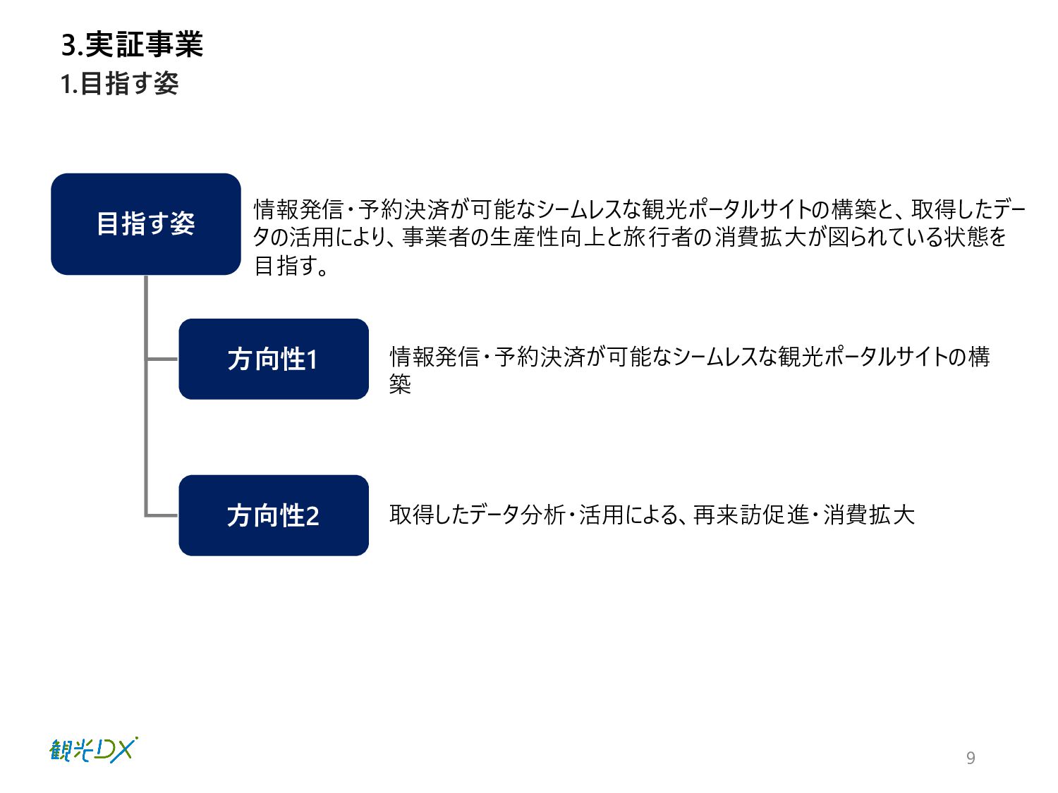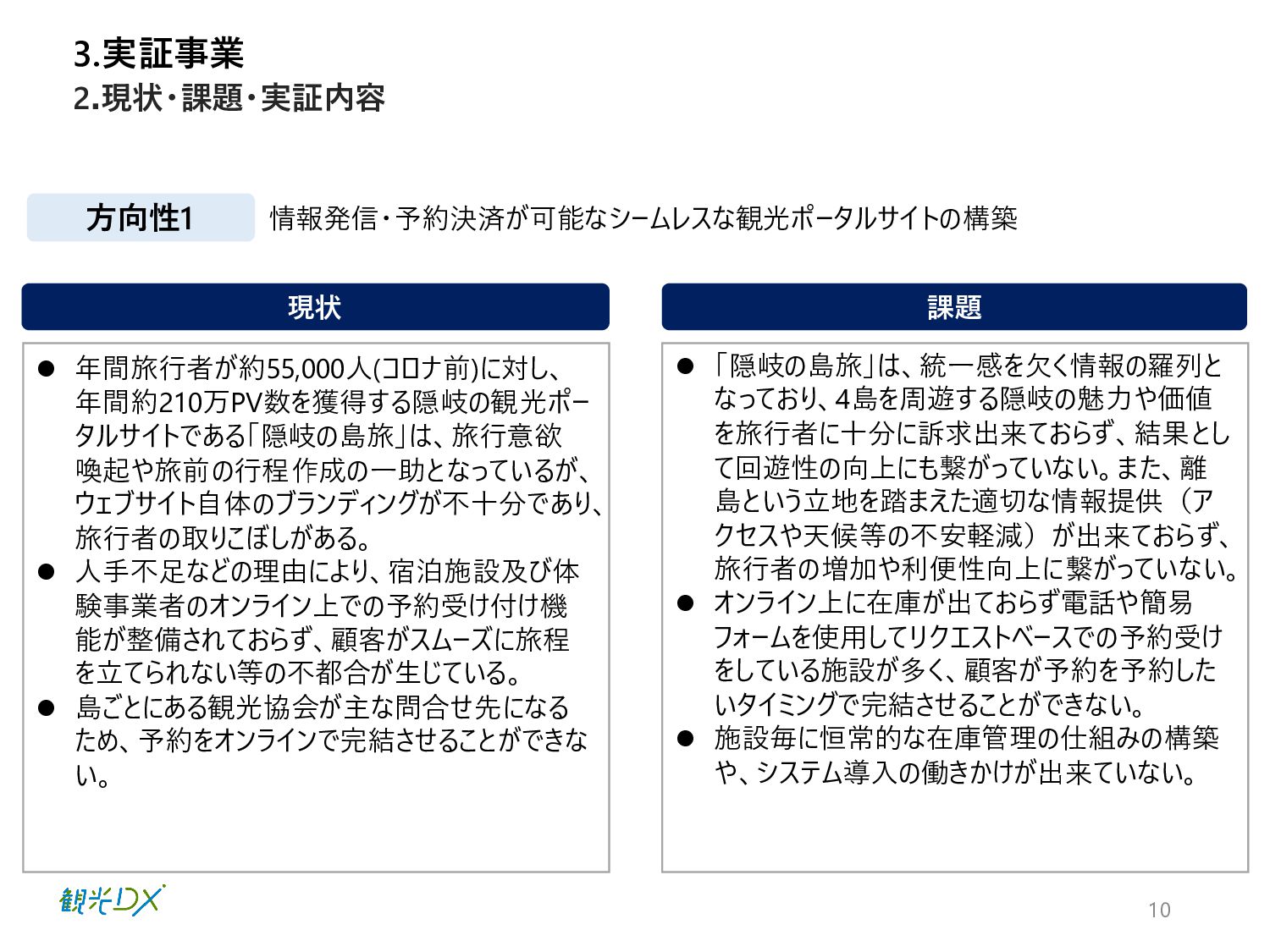 9 3.実証事業 1.目指す姿 目指す姿 方向性1 方向性2 情報発信・予約決済が可能なシームレスな観光ポータルサイトの構築と、取得したデー タの活用により、事業者の生産性向上と旅行者の消費拡大が図られている状態を 目指す。 情報発信・予約決済が可能なシームレスな観光ポータルサイトの構