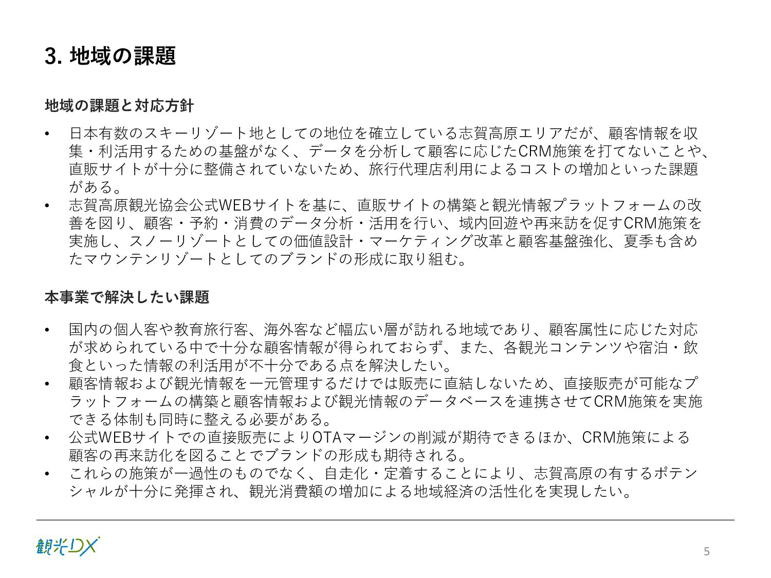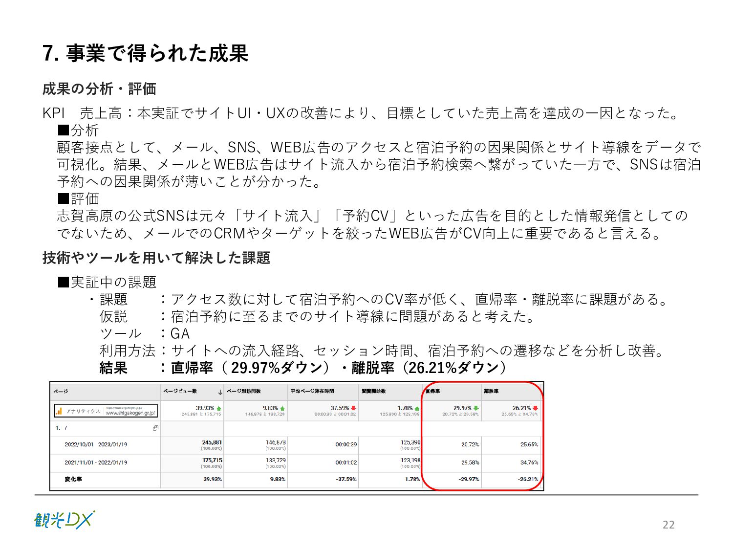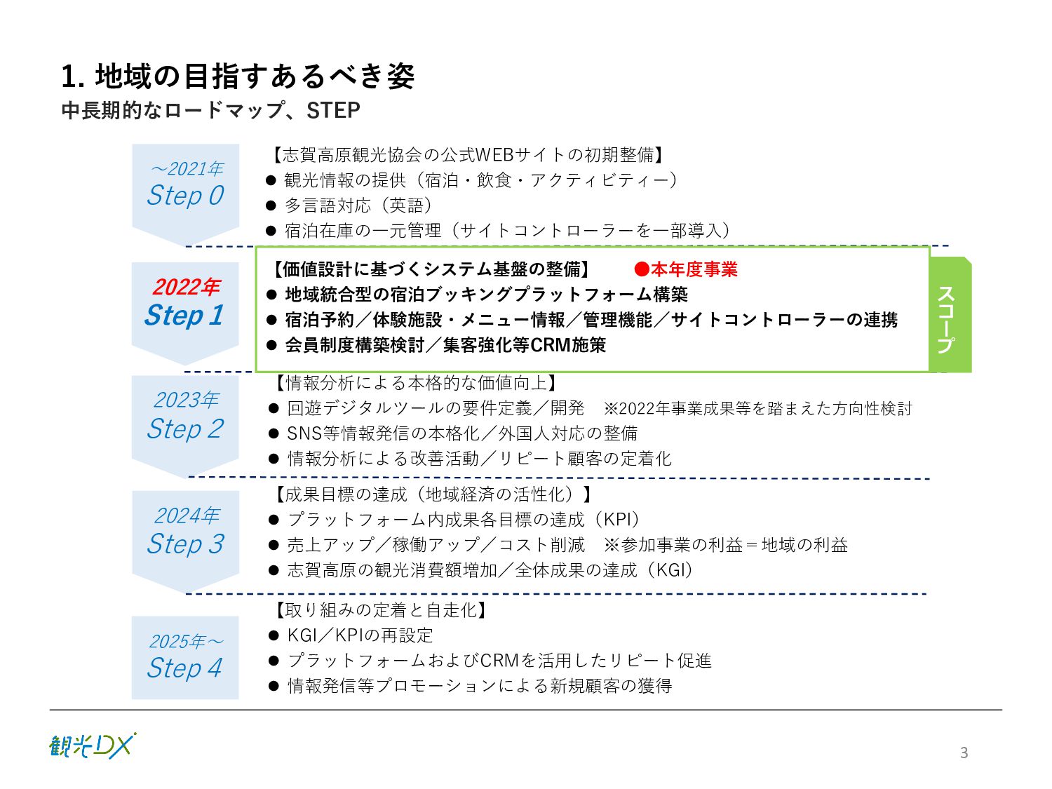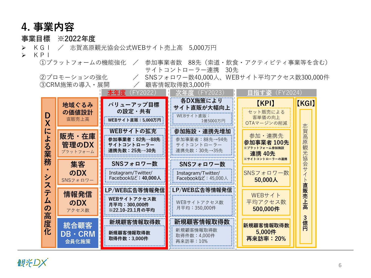 KPI ①プラットフォームの機能強化 / 参加事業者数 88先(索道・飲食・アクティビティ事業等を含む) サイトコントローラー連携 30先 ②プロモーションの強化 / SNSフォロワー数40,000人、WEBサイト平均アクセス数300,000件 ③CRM施策の導入・展開 / 顧客情報取得数3,000件 6 販売・在庫 管理のDX プラットフォーム 集客 のDX SNSフォロワー 情報発信 のDX アクセス数 統合顧客 DB・CRM 会員化施策 地域ぐるみ の価値設計 直販売上高 D X に よ る 業 務 ・ シ ス テ ム の 高 度 化 バリューアップ目標 の設定・共有 本年度(FY2022) 次年度(FY2023) 【KPI】 【KGI】 参加・連携先 参加事業者 100先 ※プラットフォーム参加施設 連携 40先 ※サイトコントローラーの連携 新規顧客情報取得数 5,000件 再来訪率:20% WEBサイト 平均アクセス数 500,000件 SNSフォロワー数 50,000人 志 賀 高 原 観 光 協 会 サ イ ト 直 販 売 上 高 3 億 円 目指す姿(FY2024) 各DX施策により サイト直販が大幅向上 WEBサイトの拡充 SNSフォロワー数 参加事業者:82先→88先 サイトコントローラー 連携先数:25先→30先 新規顧客情報取得数 新規顧客情報取得数 取得件数:3,000件 WEBサイト直販:5,000万円 WEBサイト直販: 1億5000万円 LP/WEB広告等情報発信 WEBサイトアクセス数 月平均:300,000件 ※22.10-23.1月の平均 参加施設・連携先増加 参加事業者:88先→94先 サイトコントローラー 連携先数:30先→35先 新規顧客情報取得数 新規顧客情報取得数 取得件数:4,000件 再来訪率:10% LP/WEB広告等情報発信 WEBサイトアクセス数 月平均:350,000件 Instagram/Twitter/ Facebookなど:40,000人 SNSフォロワー数 セット販売による 客単価の向上 OTAマージンの削減 Instagram/Twitter/ Facebookなど:45,000人