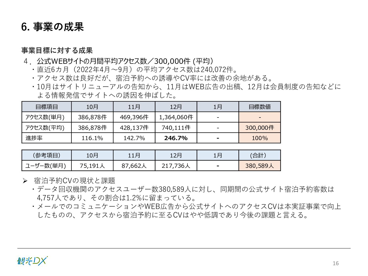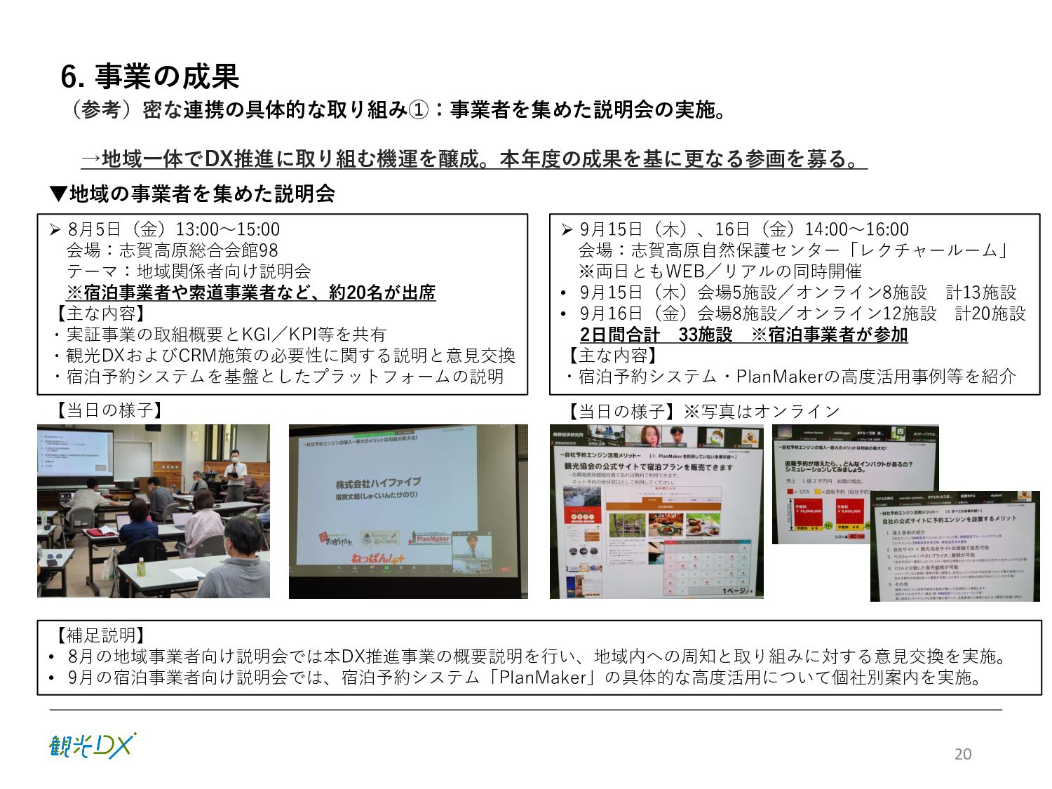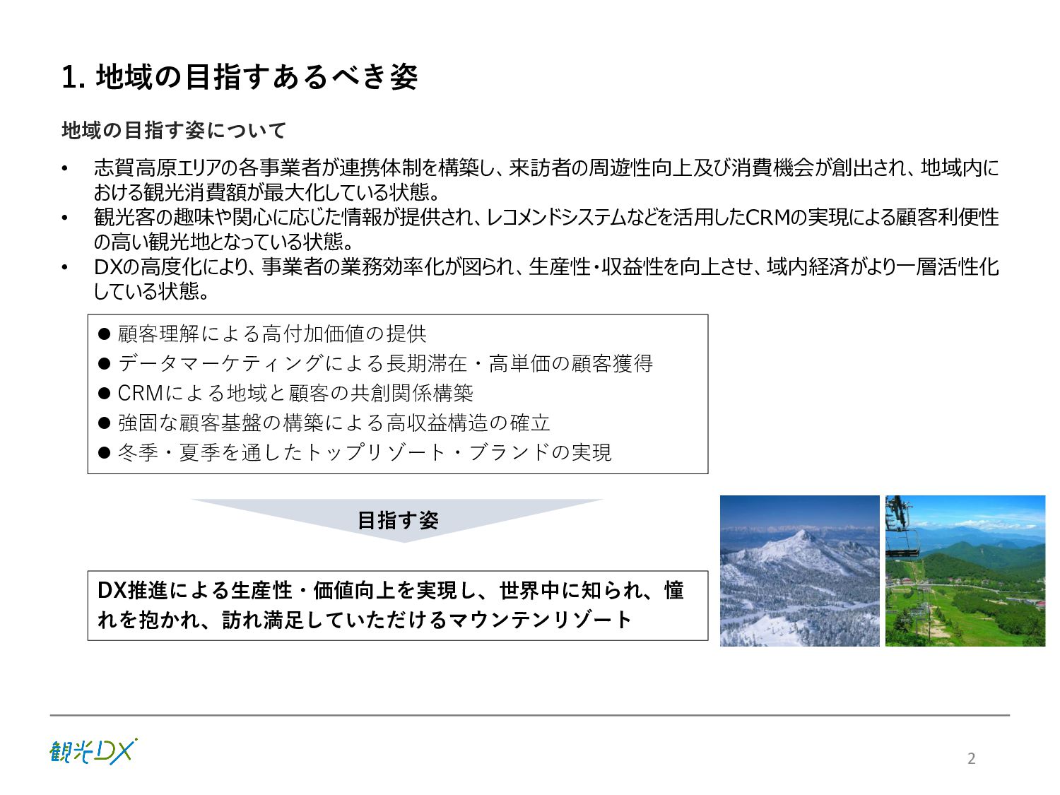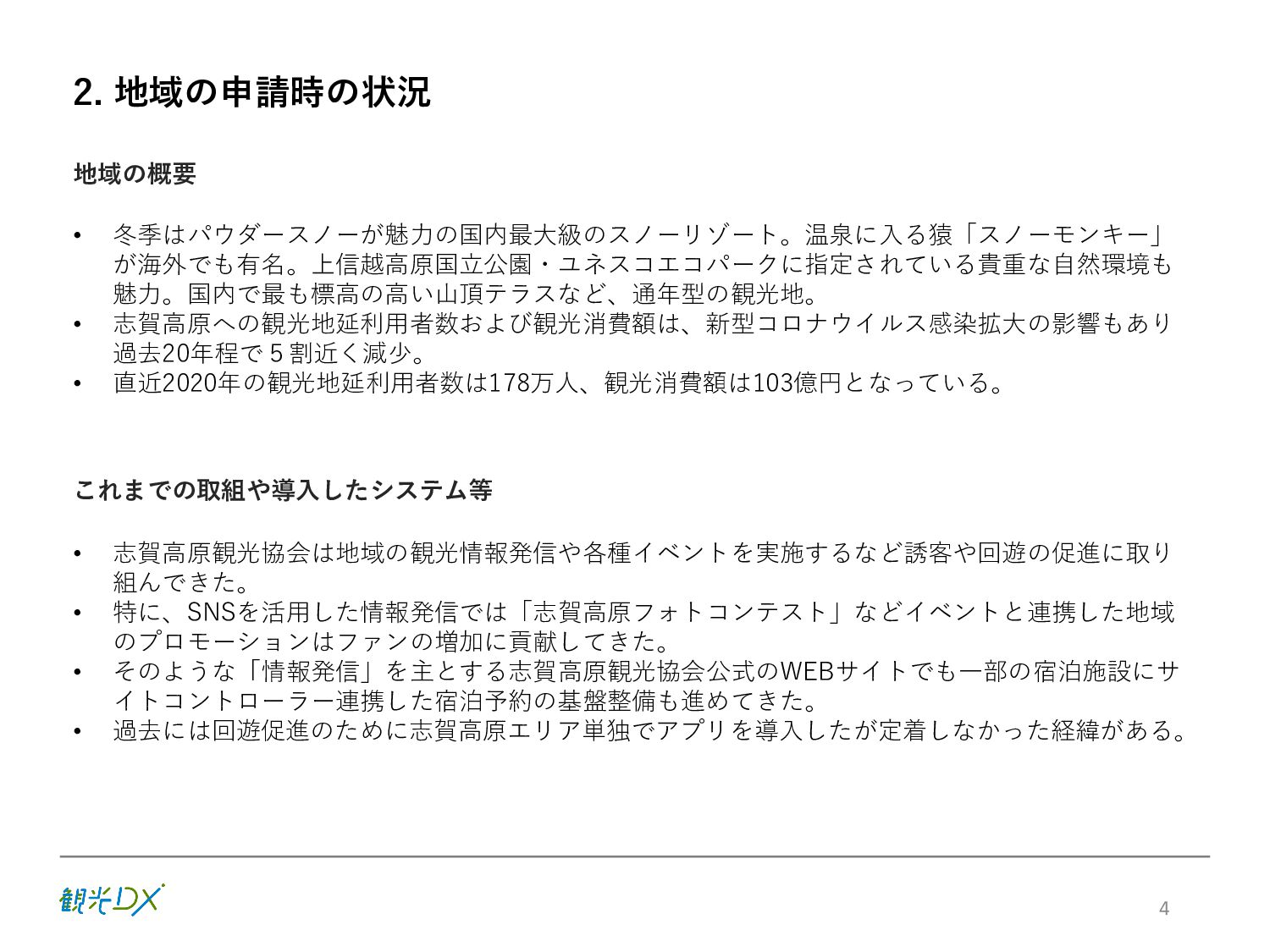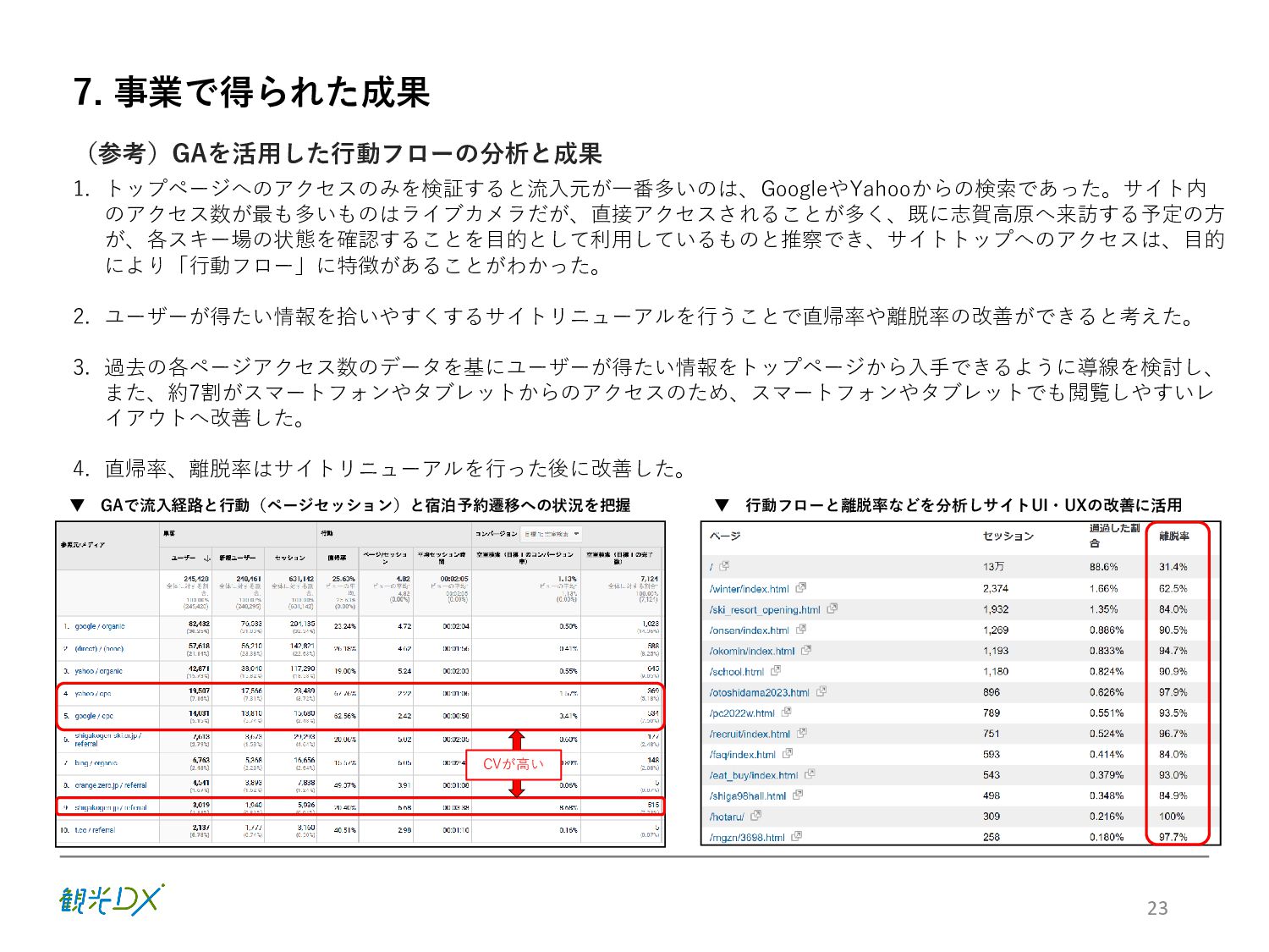 KPI ①プラットフォームの機能強化 / 参加事業者数 88先(索道・飲食・アクティビティ事業等を含む) サイトコントローラー連携 30先 ②プロモーションの強化 / SNSフォロワー数40,000人、WEBサイト平均アクセス数300,000件 ③CRM施策の導入・展開 / 顧客情報取得数3,000件 6 販売・在庫 管理のDX プラットフォーム 集客 のDX SNSフォロワー 情報発信 のDX アクセス数 統合顧客 DB・CRM 会員化施策 地域ぐるみ の価値設計 直販売上高 D X に よ る 業 務 ・ シ ス テ ム の 高 度 化 バリューアップ目標 の設定・共有 本年度(FY2022) 次年度(FY2023) 【KPI】 【KGI】 参加・連携先 参加事業者 100先 ※プラットフォーム参加施設 連携 40先 ※サイトコントローラーの連携 新規顧客情報取得数 5,000件 再来訪率:20% WEBサイト 平均アクセス数 500,000件 SNSフォロワー数 50,000人 志 賀 高 原 観 光 協 会 サ イ ト 直 販 売 上 高 3 億 円 目指す姿(FY2024) 各DX施策により サイト直販が大幅向上 WEBサイトの拡充 SNSフォロワー数 参加事業者:82先→88先 サイトコントローラー 連携先数:25先→30先 新規顧客情報取得数 新規顧客情報取得数 取得件数:3,000件 WEBサイト直販:5,000万円 WEBサイト直販: 1億5000万円 LP/WEB広告等情報発信 WEBサイトアクセス数 月平均:300,000件 ※22.10-23.1月の平均 参加施設・連携先増加 参加事業者:88先→94先 サイトコントローラー 連携先数:30先→35先 新規顧客情報取得数 新規顧客情報取得数 取得件数:4,000件 再来訪率:10% LP/WEB広告等情報発信 WEBサイトアクセス数 月平均:350,000件 Instagram/Twitter/ Facebookなど:40,000人 SNSフォロワー数 セット販売による 客単価の向上 OTAマージンの削減 Instagram/Twitter/ Facebookなど:45,000人