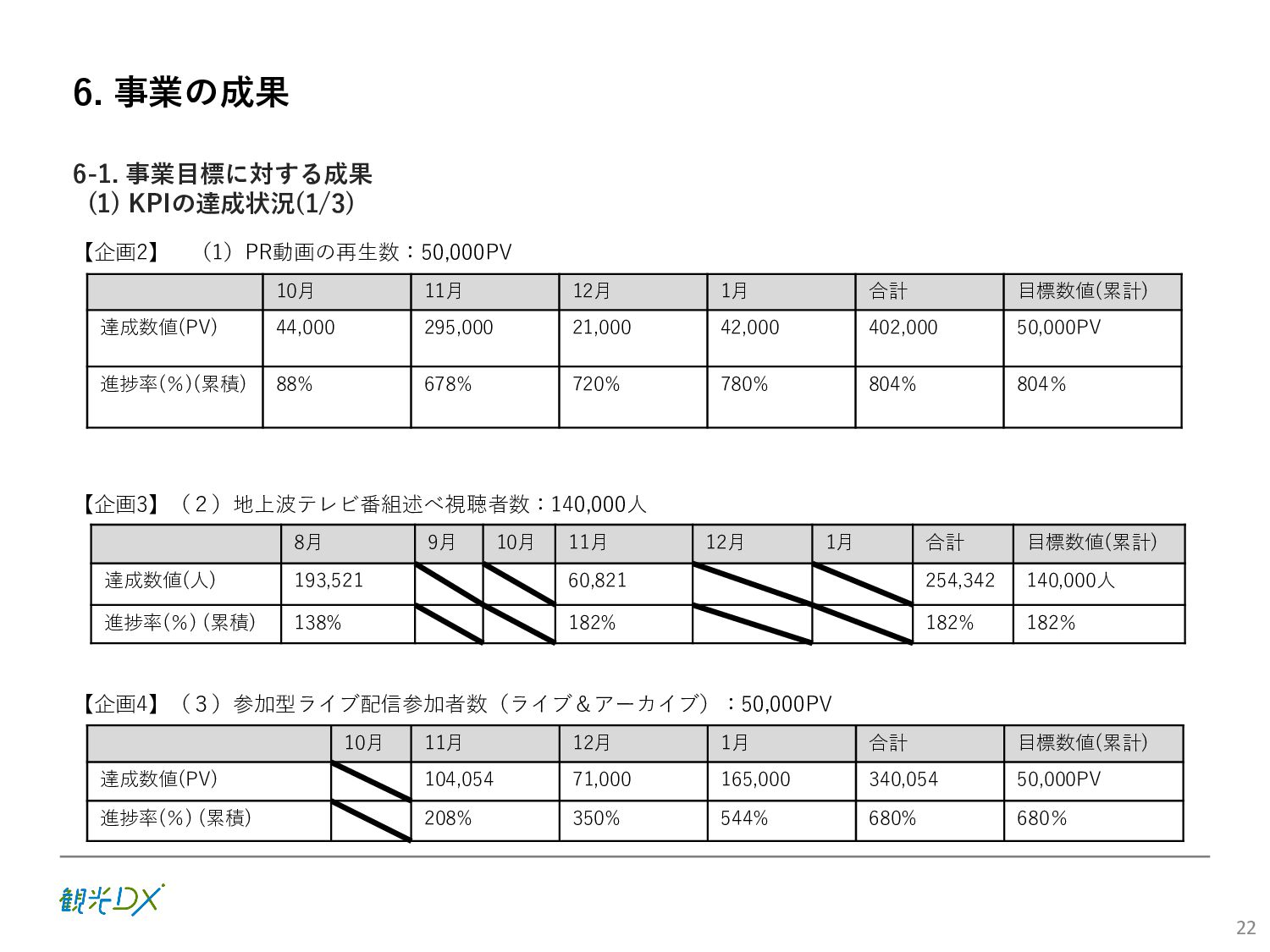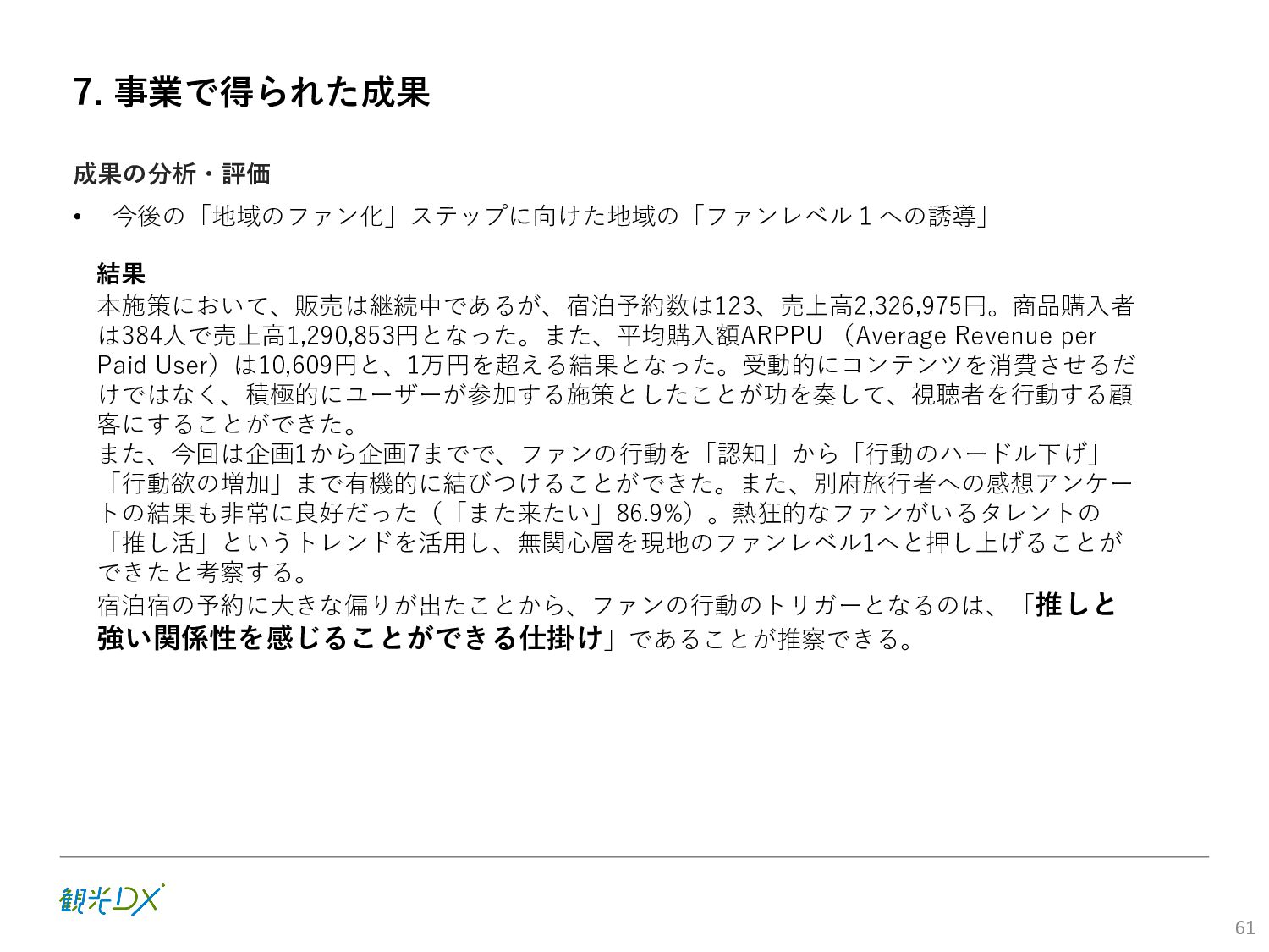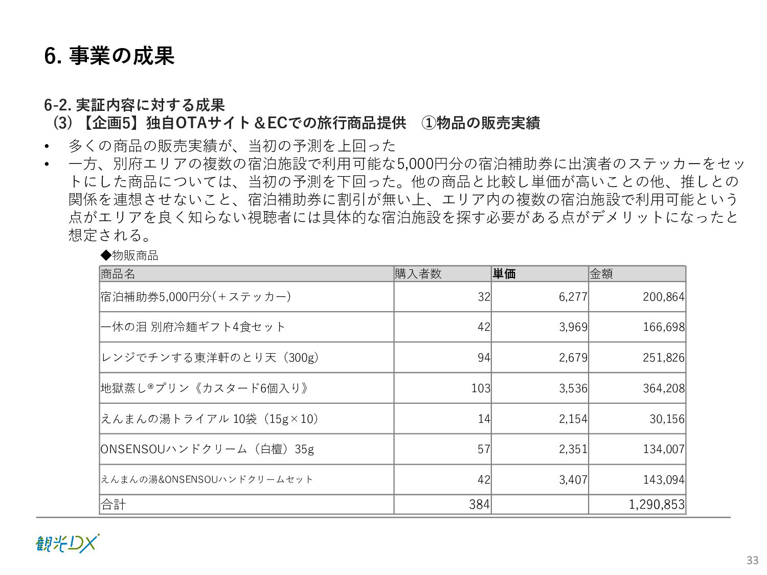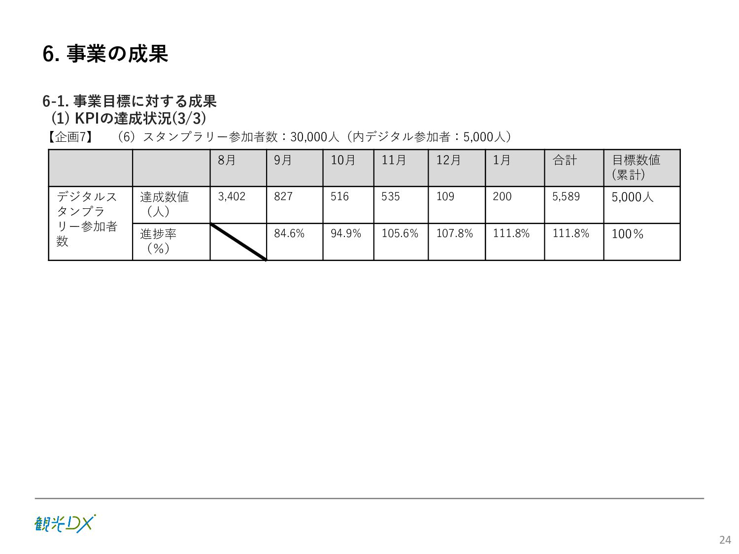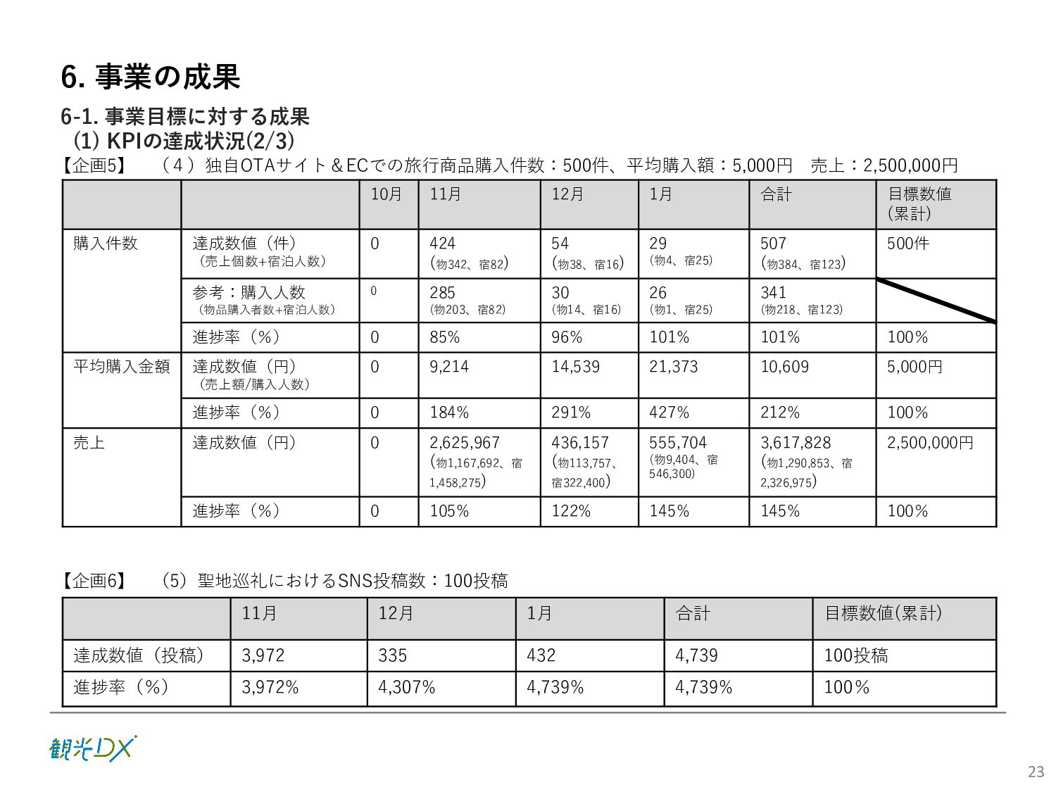 (5)聖地巡礼におけるSNS投稿数:100投稿 10月 11月 12月 1月 合計 目標数値 (累計) 購入件数 達成数値(件) (売上個数+宿泊人数) 0 424 (物342、宿82) 54 (物38、宿16) 29 (物4、宿25) 507 (物384、宿123) 500件 参考:購入人数 (物品購入者数+宿泊人数) 0 285 (物203、宿82) 30 (物14、宿16) 26 (物1、宿25) 341 (物218、宿123) 進捗率(%) 0 85% 96% 101% 101% 100% 平均購入⾦額 達成数値(円) (売上額/購入人数) 0 9,214 14,539 21,373 10,609 5,000円 進捗率(%) 0 184% 291% 427% 212% 100% 売上 達成数値(円) 0 2,625,967 (物1,167,692、宿 1,458,275) 436,157 (物113,757、 宿322,400) 555,704 (物9,404、宿 546,300) 3,617,828 (物1,290,853、宿 2,326,975) 2,500,000円 進捗率(%) 0 105% 122% 145% 145% 100% 11月 12月 1月 合計 目標数値(累計) 達成数値(投稿) 3,972 335 432 4,739 100投稿 進捗率(%) 3,972% 4,307% 4,739% 4,739% 100% 23