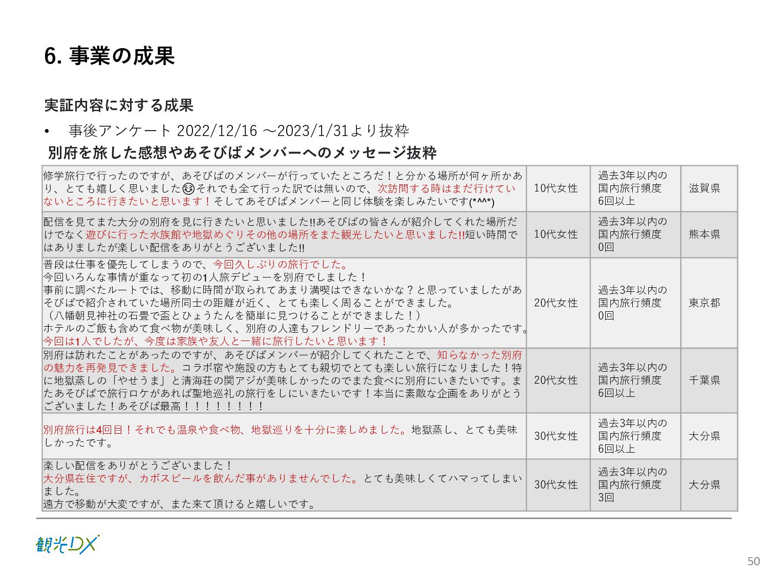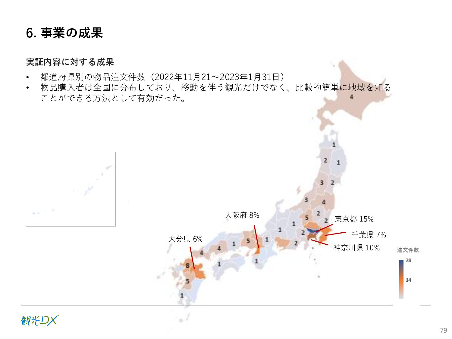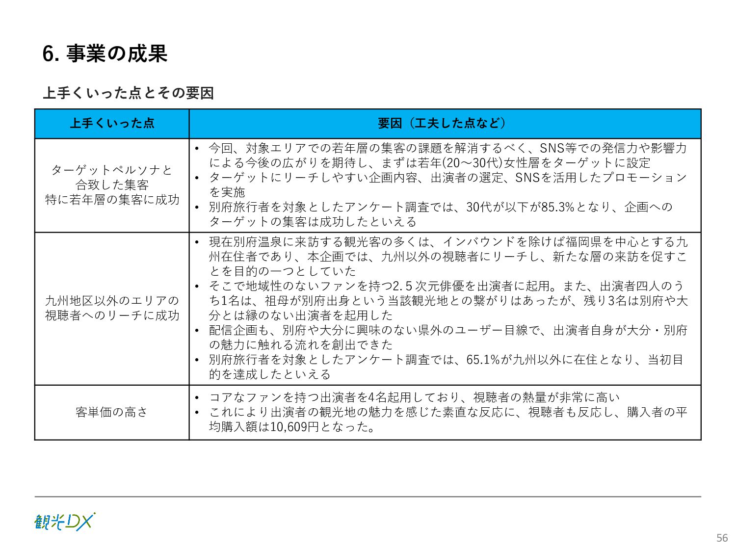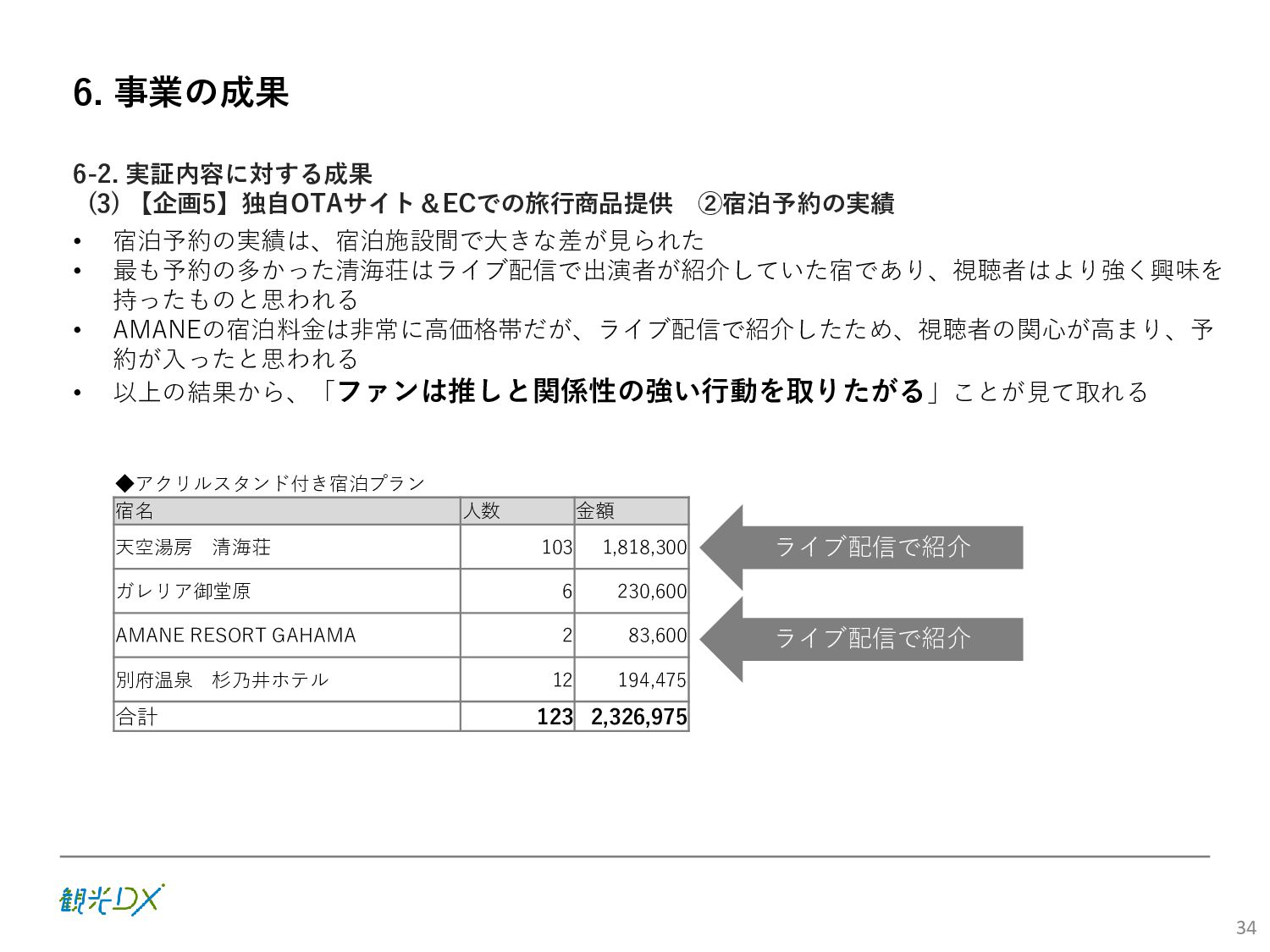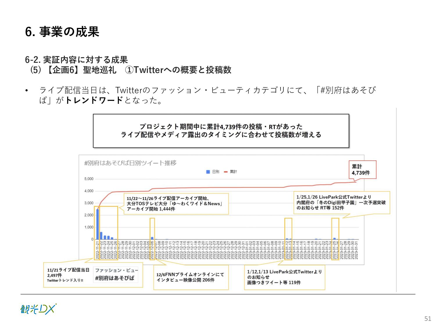 (5)聖地巡礼におけるSNS投稿数:100投稿 10月 11月 12月 1月 合計 目標数値 (累計) 購入件数 達成数値(件) (売上個数+宿泊人数) 0 424 (物342、宿82) 54 (物38、宿16) 29 (物4、宿25) 507 (物384、宿123) 500件 参考:購入人数 (物品購入者数+宿泊人数) 0 285 (物203、宿82) 30 (物14、宿16) 26 (物1、宿25) 341 (物218、宿123) 進捗率(%) 0 85% 96% 101% 101% 100% 平均購入⾦額 達成数値(円) (売上額/購入人数) 0 9,214 14,539 21,373 10,609 5,000円 進捗率(%) 0 184% 291% 427% 212% 100% 売上 達成数値(円) 0 2,625,967 (物1,167,692、宿 1,458,275) 436,157 (物113,757、 宿322,400) 555,704 (物9,404、宿 546,300) 3,617,828 (物1,290,853、宿 2,326,975) 2,500,000円 進捗率(%) 0 105% 122% 145% 145% 100% 11月 12月 1月 合計 目標数値(累計) 達成数値(投稿) 3,972 335 432 4,739 100投稿 進捗率(%) 3,972% 4,307% 4,739% 4,739% 100% 23