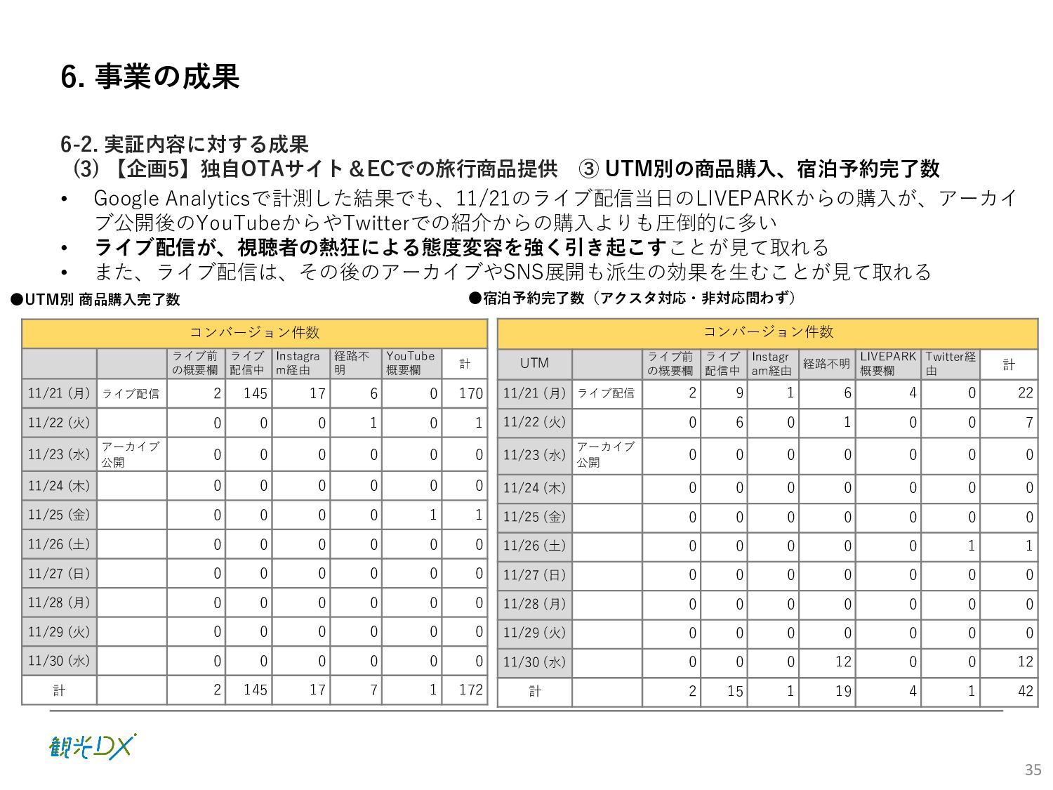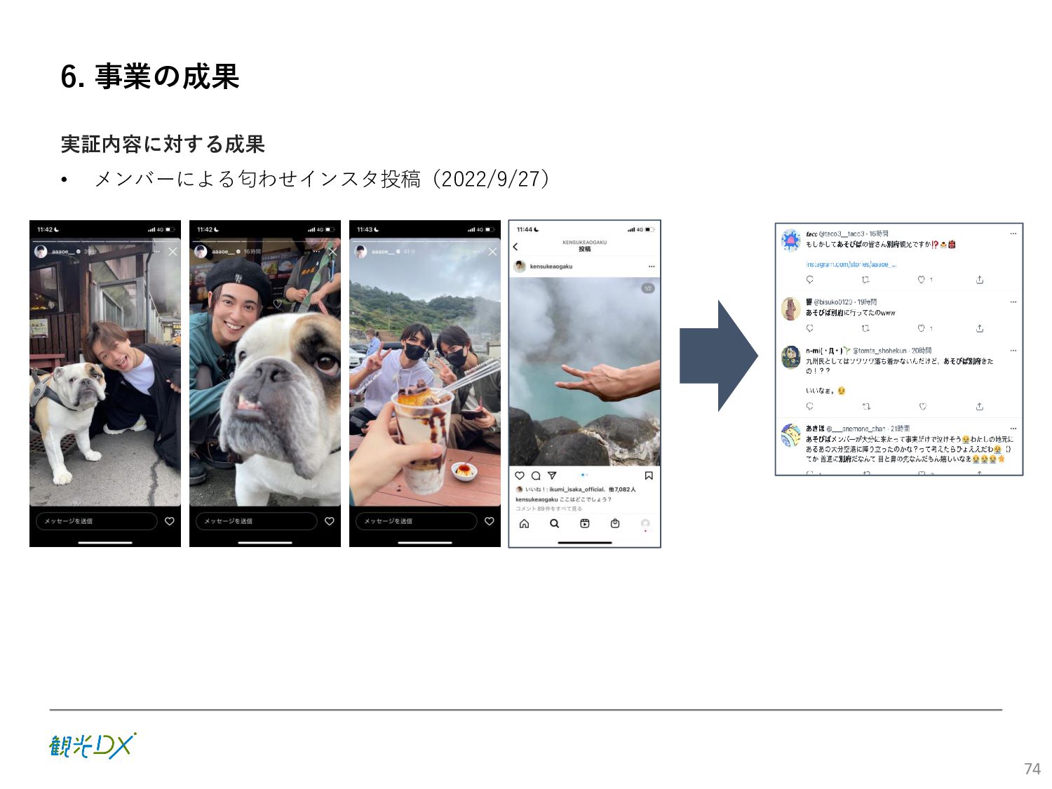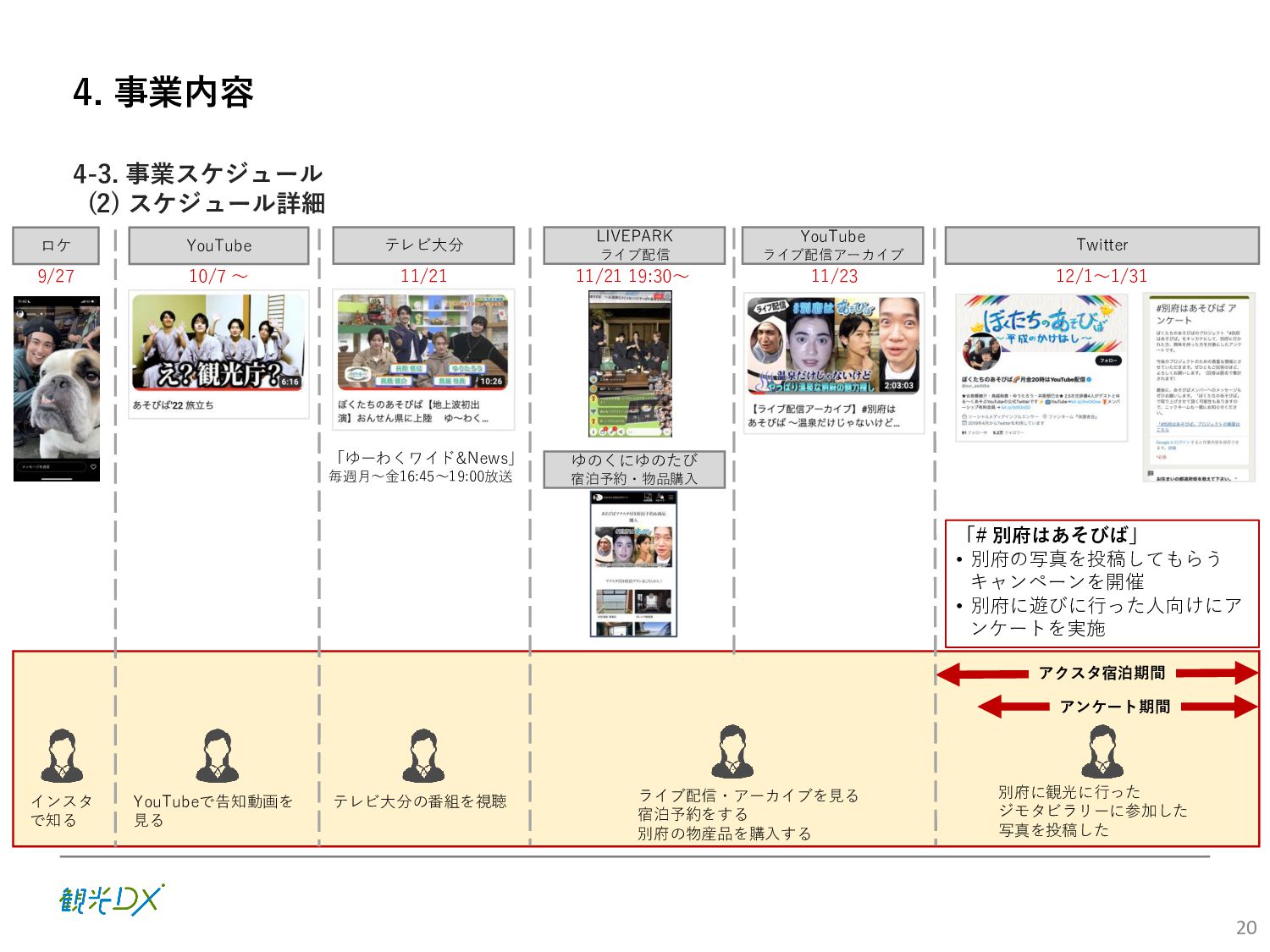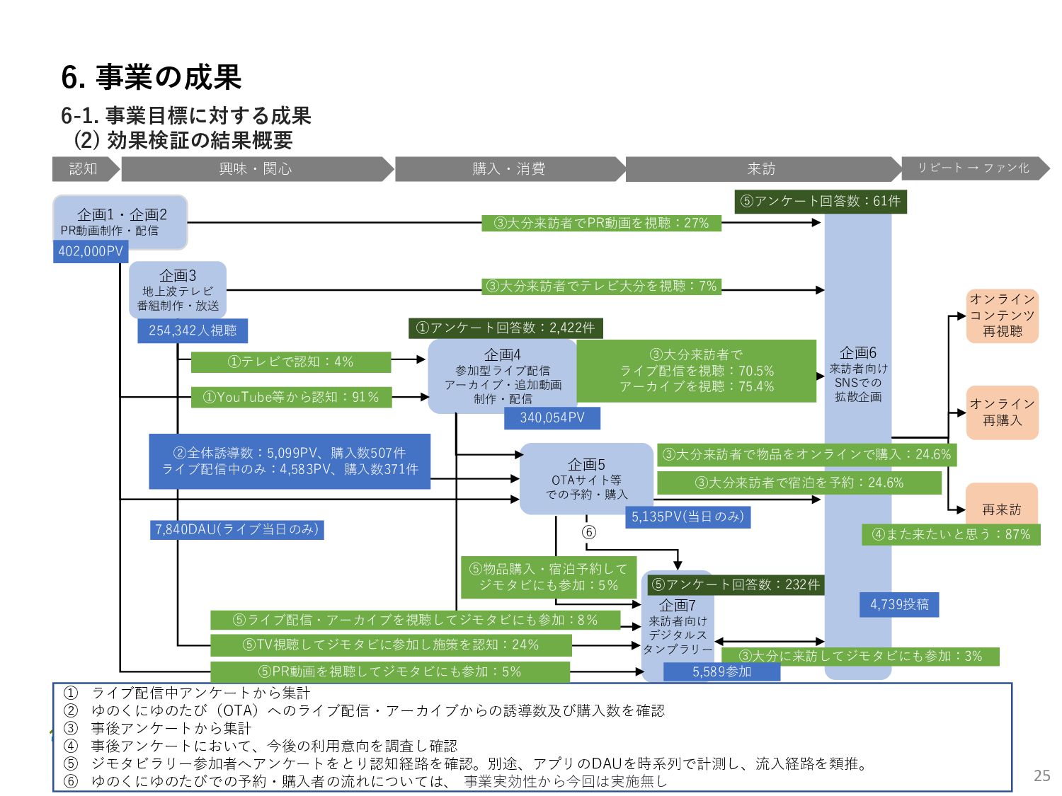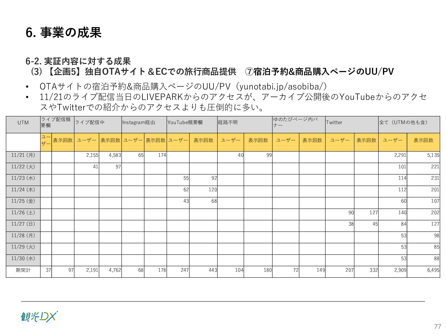 (5)聖地巡礼におけるSNS投稿数:100投稿 10月 11月 12月 1月 合計 目標数値 (累計) 購入件数 達成数値(件) (売上個数+宿泊人数) 0 424 (物342、宿82) 54 (物38、宿16) 29 (物4、宿25) 507 (物384、宿123) 500件 参考:購入人数 (物品購入者数+宿泊人数) 0 285 (物203、宿82) 30 (物14、宿16) 26 (物1、宿25) 341 (物218、宿123) 進捗率(%) 0 85% 96% 101% 101% 100% 平均購入⾦額 達成数値(円) (売上額/購入人数) 0 9,214 14,539 21,373 10,609 5,000円 進捗率(%) 0 184% 291% 427% 212% 100% 売上 達成数値(円) 0 2,625,967 (物1,167,692、宿 1,458,275) 436,157 (物113,757、 宿322,400) 555,704 (物9,404、宿 546,300) 3,617,828 (物1,290,853、宿 2,326,975) 2,500,000円 進捗率(%) 0 105% 122% 145% 145% 100% 11月 12月 1月 合計 目標数値(累計) 達成数値(投稿) 3,972 335 432 4,739 100投稿 進捗率(%) 3,972% 4,307% 4,739% 4,739% 100% 23