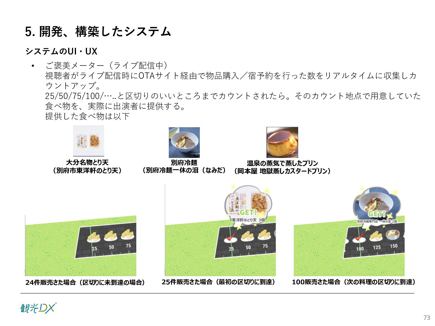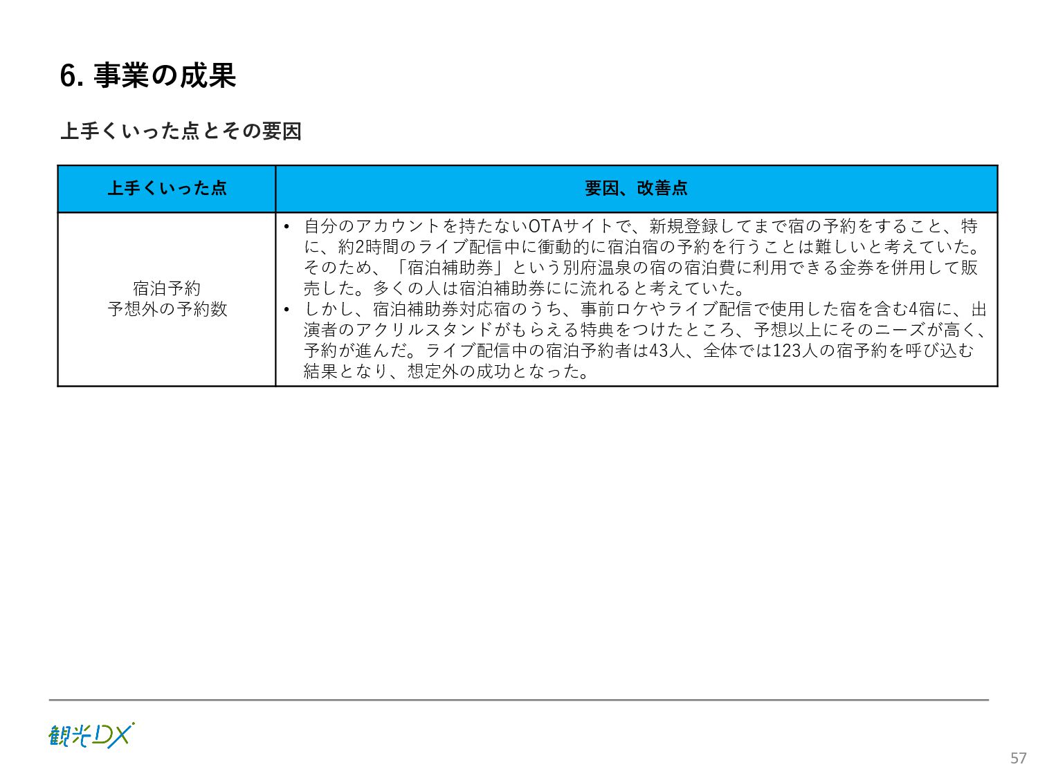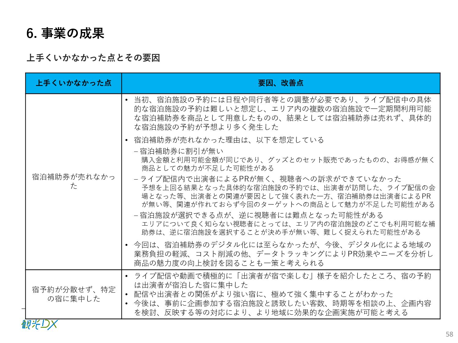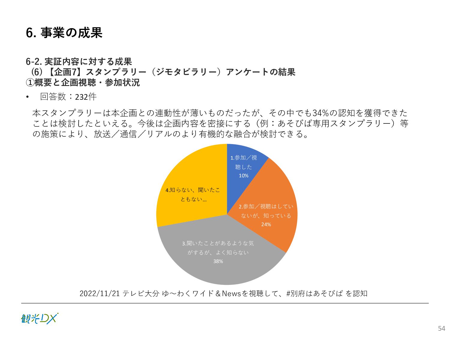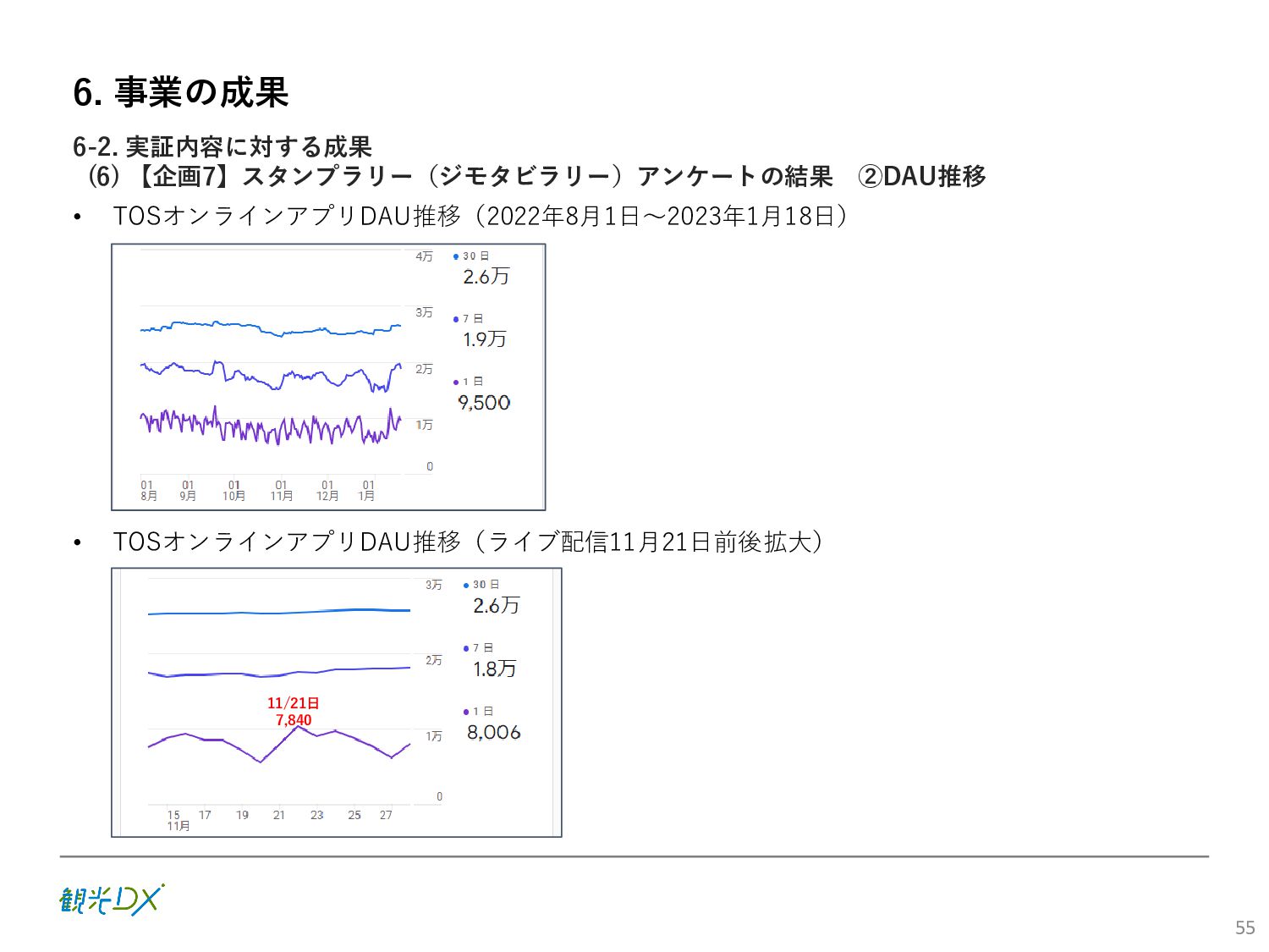 (5)聖地巡礼におけるSNS投稿数:100投稿 10月 11月 12月 1月 合計 目標数値 (累計) 購入件数 達成数値(件) (売上個数+宿泊人数) 0 424 (物342、宿82) 54 (物38、宿16) 29 (物4、宿25) 507 (物384、宿123) 500件 参考:購入人数 (物品購入者数+宿泊人数) 0 285 (物203、宿82) 30 (物14、宿16) 26 (物1、宿25) 341 (物218、宿123) 進捗率(%) 0 85% 96% 101% 101% 100% 平均購入⾦額 達成数値(円) (売上額/購入人数) 0 9,214 14,539 21,373 10,609 5,000円 進捗率(%) 0 184% 291% 427% 212% 100% 売上 達成数値(円) 0 2,625,967 (物1,167,692、宿 1,458,275) 436,157 (物113,757、 宿322,400) 555,704 (物9,404、宿 546,300) 3,617,828 (物1,290,853、宿 2,326,975) 2,500,000円 進捗率(%) 0 105% 122% 145% 145% 100% 11月 12月 1月 合計 目標数値(累計) 達成数値(投稿) 3,972 335 432 4,739 100投稿 進捗率(%) 3,972% 4,307% 4,739% 4,739% 100% 23