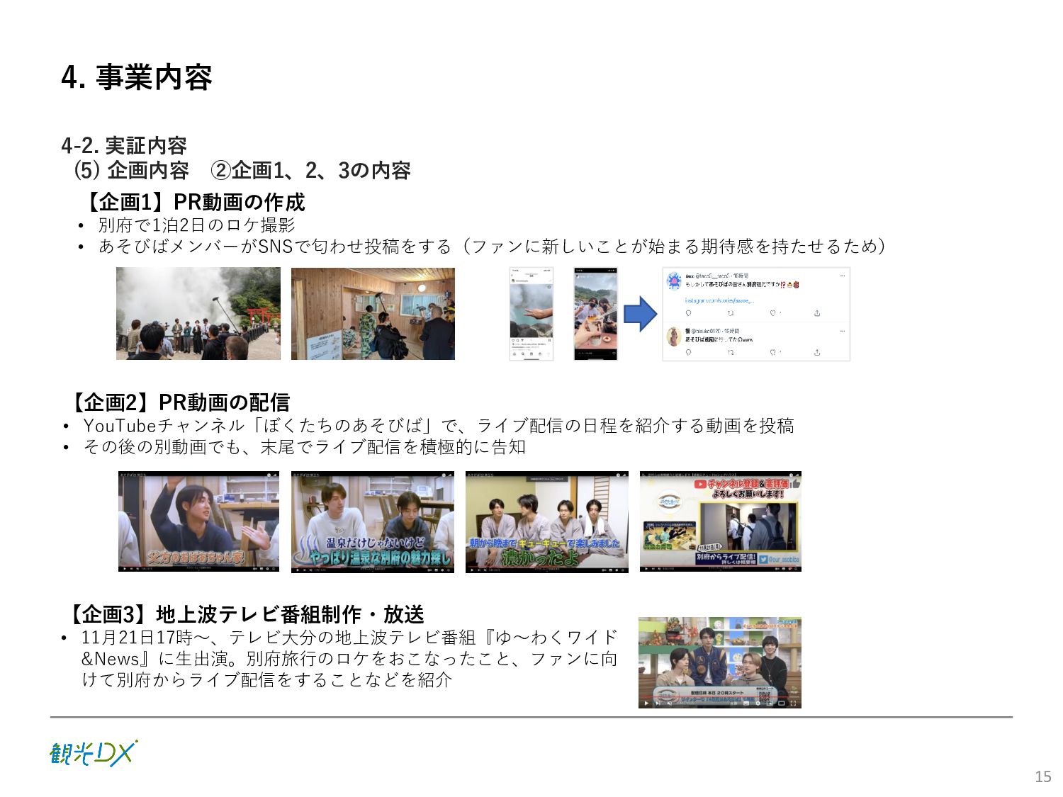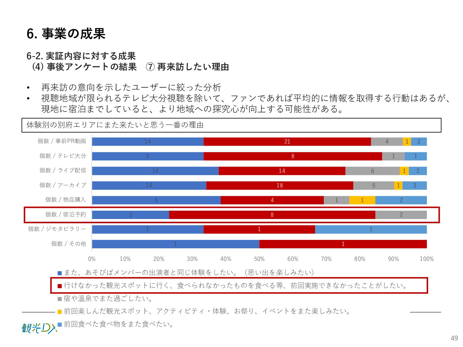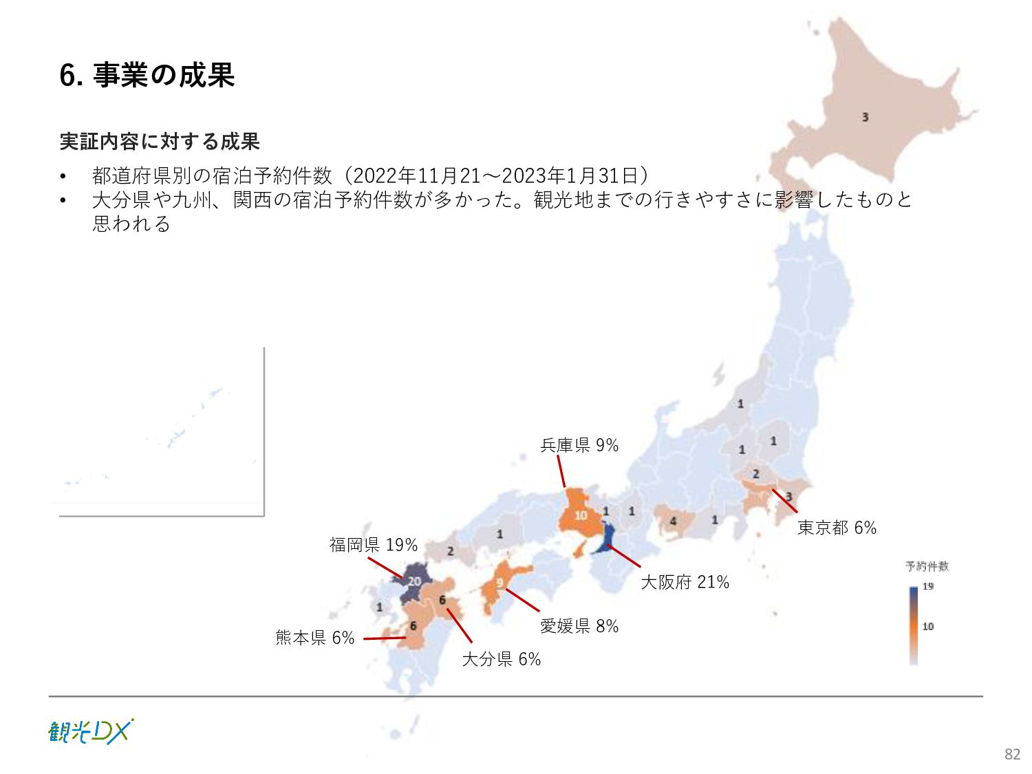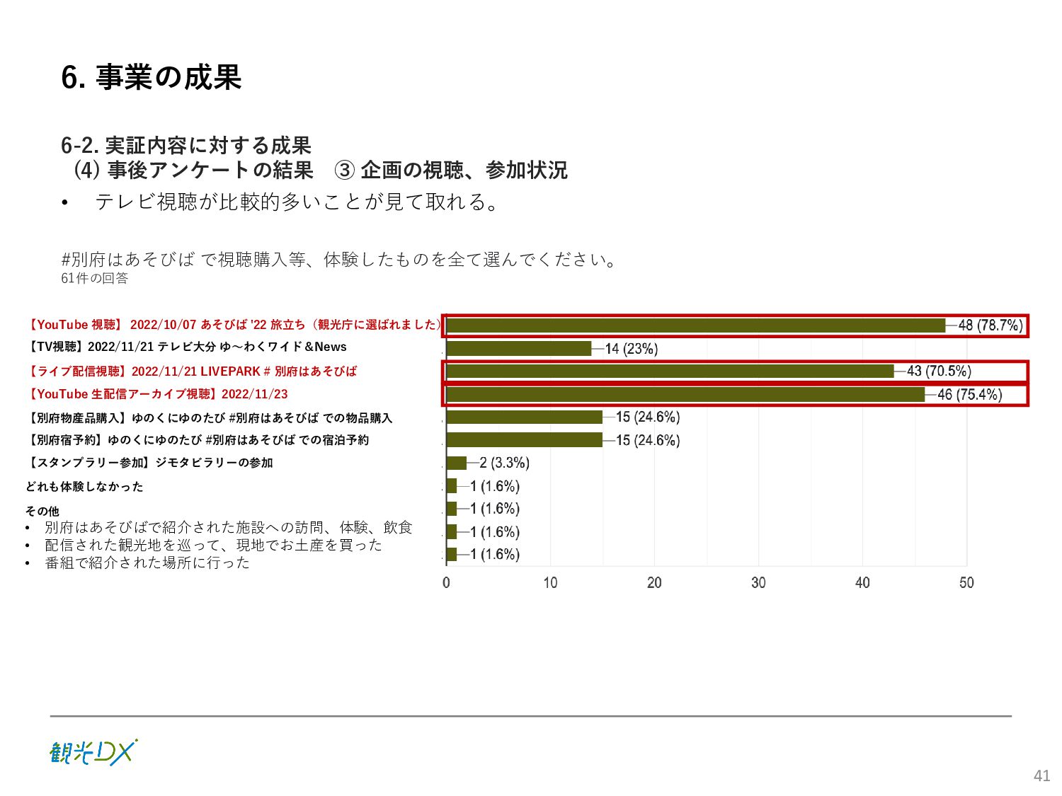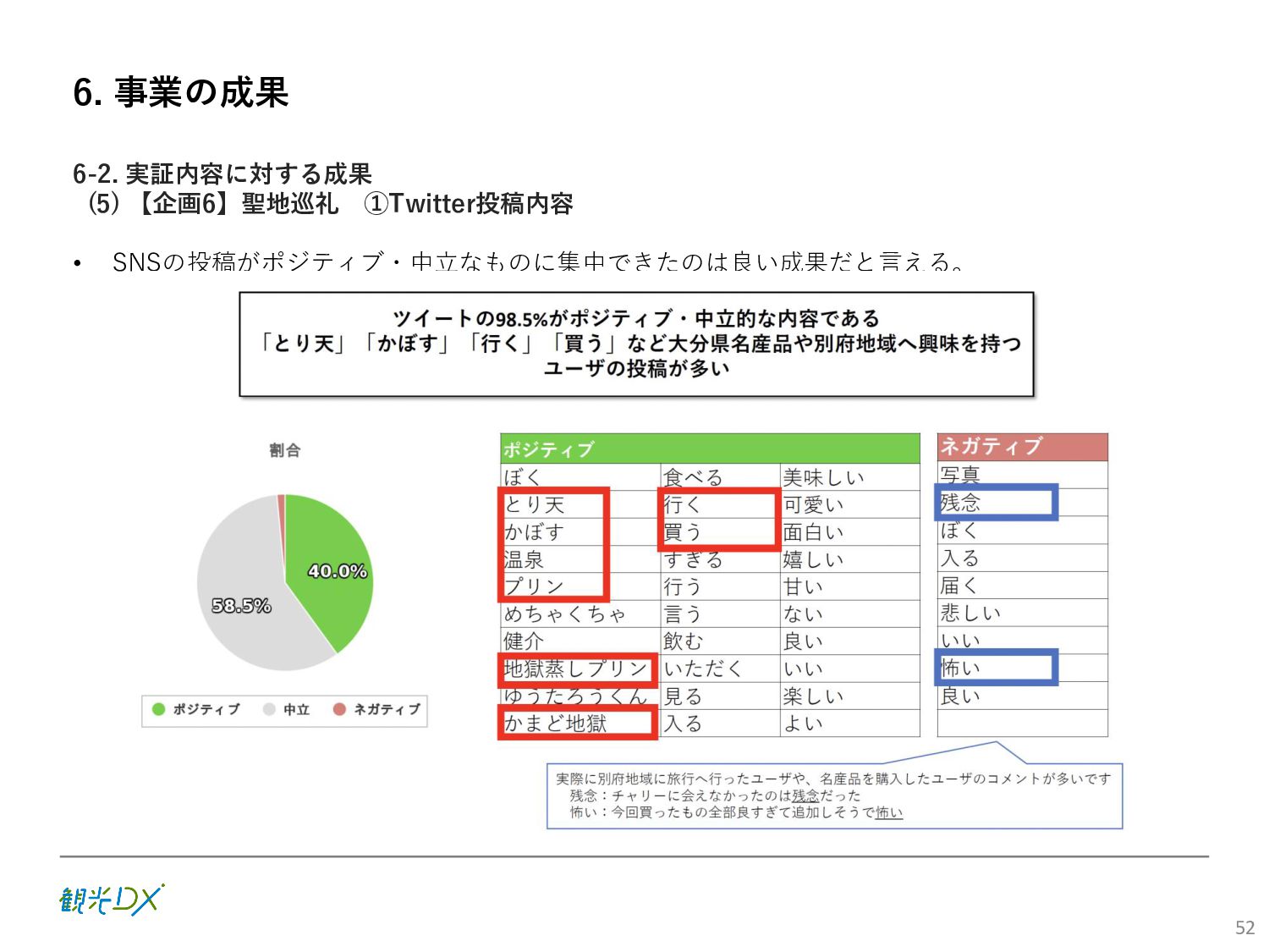 (5)聖地巡礼におけるSNS投稿数:100投稿 10月 11月 12月 1月 合計 目標数値 (累計) 購入件数 達成数値(件) (売上個数+宿泊人数) 0 424 (物342、宿82) 54 (物38、宿16) 29 (物4、宿25) 507 (物384、宿123) 500件 参考:購入人数 (物品購入者数+宿泊人数) 0 285 (物203、宿82) 30 (物14、宿16) 26 (物1、宿25) 341 (物218、宿123) 進捗率(%) 0 85% 96% 101% 101% 100% 平均購入⾦額 達成数値(円) (売上額/購入人数) 0 9,214 14,539 21,373 10,609 5,000円 進捗率(%) 0 184% 291% 427% 212% 100% 売上 達成数値(円) 0 2,625,967 (物1,167,692、宿 1,458,275) 436,157 (物113,757、 宿322,400) 555,704 (物9,404、宿 546,300) 3,617,828 (物1,290,853、宿 2,326,975) 2,500,000円 進捗率(%) 0 105% 122% 145% 145% 100% 11月 12月 1月 合計 目標数値(累計) 達成数値(投稿) 3,972 335 432 4,739 100投稿 進捗率(%) 3,972% 4,307% 4,739% 4,739% 100% 23