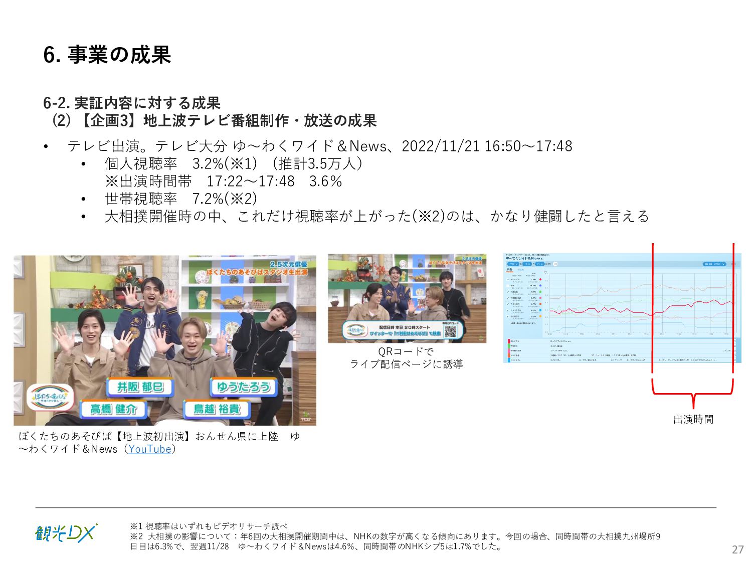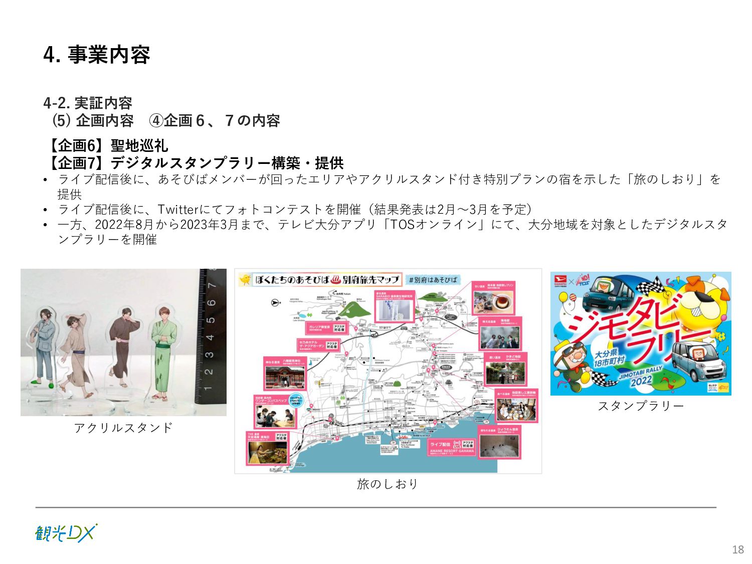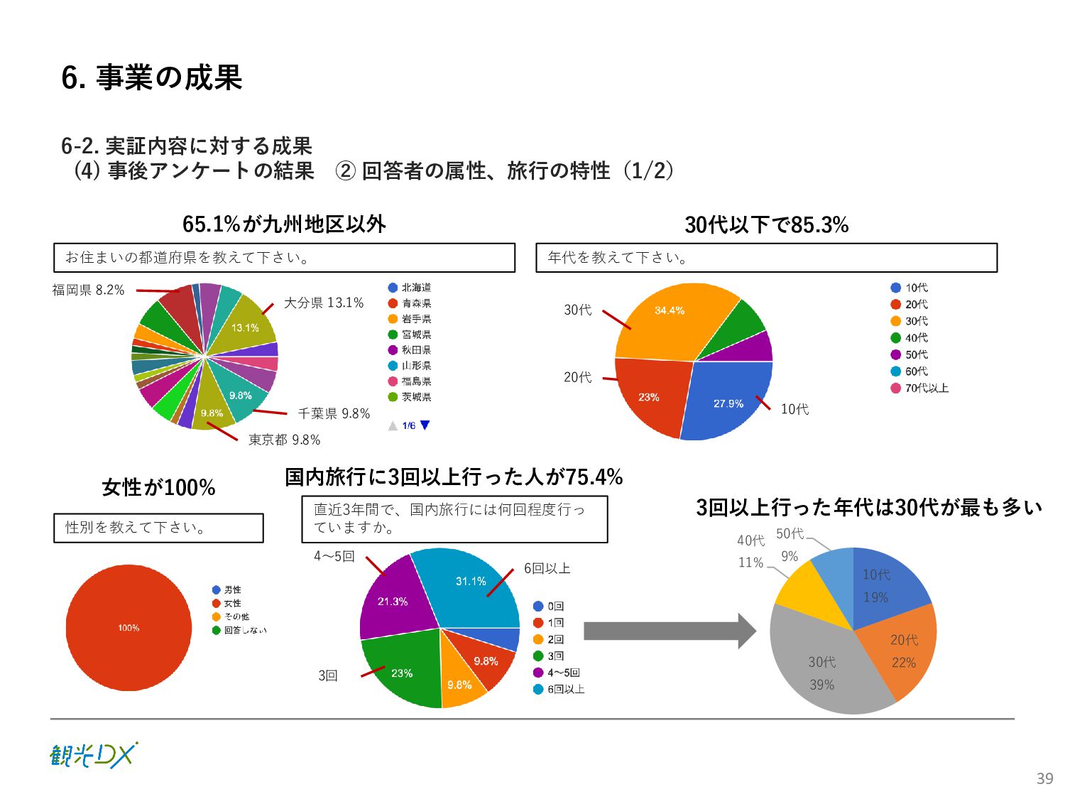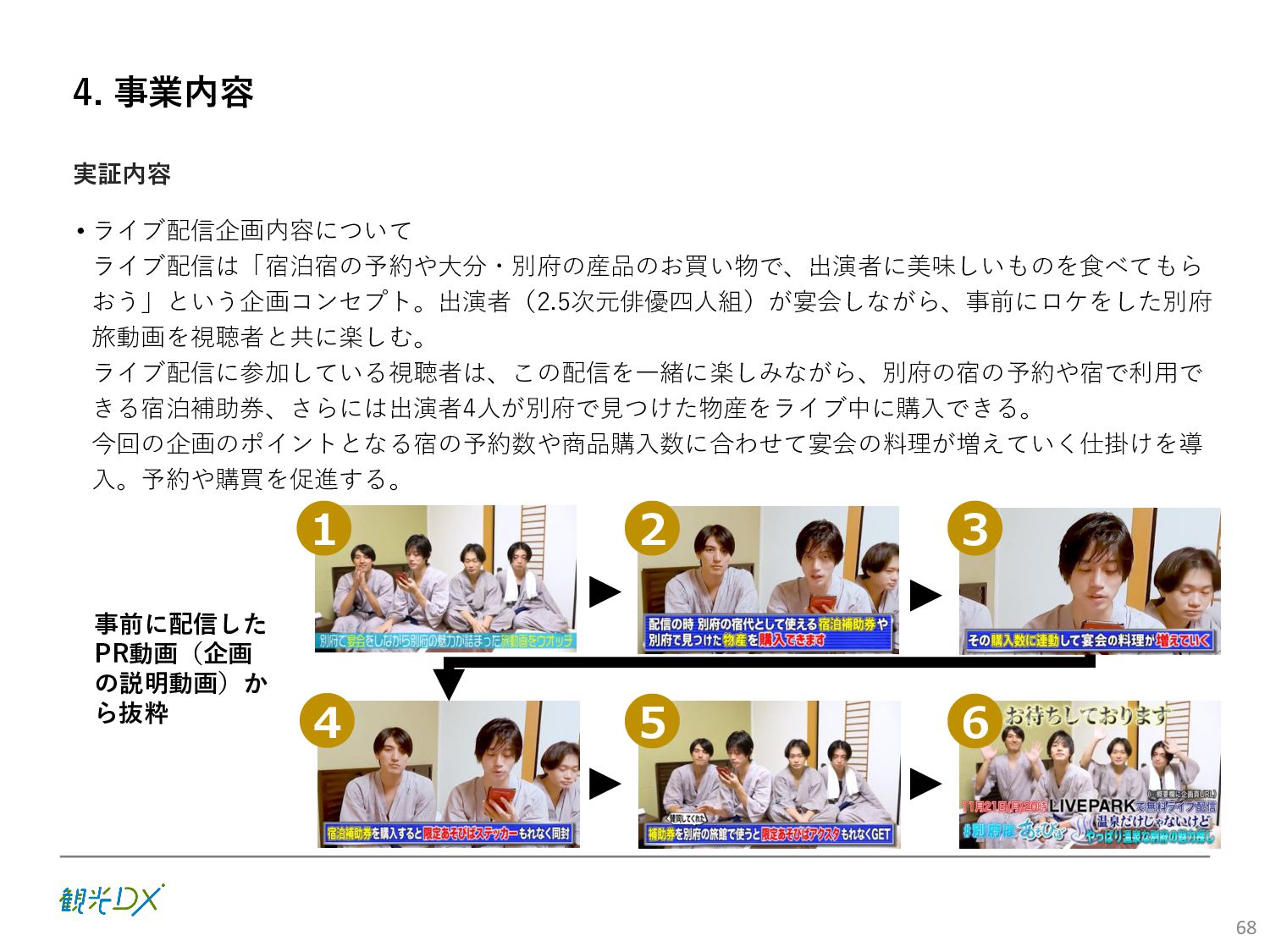 (5)聖地巡礼におけるSNS投稿数:100投稿 10月 11月 12月 1月 合計 目標数値 (累計) 購入件数 達成数値(件) (売上個数+宿泊人数) 0 424 (物342、宿82) 54 (物38、宿16) 29 (物4、宿25) 507 (物384、宿123) 500件 参考:購入人数 (物品購入者数+宿泊人数) 0 285 (物203、宿82) 30 (物14、宿16) 26 (物1、宿25) 341 (物218、宿123) 進捗率(%) 0 85% 96% 101% 101% 100% 平均購入⾦額 達成数値(円) (売上額/購入人数) 0 9,214 14,539 21,373 10,609 5,000円 進捗率(%) 0 184% 291% 427% 212% 100% 売上 達成数値(円) 0 2,625,967 (物1,167,692、宿 1,458,275) 436,157 (物113,757、 宿322,400) 555,704 (物9,404、宿 546,300) 3,617,828 (物1,290,853、宿 2,326,975) 2,500,000円 進捗率(%) 0 105% 122% 145% 145% 100% 11月 12月 1月 合計 目標数値(累計) 達成数値(投稿) 3,972 335 432 4,739 100投稿 進捗率(%) 3,972% 4,307% 4,739% 4,739% 100% 23