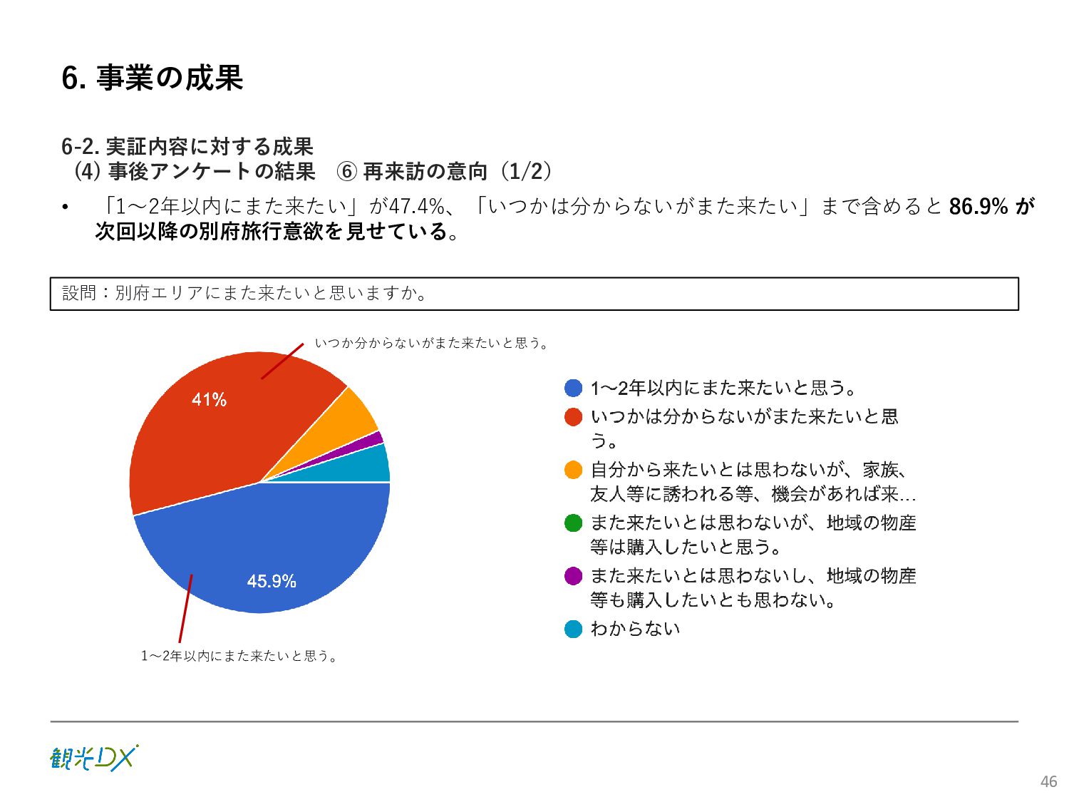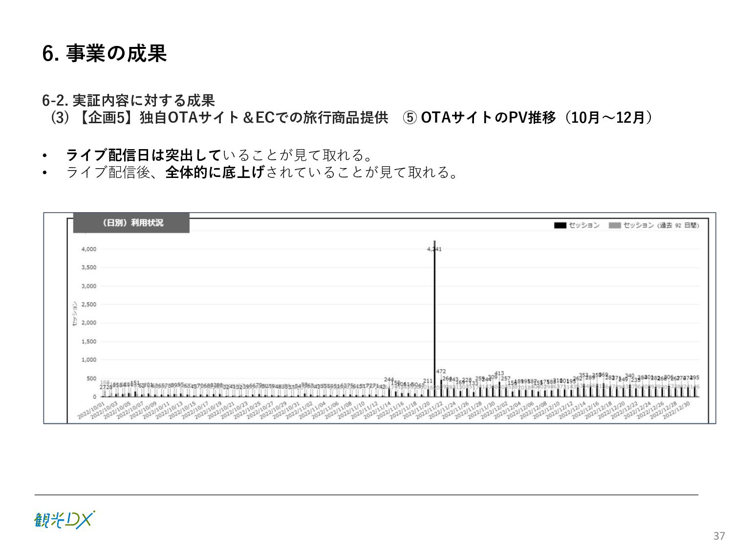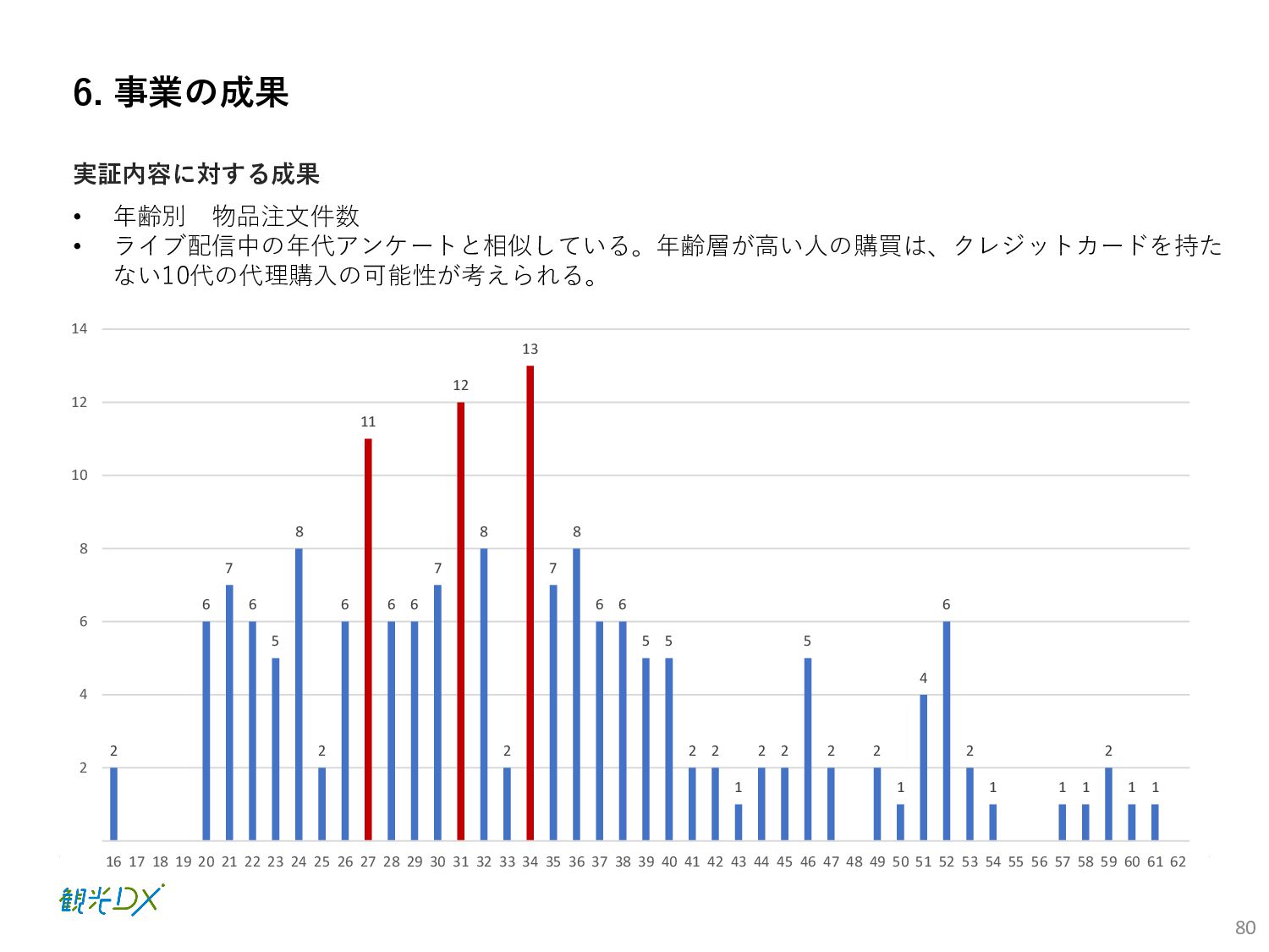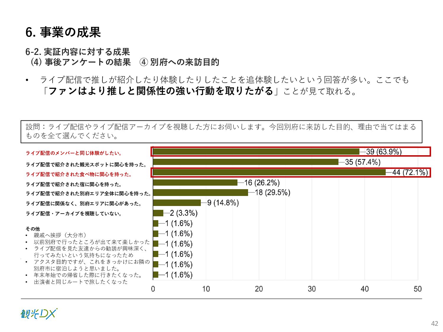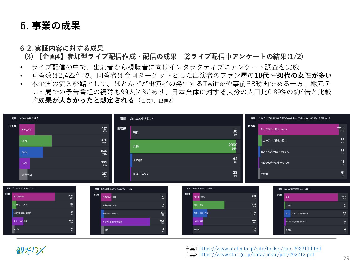 (5)聖地巡礼におけるSNS投稿数:100投稿 10月 11月 12月 1月 合計 目標数値 (累計) 購入件数 達成数値(件) (売上個数+宿泊人数) 0 424 (物342、宿82) 54 (物38、宿16) 29 (物4、宿25) 507 (物384、宿123) 500件 参考:購入人数 (物品購入者数+宿泊人数) 0 285 (物203、宿82) 30 (物14、宿16) 26 (物1、宿25) 341 (物218、宿123) 進捗率(%) 0 85% 96% 101% 101% 100% 平均購入⾦額 達成数値(円) (売上額/購入人数) 0 9,214 14,539 21,373 10,609 5,000円 進捗率(%) 0 184% 291% 427% 212% 100% 売上 達成数値(円) 0 2,625,967 (物1,167,692、宿 1,458,275) 436,157 (物113,757、 宿322,400) 555,704 (物9,404、宿 546,300) 3,617,828 (物1,290,853、宿 2,326,975) 2,500,000円 進捗率(%) 0 105% 122% 145% 145% 100% 11月 12月 1月 合計 目標数値(累計) 達成数値(投稿) 3,972 335 432 4,739 100投稿 進捗率(%) 3,972% 4,307% 4,739% 4,739% 100% 23