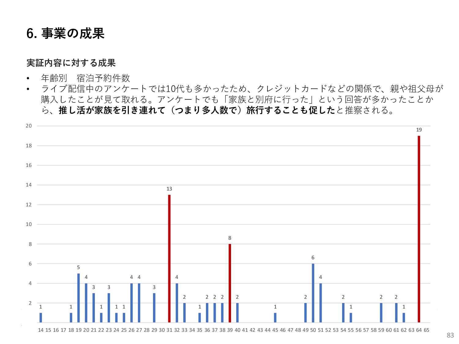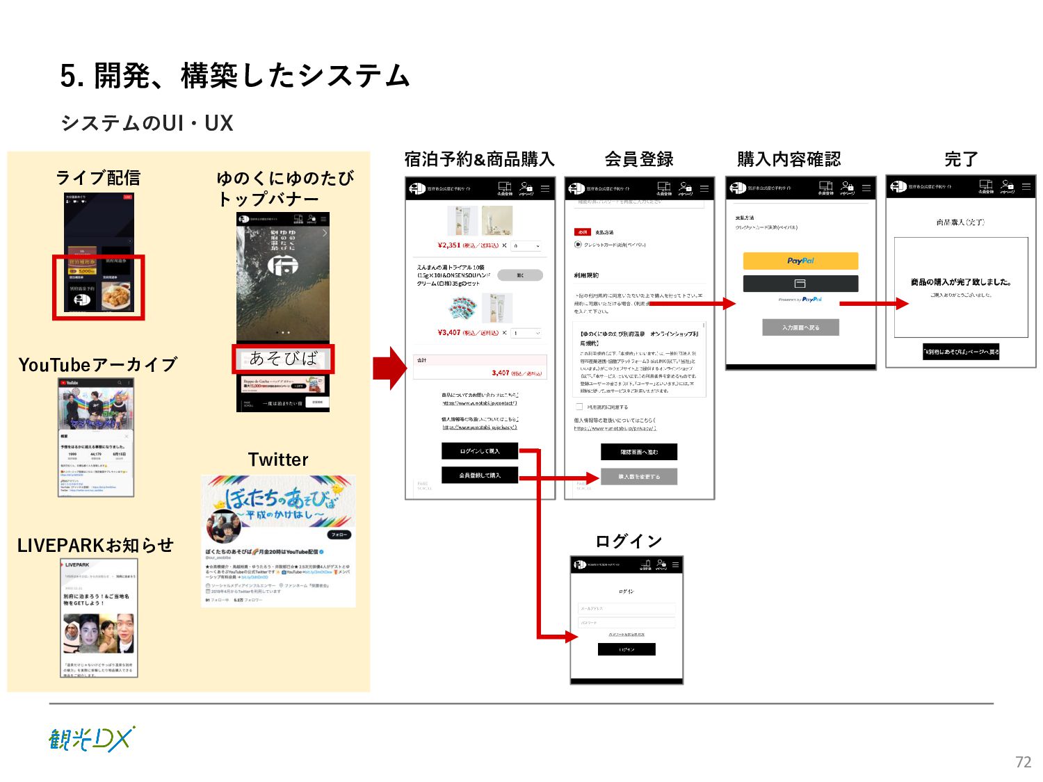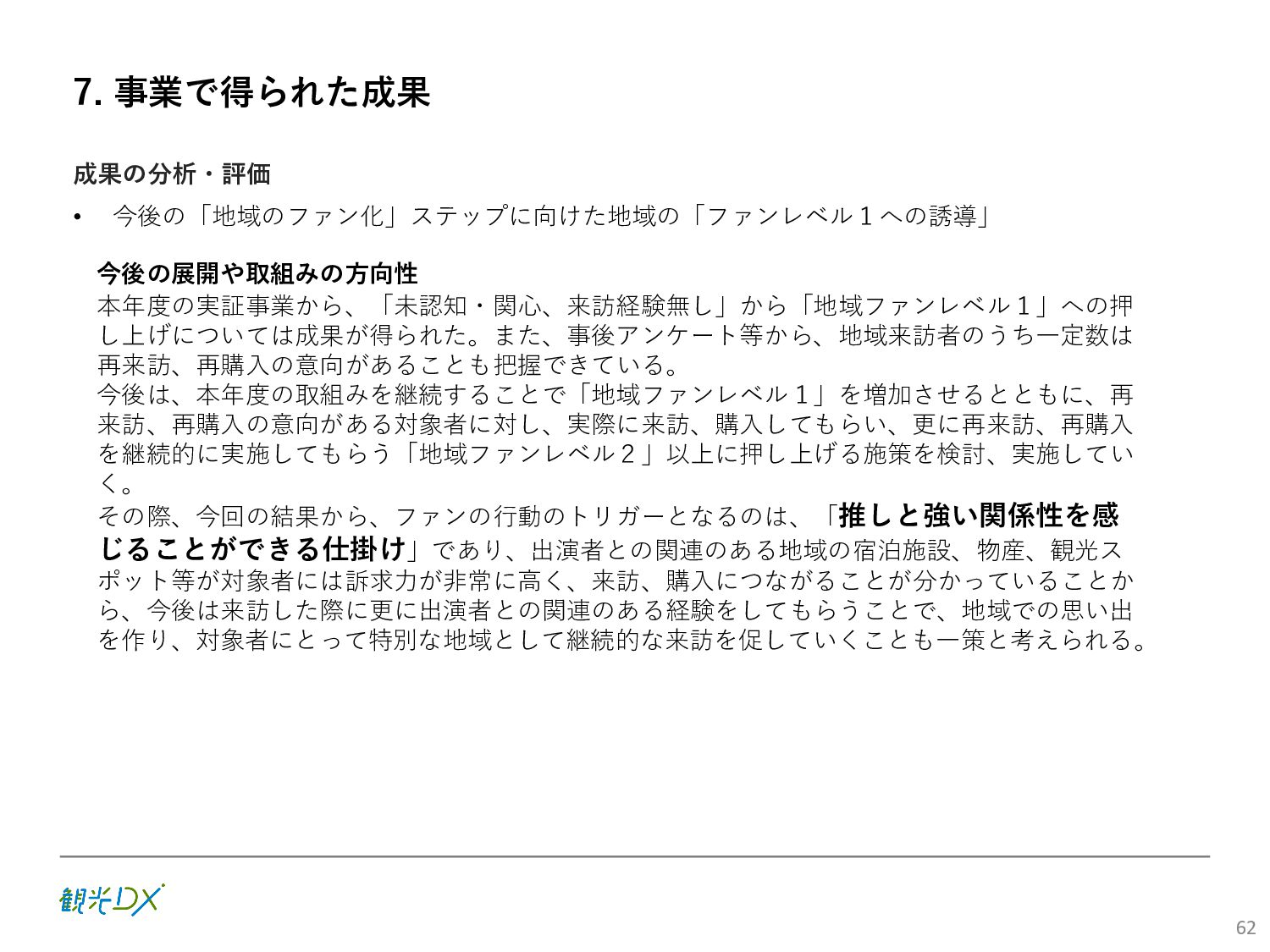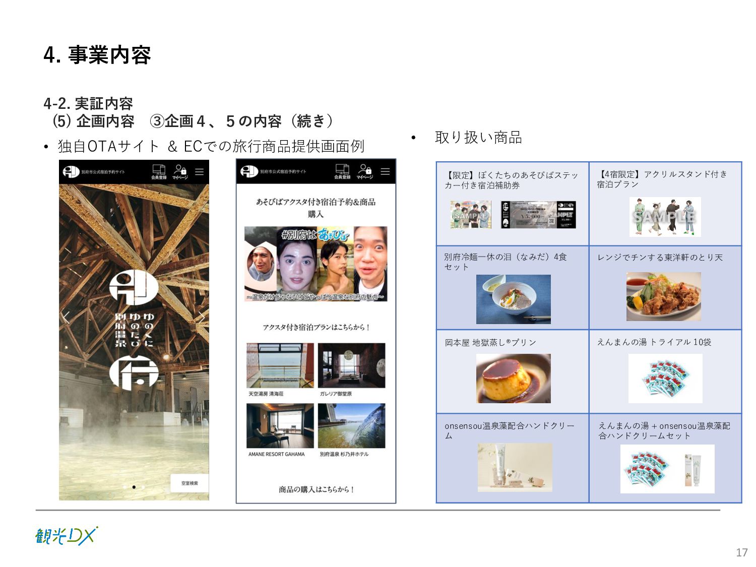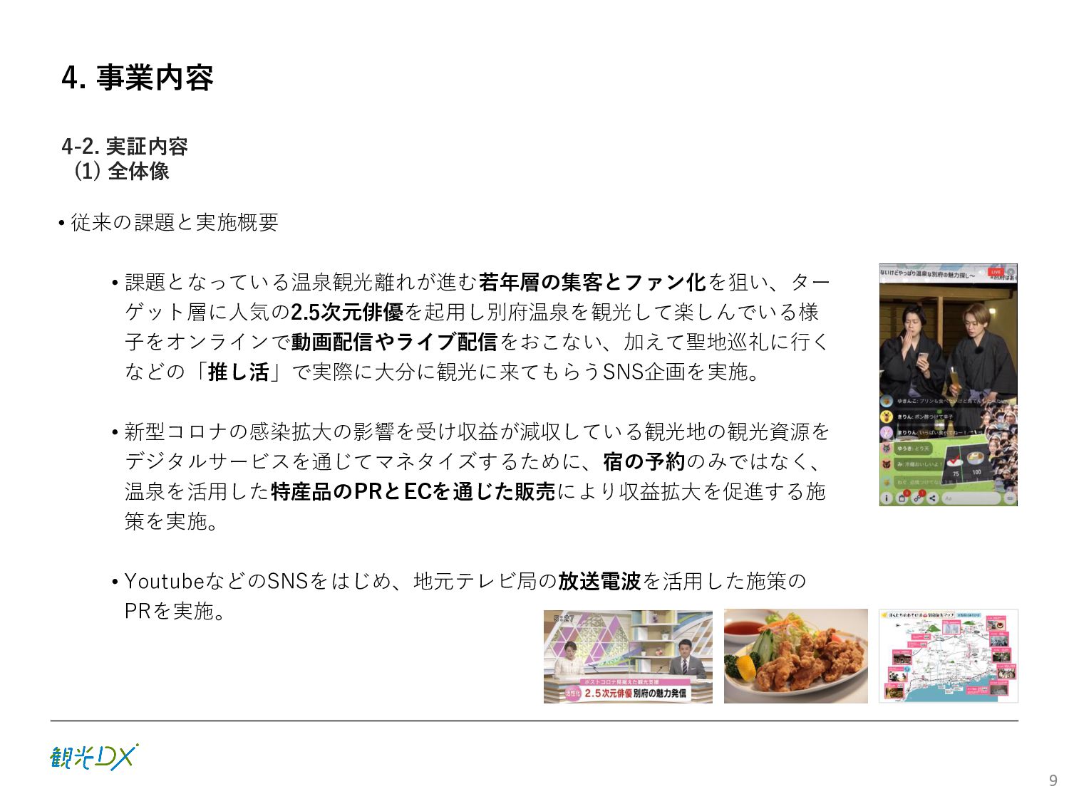 (5)聖地巡礼におけるSNS投稿数:100投稿 10月 11月 12月 1月 合計 目標数値 (累計) 購入件数 達成数値(件) (売上個数+宿泊人数) 0 424 (物342、宿82) 54 (物38、宿16) 29 (物4、宿25) 507 (物384、宿123) 500件 参考:購入人数 (物品購入者数+宿泊人数) 0 285 (物203、宿82) 30 (物14、宿16) 26 (物1、宿25) 341 (物218、宿123) 進捗率(%) 0 85% 96% 101% 101% 100% 平均購入⾦額 達成数値(円) (売上額/購入人数) 0 9,214 14,539 21,373 10,609 5,000円 進捗率(%) 0 184% 291% 427% 212% 100% 売上 達成数値(円) 0 2,625,967 (物1,167,692、宿 1,458,275) 436,157 (物113,757、 宿322,400) 555,704 (物9,404、宿 546,300) 3,617,828 (物1,290,853、宿 2,326,975) 2,500,000円 進捗率(%) 0 105% 122% 145% 145% 100% 11月 12月 1月 合計 目標数値(累計) 達成数値(投稿) 3,972 335 432 4,739 100投稿 進捗率(%) 3,972% 4,307% 4,739% 4,739% 100% 23