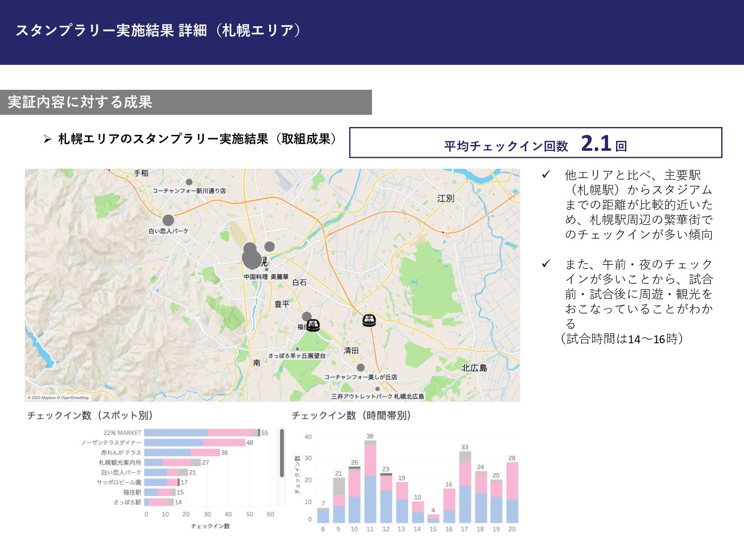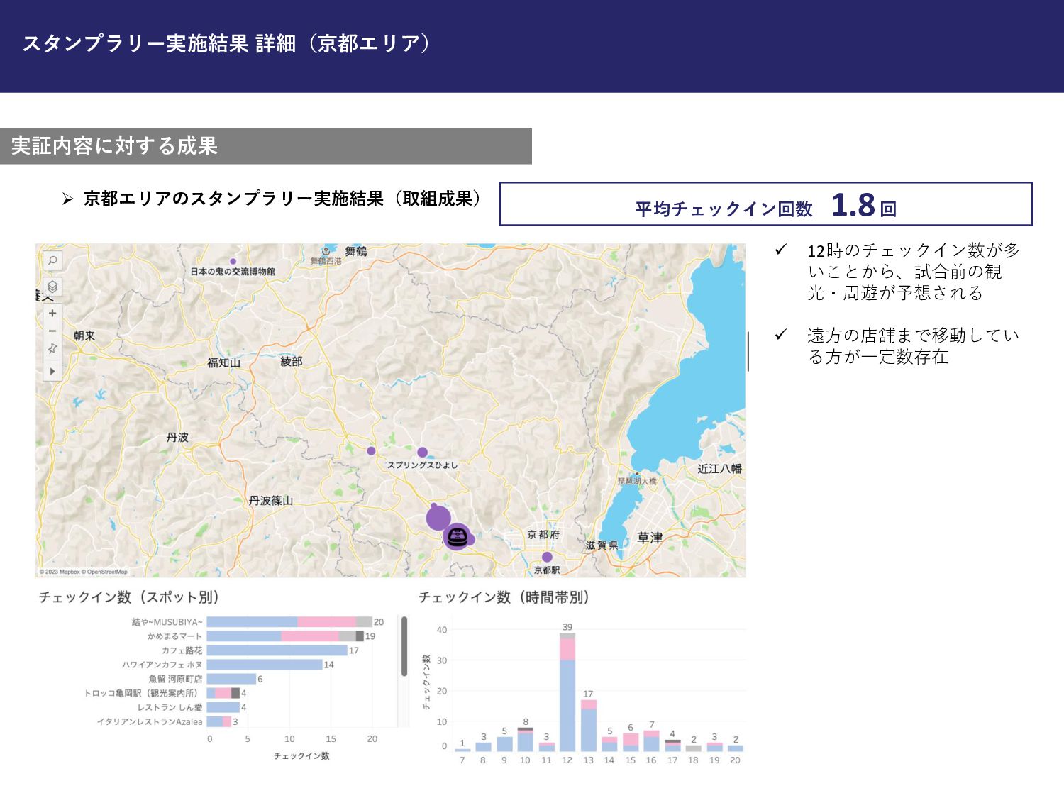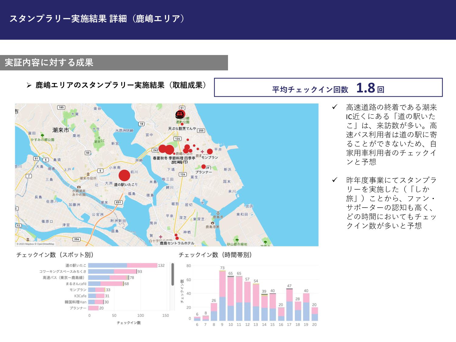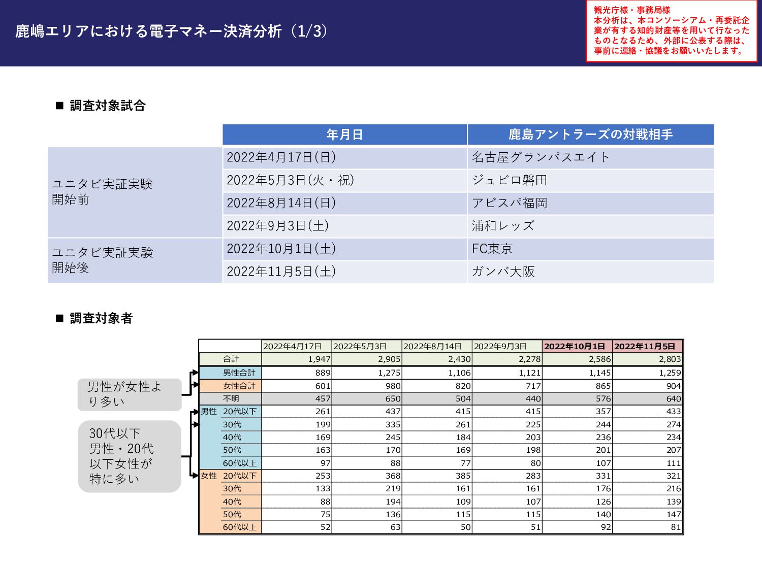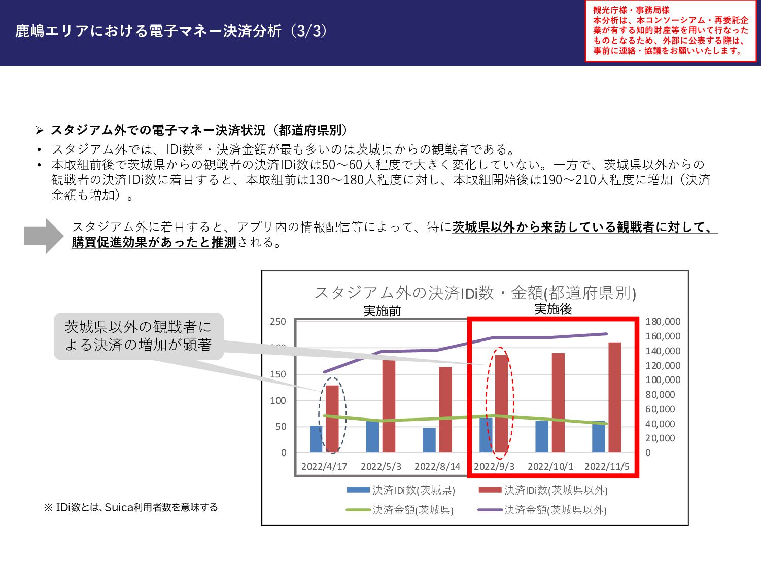 142 81 22% 117,410 827 1,450 茨城県 124 74 20% 110,982 895 1,500 千葉県 70 39 10% 53,469 764 1,371 神奈川県 42 25 7% 28,318 674 1,133 埼玉県 40 21 6% 32,861 822 1,565 その他 49 27 7% 41,574 848 1,540 不明 143 108 29% 107,236 750 993 合計 610 375 100% 491,850 806 1,312 2022年11月5日 東京都 296 180 26% 284,525 961 1,581 茨城県 218 123 18% 199,126 913 1,619 千葉県 130 72 11% 121,880 938 1,693 神奈川県 107 61 9% 96,829 905 1,587 埼玉県 41 26 4% 29,224 713 1,124 その他 85 57 8% 71,663 843 1,257 不明 241 165 24% 219,739 912 1,332 合計 1,118 684 100% 1,022,986 915 1,496 順位変動なし 増加傾向 大きな変化なし 実 施 前 実 施 後 ※ IDi数とは、Suica利用者数を意味する • 観戦者の居住地(都道府県)別で決済回数・IDi数※を集計すると、東京都、茨城県、千葉県、神奈川県、埼玉県が上 位5都県となっており、本取組実施前後で順位変動はなし。 • 各都県別での決済回数・IDi数・決済金額はそれぞれ増加傾向だが、決済金額(回数平均)・決済金額(IDi数平均)は本取 組前後で大きな変化なし。 アプリ内の情報配信等によって、特にこれまで地域内で購買を行っていなかった観戦者(潜在顧客)に対して、購 買促進効果があったと推測される。 ➢ 茨城県内での電子マネー決済状況(都道府県別) 鹿嶋エリアにおける電子マネー決済分析(2/3) 観光庁様・事務局様 本分析は、本コンソーシアム・再委託企 業が有する知的財産等を用いて行なった ものとなるため、外部に公表する際は、 事前に連絡・協議をお願いいたします。