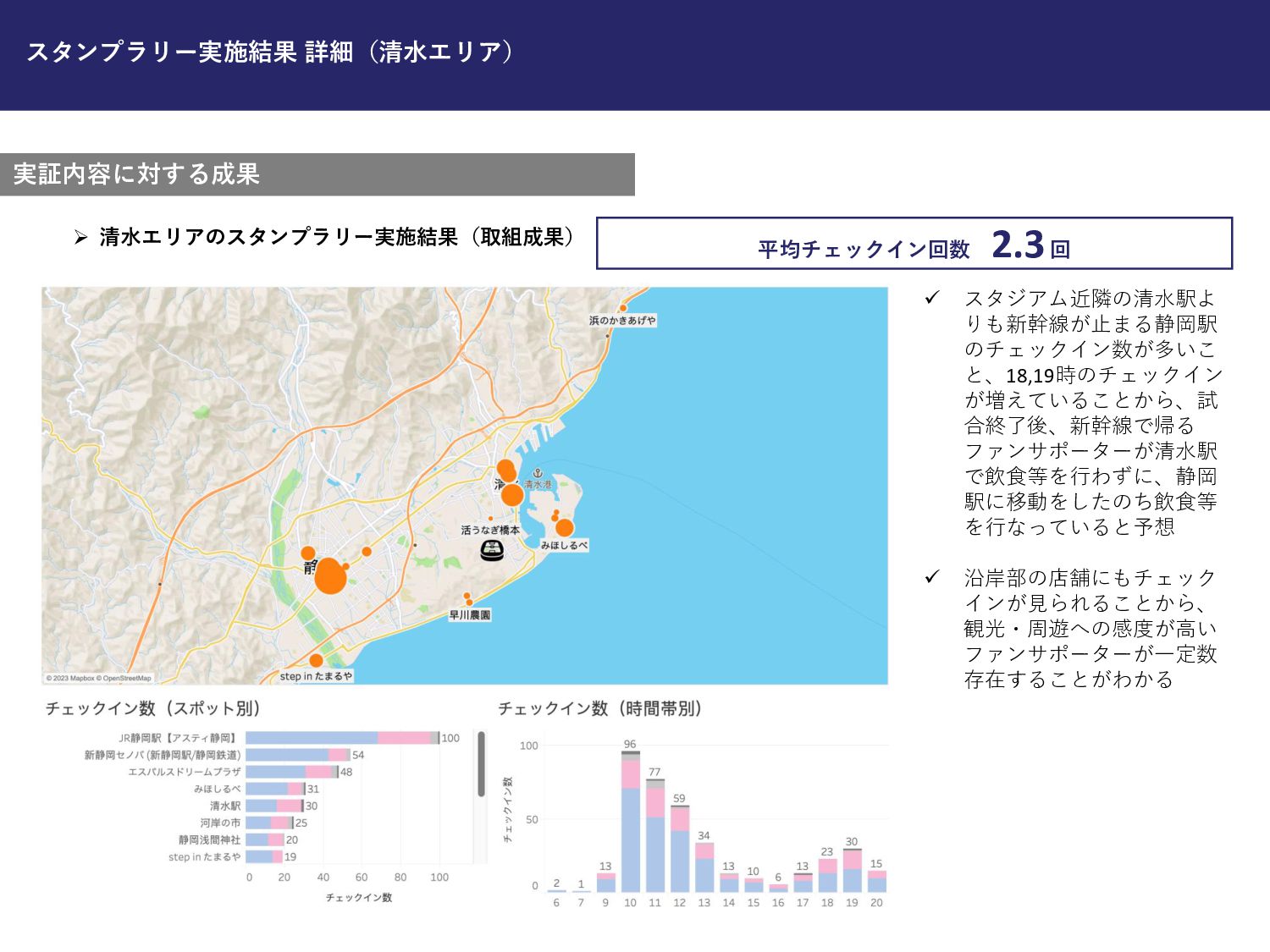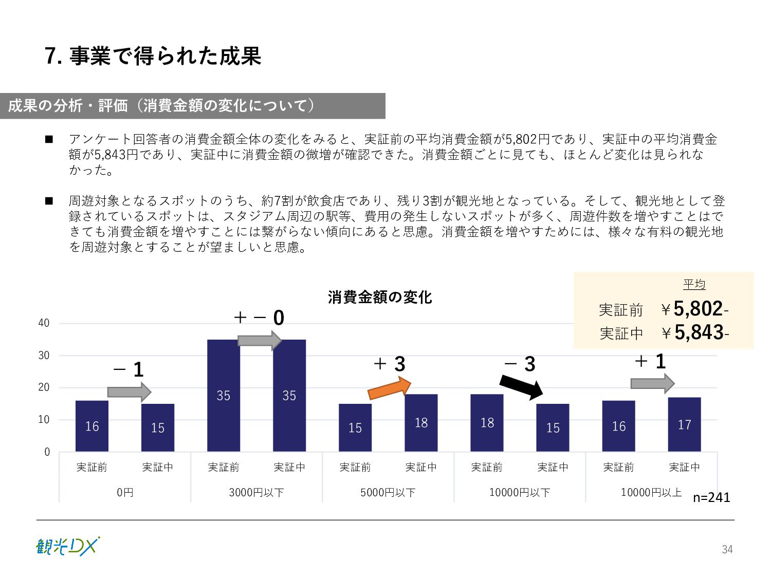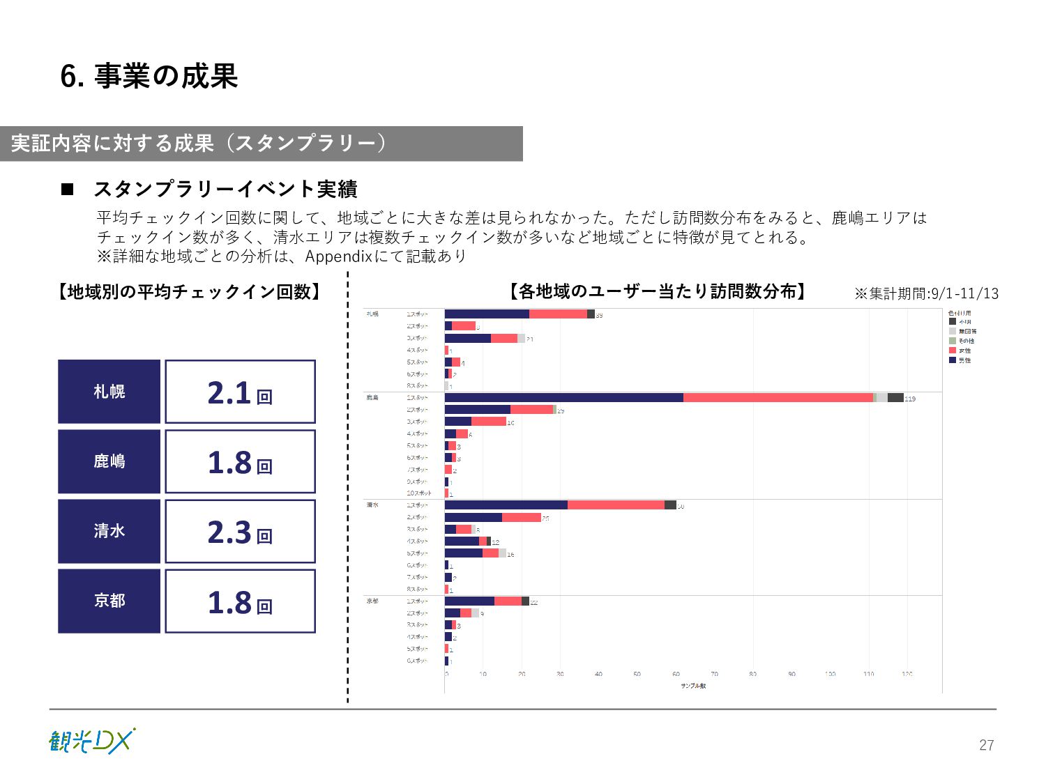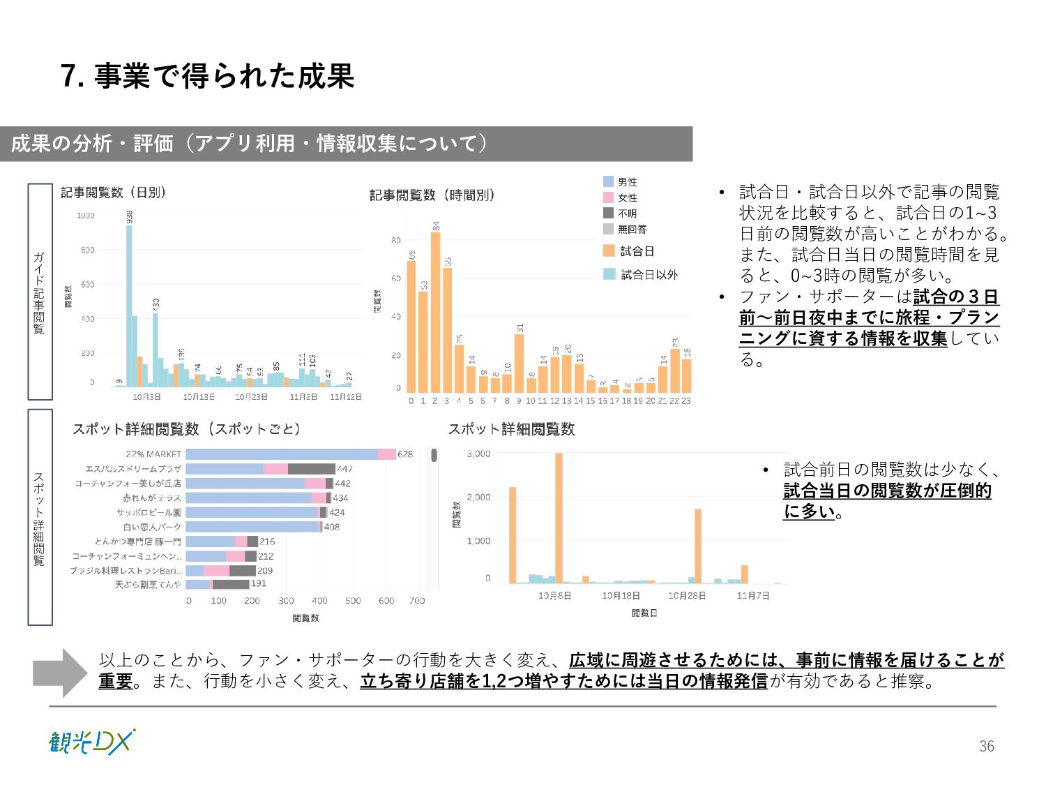 142 81 22% 117,410 827 1,450 茨城県 124 74 20% 110,982 895 1,500 千葉県 70 39 10% 53,469 764 1,371 神奈川県 42 25 7% 28,318 674 1,133 埼玉県 40 21 6% 32,861 822 1,565 その他 49 27 7% 41,574 848 1,540 不明 143 108 29% 107,236 750 993 合計 610 375 100% 491,850 806 1,312 2022年11月5日 東京都 296 180 26% 284,525 961 1,581 茨城県 218 123 18% 199,126 913 1,619 千葉県 130 72 11% 121,880 938 1,693 神奈川県 107 61 9% 96,829 905 1,587 埼玉県 41 26 4% 29,224 713 1,124 その他 85 57 8% 71,663 843 1,257 不明 241 165 24% 219,739 912 1,332 合計 1,118 684 100% 1,022,986 915 1,496 順位変動なし 増加傾向 大きな変化なし 実 施 前 実 施 後 ※ IDi数とは、Suica利用者数を意味する • 観戦者の居住地(都道府県)別で決済回数・IDi数※を集計すると、東京都、茨城県、千葉県、神奈川県、埼玉県が上 位5都県となっており、本取組実施前後で順位変動はなし。 • 各都県別での決済回数・IDi数・決済金額はそれぞれ増加傾向だが、決済金額(回数平均)・決済金額(IDi数平均)は本取 組前後で大きな変化なし。 アプリ内の情報配信等によって、特にこれまで地域内で購買を行っていなかった観戦者(潜在顧客)に対して、購 買促進効果があったと推測される。 ➢ 茨城県内での電子マネー決済状況(都道府県別) 鹿嶋エリアにおける電子マネー決済分析(2/3) 観光庁様・事務局様 本分析は、本コンソーシアム・再委託企 業が有する知的財産等を用いて行なった ものとなるため、外部に公表する際は、 事前に連絡・協議をお願いいたします。