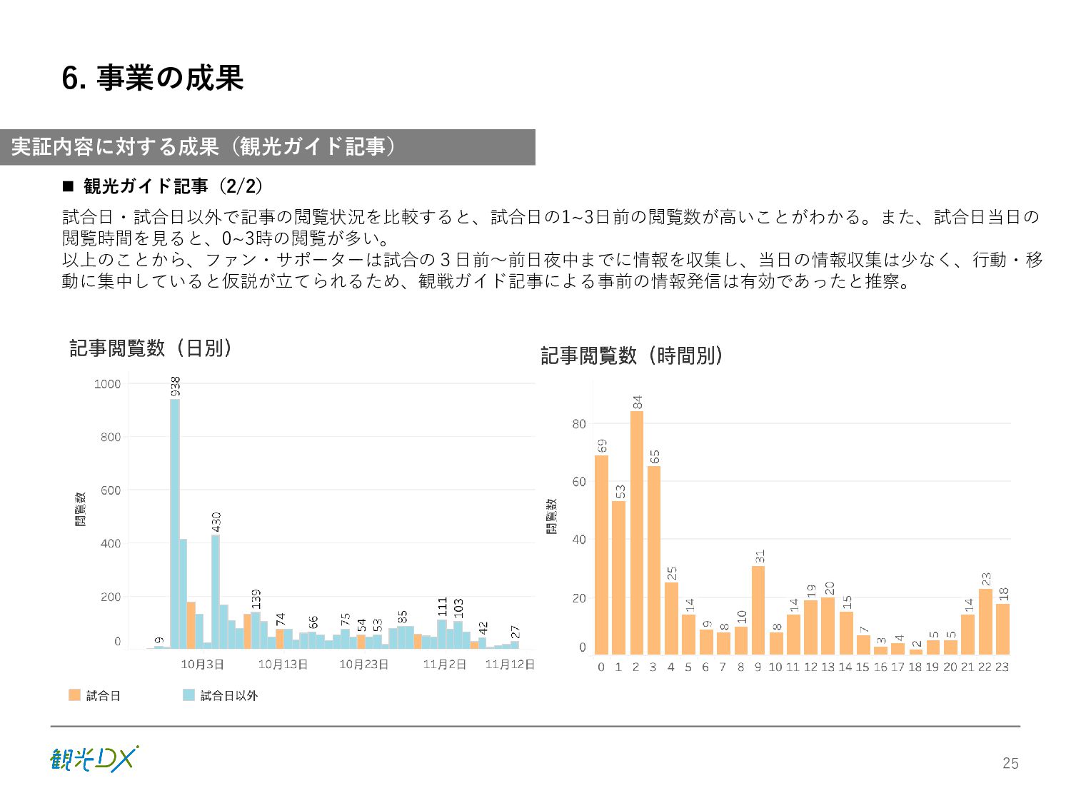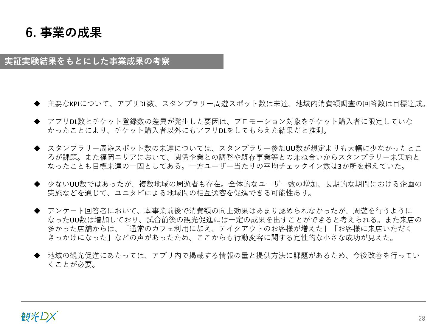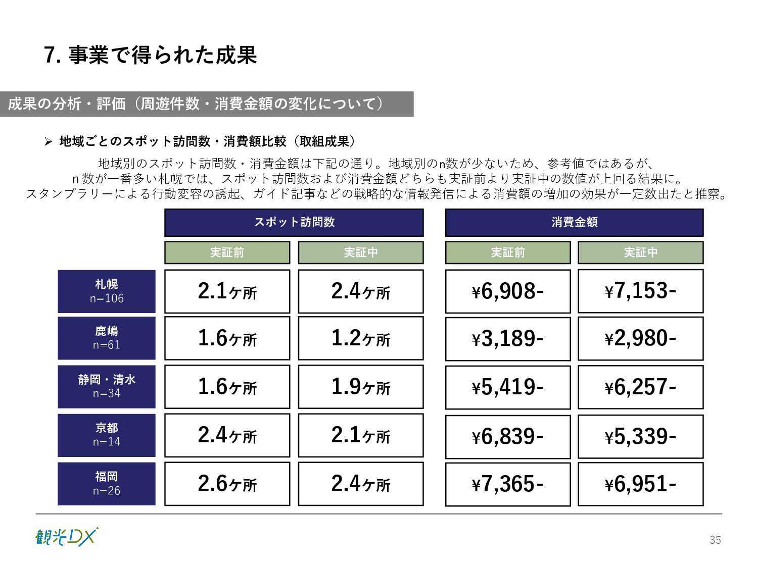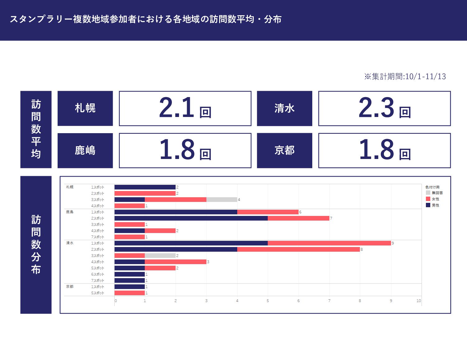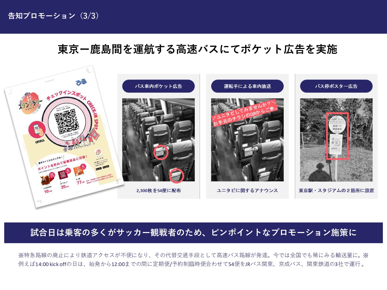 142 81 22% 117,410 827 1,450 茨城県 124 74 20% 110,982 895 1,500 千葉県 70 39 10% 53,469 764 1,371 神奈川県 42 25 7% 28,318 674 1,133 埼玉県 40 21 6% 32,861 822 1,565 その他 49 27 7% 41,574 848 1,540 不明 143 108 29% 107,236 750 993 合計 610 375 100% 491,850 806 1,312 2022年11月5日 東京都 296 180 26% 284,525 961 1,581 茨城県 218 123 18% 199,126 913 1,619 千葉県 130 72 11% 121,880 938 1,693 神奈川県 107 61 9% 96,829 905 1,587 埼玉県 41 26 4% 29,224 713 1,124 その他 85 57 8% 71,663 843 1,257 不明 241 165 24% 219,739 912 1,332 合計 1,118 684 100% 1,022,986 915 1,496 順位変動なし 増加傾向 大きな変化なし 実 施 前 実 施 後 ※ IDi数とは、Suica利用者数を意味する • 観戦者の居住地(都道府県)別で決済回数・IDi数※を集計すると、東京都、茨城県、千葉県、神奈川県、埼玉県が上 位5都県となっており、本取組実施前後で順位変動はなし。 • 各都県別での決済回数・IDi数・決済金額はそれぞれ増加傾向だが、決済金額(回数平均)・決済金額(IDi数平均)は本取 組前後で大きな変化なし。 アプリ内の情報配信等によって、特にこれまで地域内で購買を行っていなかった観戦者(潜在顧客)に対して、購 買促進効果があったと推測される。 ➢ 茨城県内での電子マネー決済状況(都道府県別) 鹿嶋エリアにおける電子マネー決済分析(2/3) 観光庁様・事務局様 本分析は、本コンソーシアム・再委託企 業が有する知的財産等を用いて行なった ものとなるため、外部に公表する際は、 事前に連絡・協議をお願いいたします。