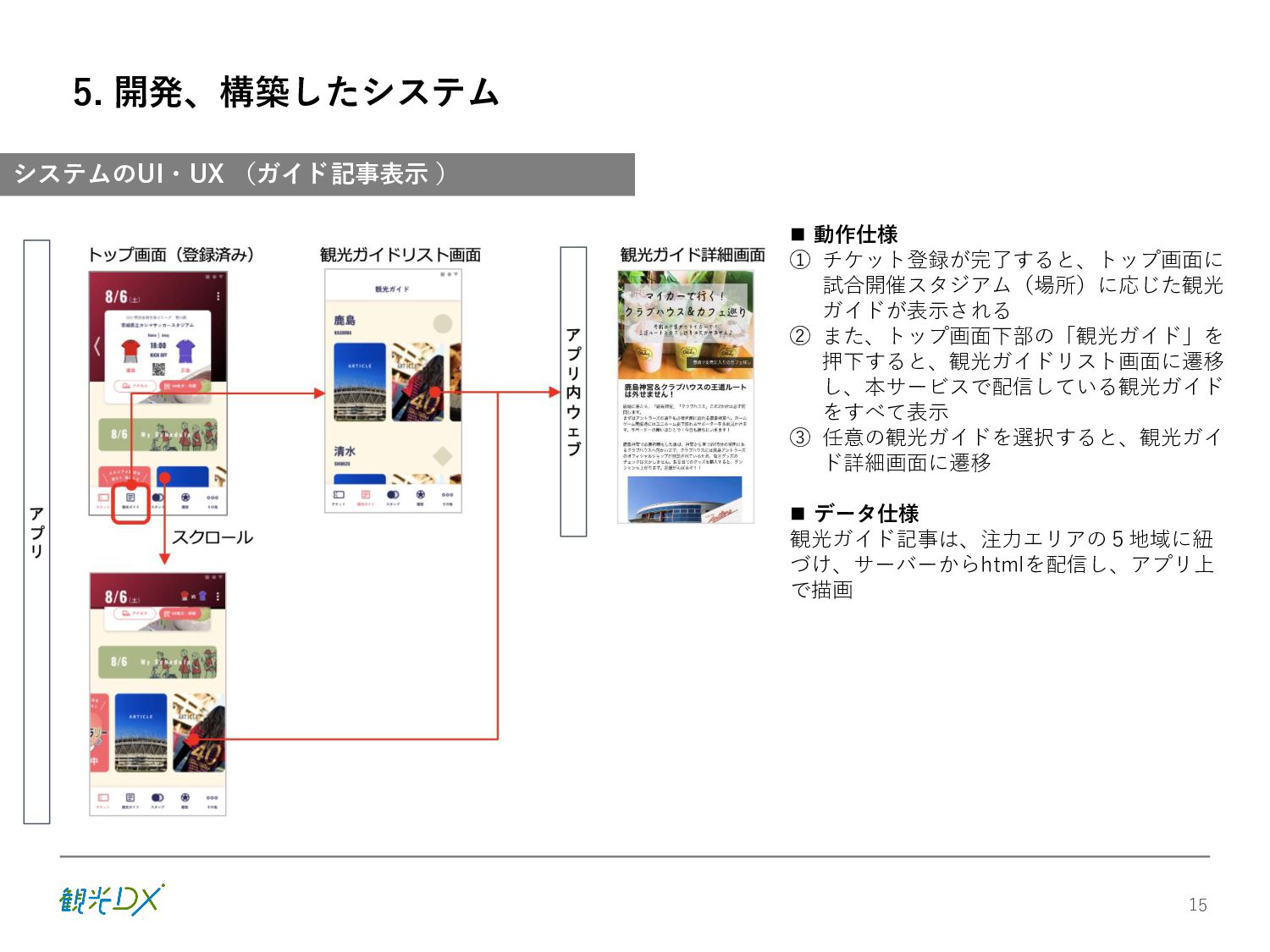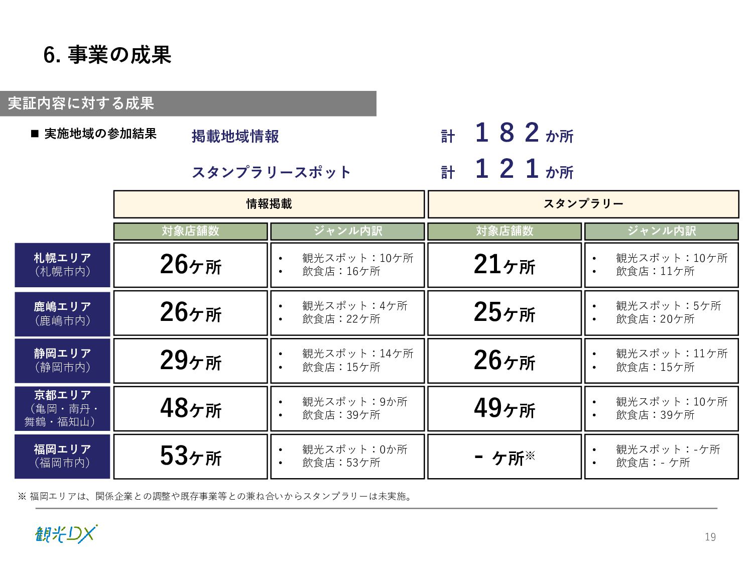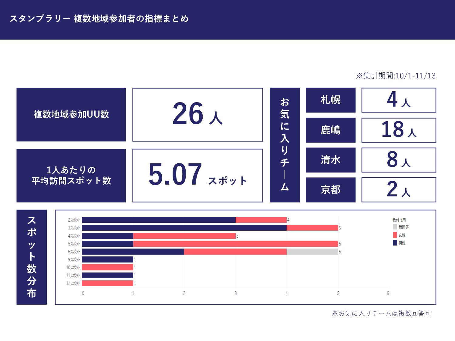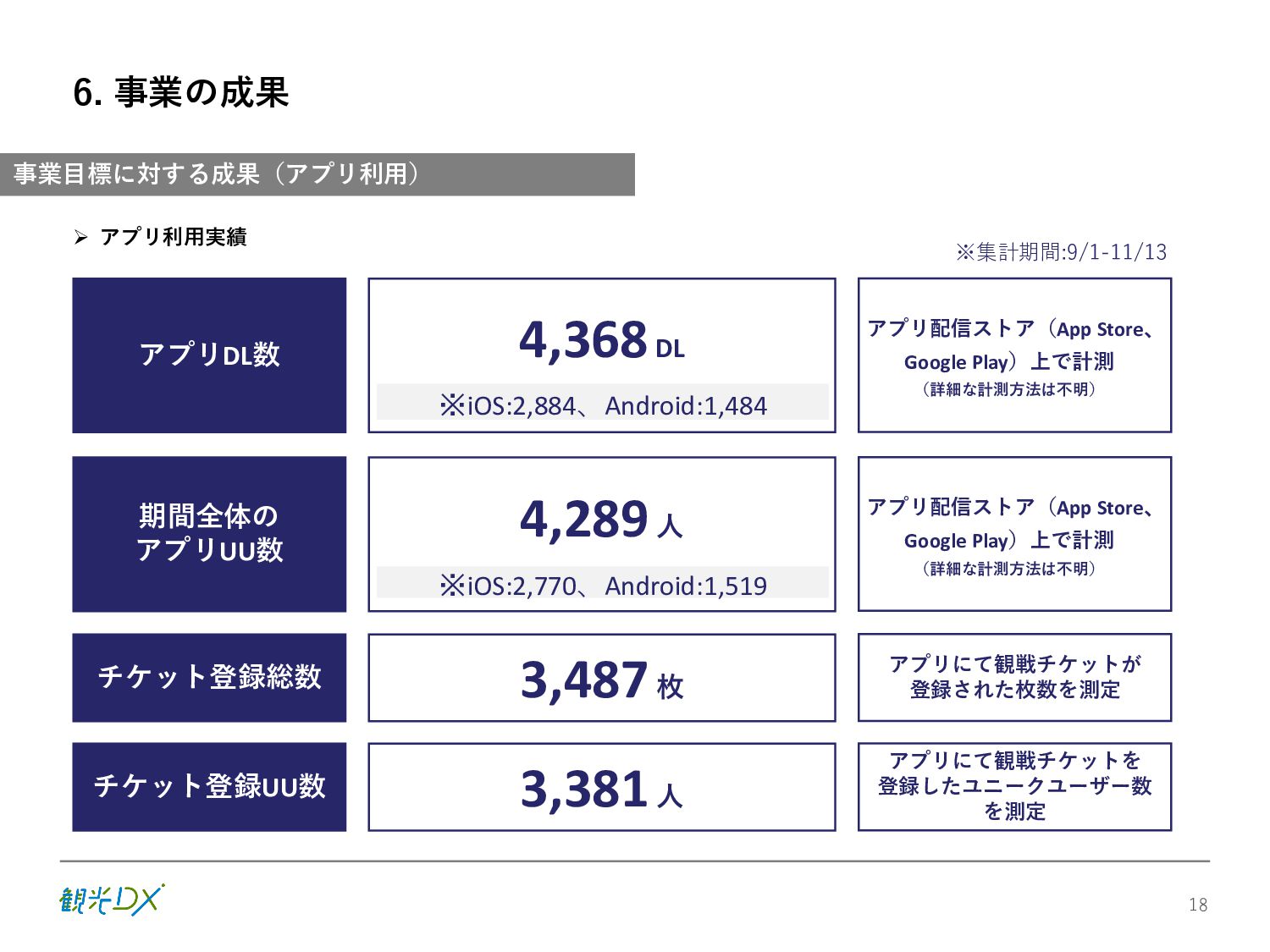 142 81 22% 117,410 827 1,450 茨城県 124 74 20% 110,982 895 1,500 千葉県 70 39 10% 53,469 764 1,371 神奈川県 42 25 7% 28,318 674 1,133 埼玉県 40 21 6% 32,861 822 1,565 その他 49 27 7% 41,574 848 1,540 不明 143 108 29% 107,236 750 993 合計 610 375 100% 491,850 806 1,312 2022年11月5日 東京都 296 180 26% 284,525 961 1,581 茨城県 218 123 18% 199,126 913 1,619 千葉県 130 72 11% 121,880 938 1,693 神奈川県 107 61 9% 96,829 905 1,587 埼玉県 41 26 4% 29,224 713 1,124 その他 85 57 8% 71,663 843 1,257 不明 241 165 24% 219,739 912 1,332 合計 1,118 684 100% 1,022,986 915 1,496 順位変動なし 増加傾向 大きな変化なし 実 施 前 実 施 後 ※ IDi数とは、Suica利用者数を意味する • 観戦者の居住地(都道府県)別で決済回数・IDi数※を集計すると、東京都、茨城県、千葉県、神奈川県、埼玉県が上 位5都県となっており、本取組実施前後で順位変動はなし。 • 各都県別での決済回数・IDi数・決済金額はそれぞれ増加傾向だが、決済金額(回数平均)・決済金額(IDi数平均)は本取 組前後で大きな変化なし。 アプリ内の情報配信等によって、特にこれまで地域内で購買を行っていなかった観戦者(潜在顧客)に対して、購 買促進効果があったと推測される。 ➢ 茨城県内での電子マネー決済状況(都道府県別) 鹿嶋エリアにおける電子マネー決済分析(2/3) 観光庁様・事務局様 本分析は、本コンソーシアム・再委託企 業が有する知的財産等を用いて行なった ものとなるため、外部に公表する際は、 事前に連絡・協議をお願いいたします。