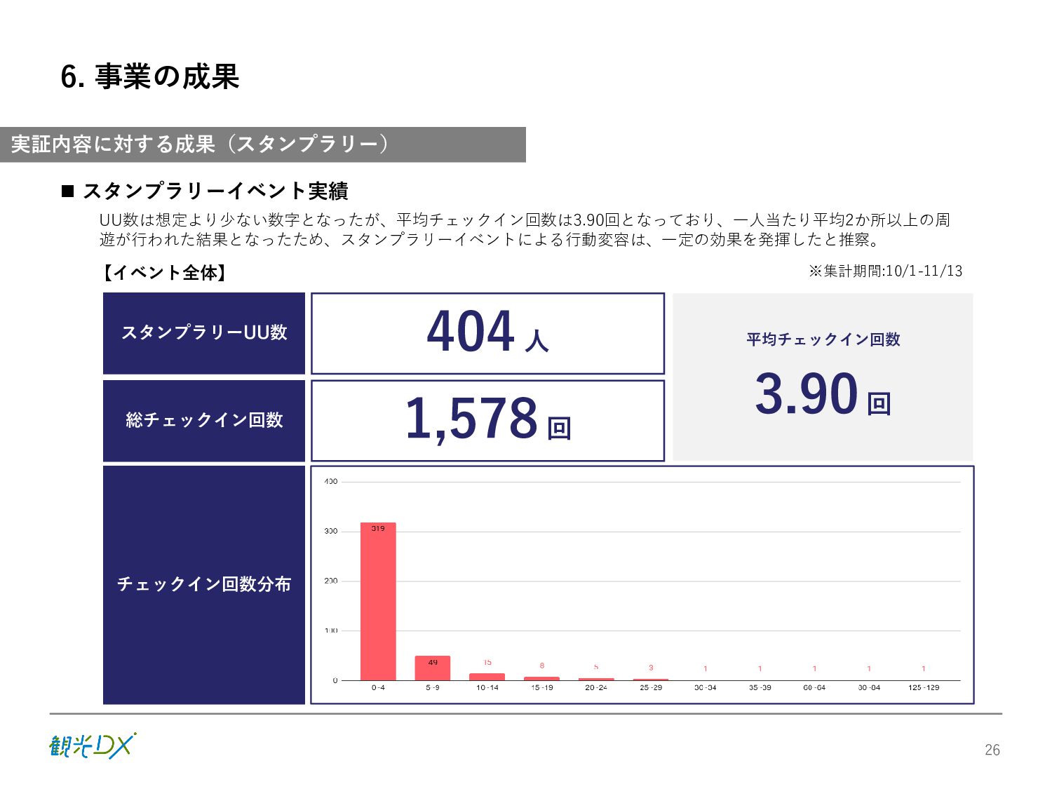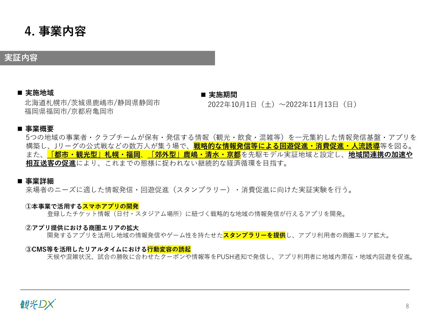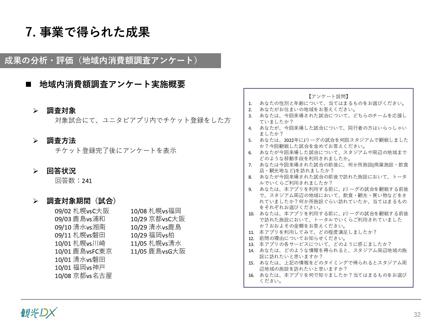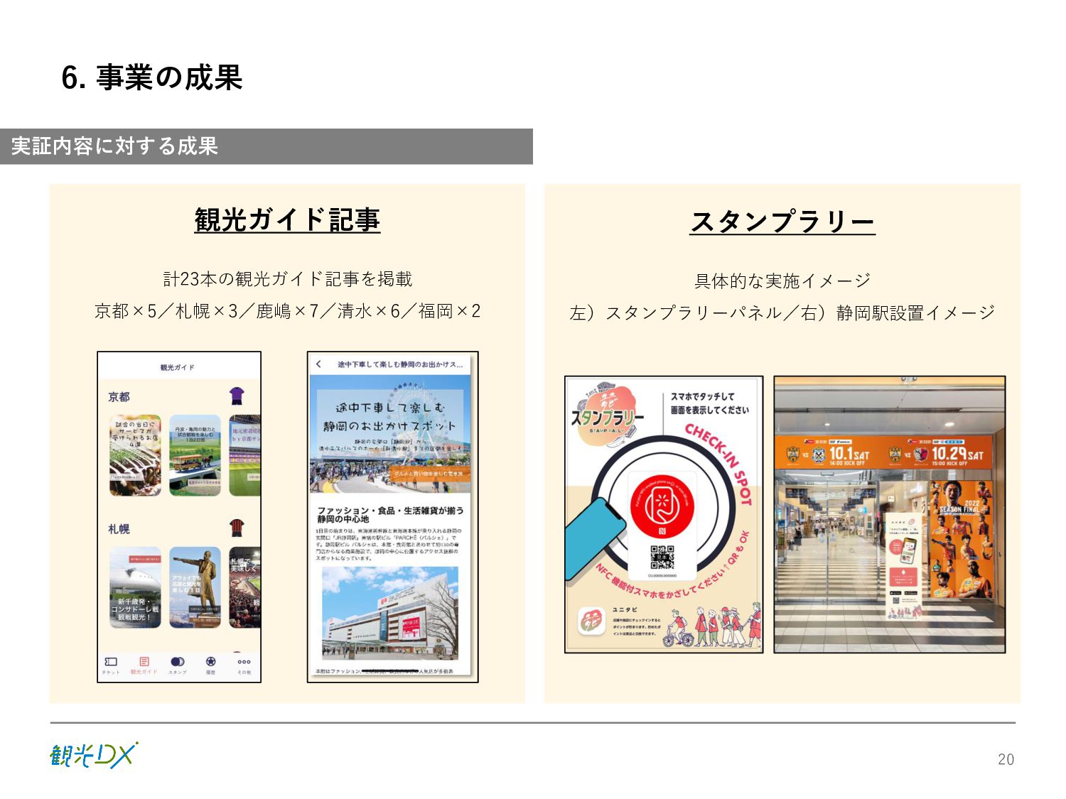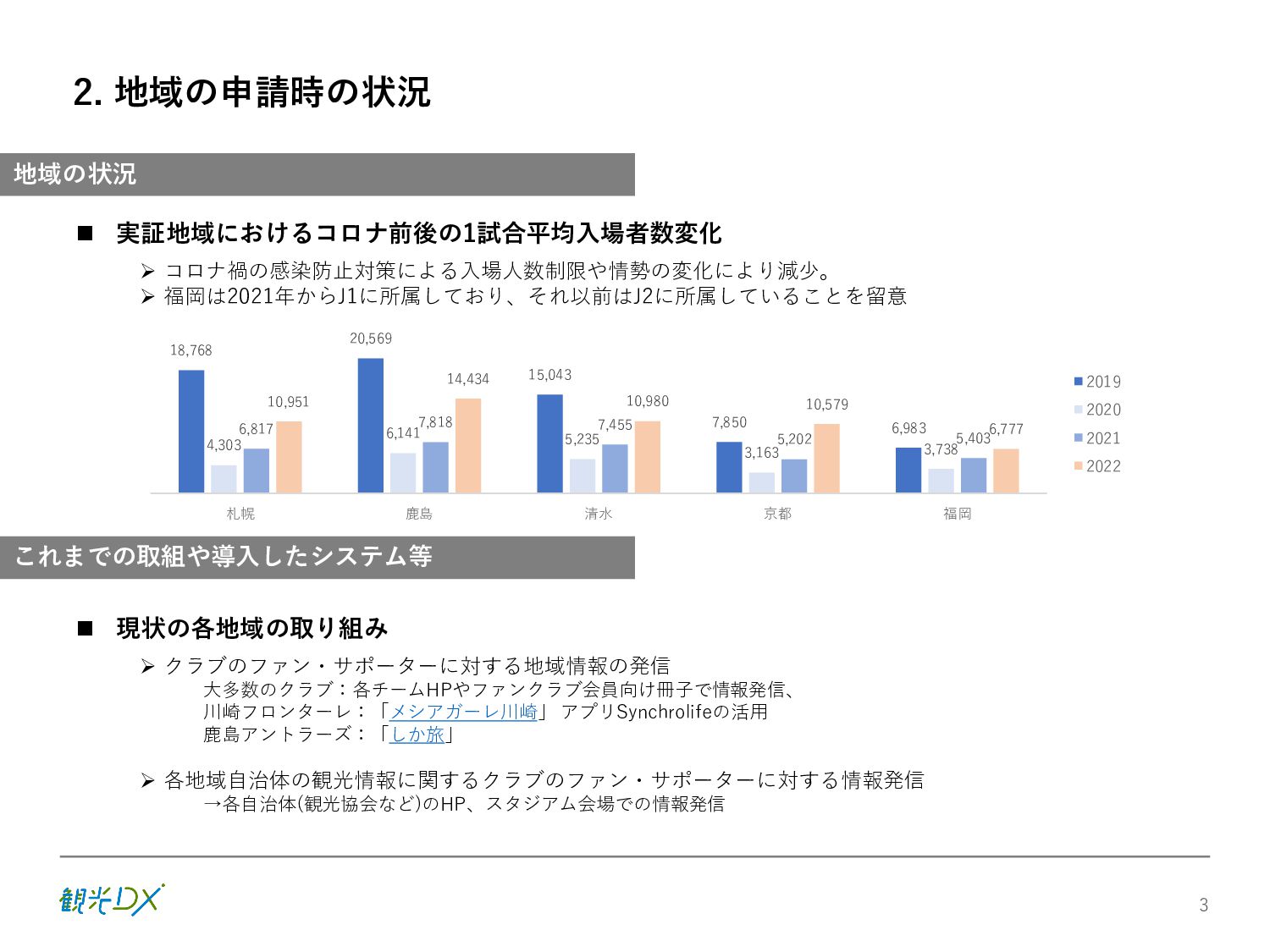 142 81 22% 117,410 827 1,450 茨城県 124 74 20% 110,982 895 1,500 千葉県 70 39 10% 53,469 764 1,371 神奈川県 42 25 7% 28,318 674 1,133 埼玉県 40 21 6% 32,861 822 1,565 その他 49 27 7% 41,574 848 1,540 不明 143 108 29% 107,236 750 993 合計 610 375 100% 491,850 806 1,312 2022年11月5日 東京都 296 180 26% 284,525 961 1,581 茨城県 218 123 18% 199,126 913 1,619 千葉県 130 72 11% 121,880 938 1,693 神奈川県 107 61 9% 96,829 905 1,587 埼玉県 41 26 4% 29,224 713 1,124 その他 85 57 8% 71,663 843 1,257 不明 241 165 24% 219,739 912 1,332 合計 1,118 684 100% 1,022,986 915 1,496 順位変動なし 増加傾向 大きな変化なし 実 施 前 実 施 後 ※ IDi数とは、Suica利用者数を意味する • 観戦者の居住地(都道府県)別で決済回数・IDi数※を集計すると、東京都、茨城県、千葉県、神奈川県、埼玉県が上 位5都県となっており、本取組実施前後で順位変動はなし。 • 各都県別での決済回数・IDi数・決済金額はそれぞれ増加傾向だが、決済金額(回数平均)・決済金額(IDi数平均)は本取 組前後で大きな変化なし。 アプリ内の情報配信等によって、特にこれまで地域内で購買を行っていなかった観戦者(潜在顧客)に対して、購 買促進効果があったと推測される。 ➢ 茨城県内での電子マネー決済状況(都道府県別) 鹿嶋エリアにおける電子マネー決済分析(2/3) 観光庁様・事務局様 本分析は、本コンソーシアム・再委託企 業が有する知的財産等を用いて行なった ものとなるため、外部に公表する際は、 事前に連絡・協議をお願いいたします。