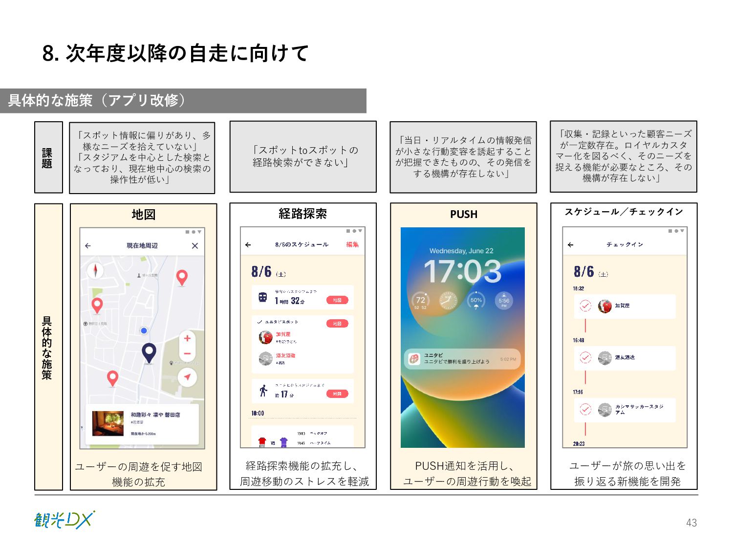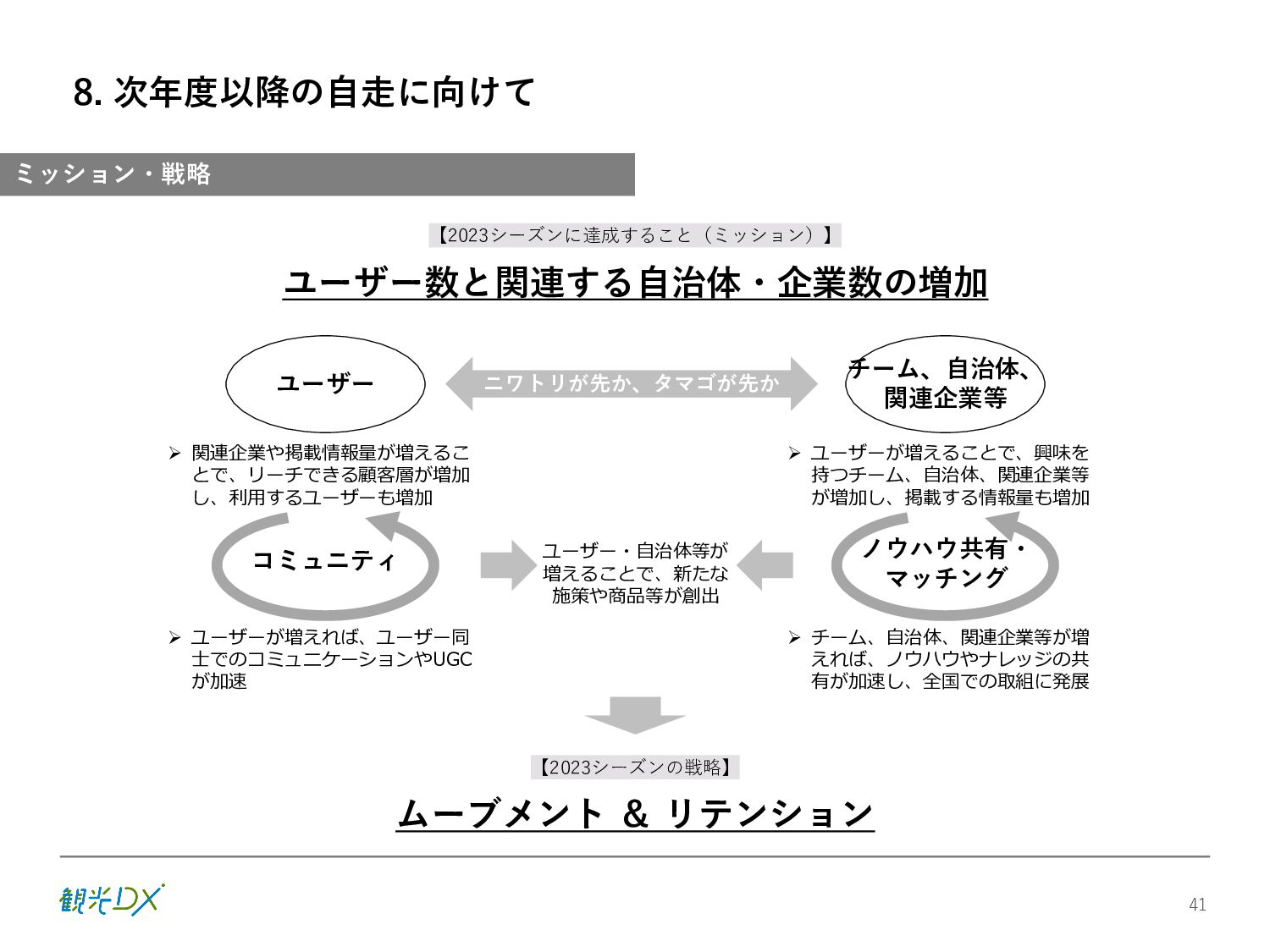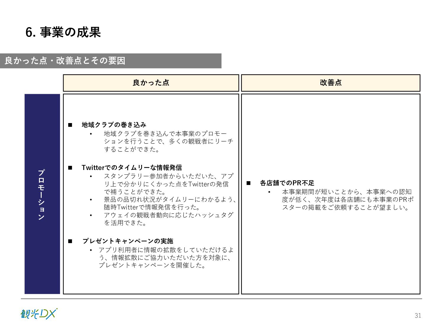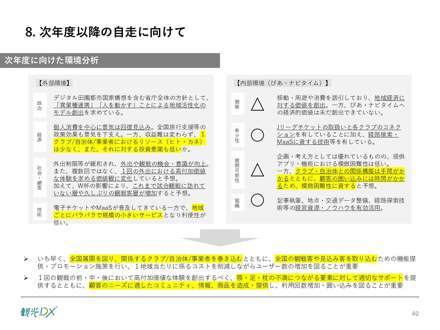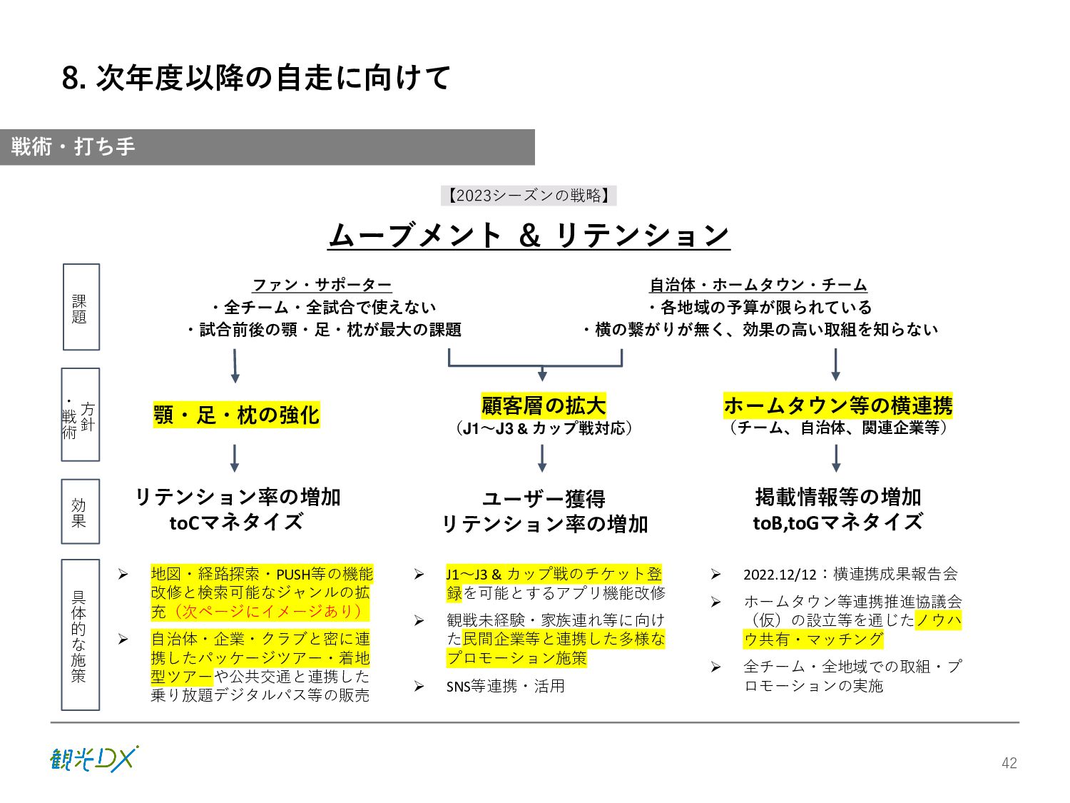 142 81 22% 117,410 827 1,450 茨城県 124 74 20% 110,982 895 1,500 千葉県 70 39 10% 53,469 764 1,371 神奈川県 42 25 7% 28,318 674 1,133 埼玉県 40 21 6% 32,861 822 1,565 その他 49 27 7% 41,574 848 1,540 不明 143 108 29% 107,236 750 993 合計 610 375 100% 491,850 806 1,312 2022年11月5日 東京都 296 180 26% 284,525 961 1,581 茨城県 218 123 18% 199,126 913 1,619 千葉県 130 72 11% 121,880 938 1,693 神奈川県 107 61 9% 96,829 905 1,587 埼玉県 41 26 4% 29,224 713 1,124 その他 85 57 8% 71,663 843 1,257 不明 241 165 24% 219,739 912 1,332 合計 1,118 684 100% 1,022,986 915 1,496 順位変動なし 増加傾向 大きな変化なし 実 施 前 実 施 後 ※ IDi数とは、Suica利用者数を意味する • 観戦者の居住地(都道府県)別で決済回数・IDi数※を集計すると、東京都、茨城県、千葉県、神奈川県、埼玉県が上 位5都県となっており、本取組実施前後で順位変動はなし。 • 各都県別での決済回数・IDi数・決済金額はそれぞれ増加傾向だが、決済金額(回数平均)・決済金額(IDi数平均)は本取 組前後で大きな変化なし。 アプリ内の情報配信等によって、特にこれまで地域内で購買を行っていなかった観戦者(潜在顧客)に対して、購 買促進効果があったと推測される。 ➢ 茨城県内での電子マネー決済状況(都道府県別) 鹿嶋エリアにおける電子マネー決済分析(2/3) 観光庁様・事務局様 本分析は、本コンソーシアム・再委託企 業が有する知的財産等を用いて行なった ものとなるため、外部に公表する際は、 事前に連絡・協議をお願いいたします。