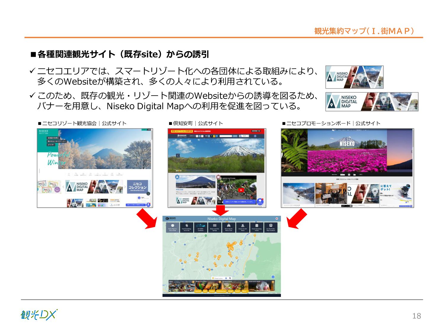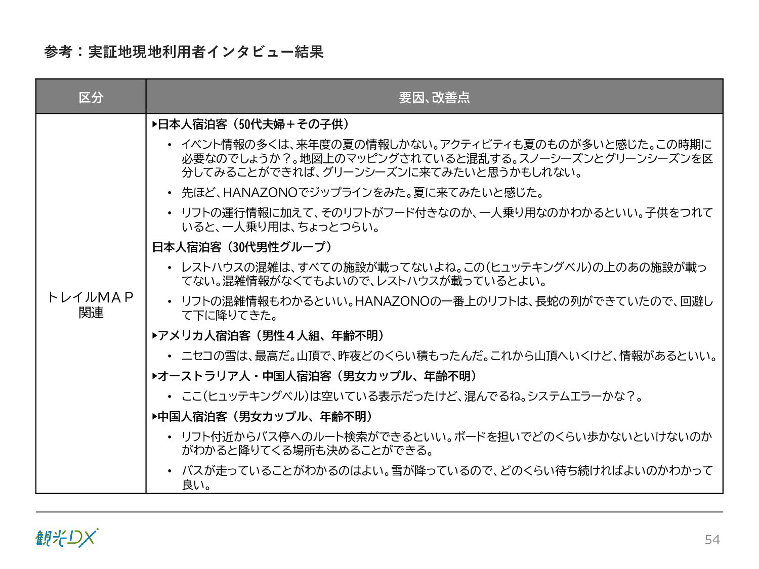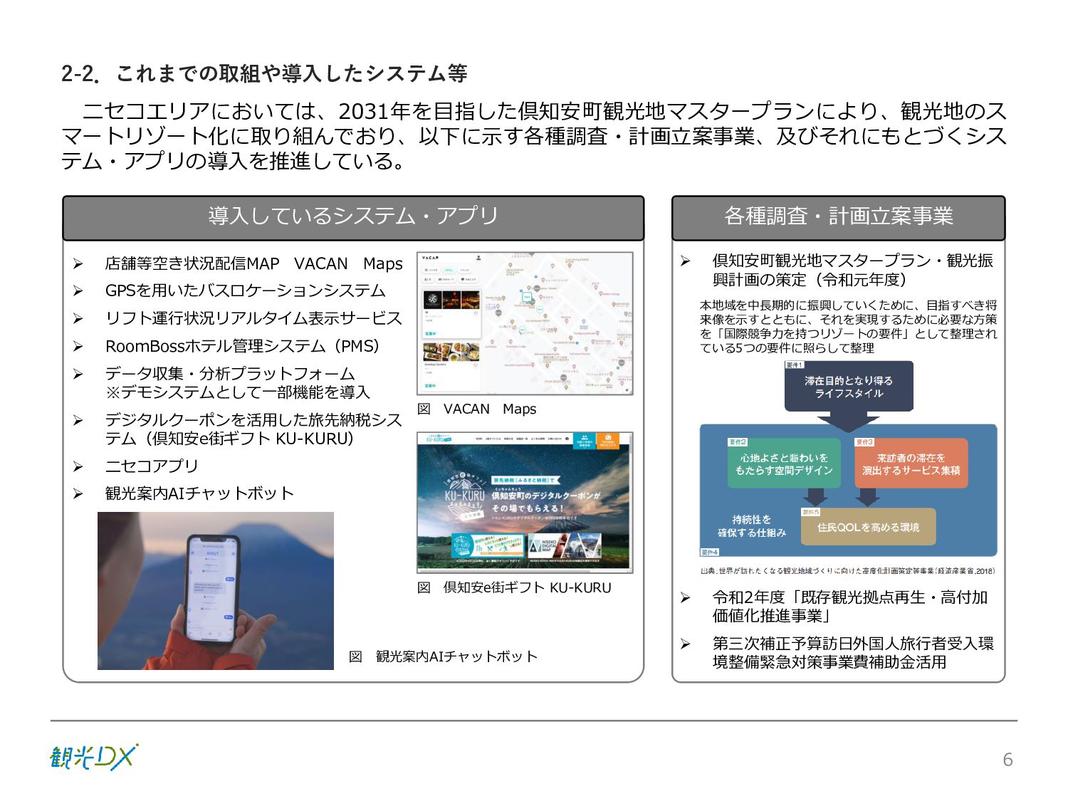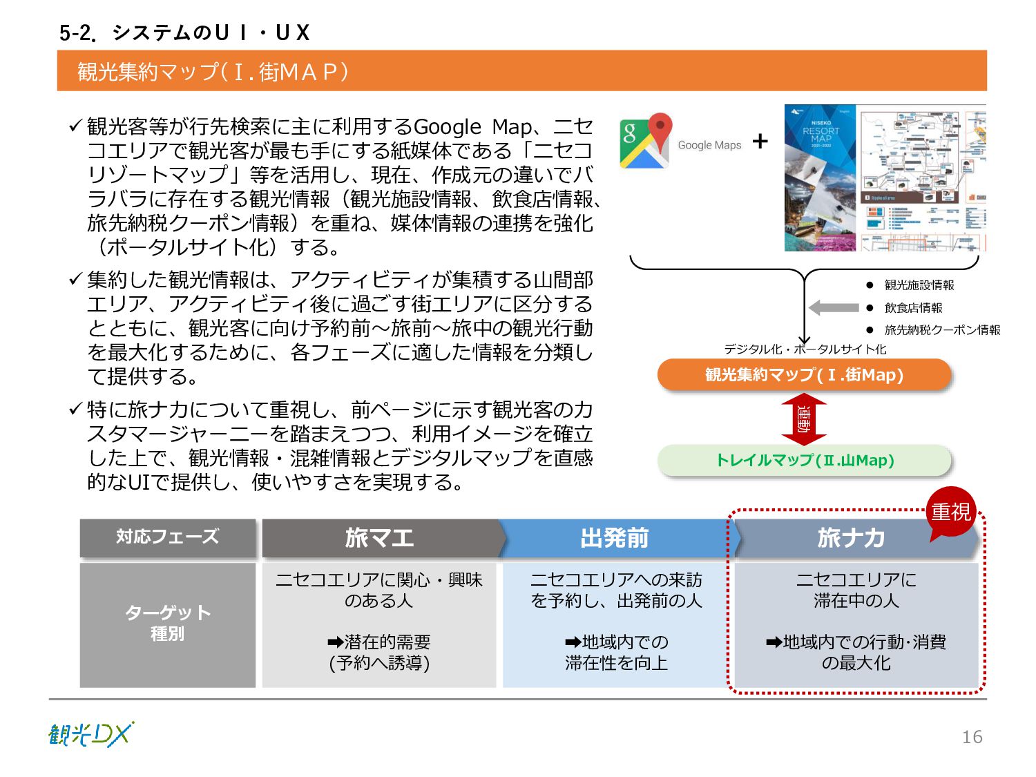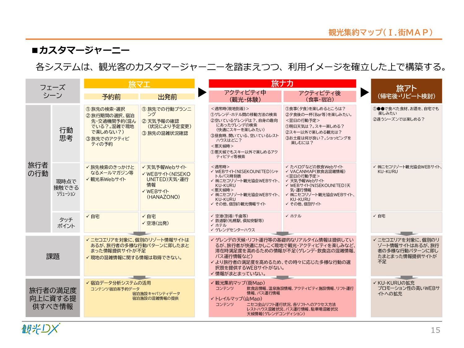 シーン 旅行者 の行動 ① 旅先の検索・選択 ② 旅行期間の選択、宿泊 先・交通機関予約(混ん でいる?。混雑で現地 で楽しめない?) ③ 旅先でのアクティビ ティの予約 ① 旅先での行動プランニ ング ② 天気予報の確認 (状況により予定変更) ③ 旅先の混雑状況確認 行動 思考 現時点で 接触できる ソリューション ✓ 旅先検索のきっかけと なるメールマガジン等 ✓ 観光系Webサイト ✓ 天気予報Webサイト ✓ WEBサイト(NISEKO UNITED)天気・運行 情報 ✓ WEBサイト (HANAZONO) 旅ナカ アクティビティ中 (観光・体験) アクティビティ後 (食事・宿泊) <通常時(現地到着)> ①ゲレンデ・ホテル間の移動方法の検索 ②空いているゲレンデは?、自身の趣向 にあったゲレンデの検索 (快適にスキーを楽しみたい) ③昼食時、開いている、空いているレスト ハウスはどこ? <悪天候時> ①悪天候でもスキー以外で楽しめるアク ティビティ等検索 ①食事(夕食)を楽しめるところは? ②夕食後の一杯(Bar等)を楽しみたい。 <翌日の行動予定> ①明日天気は?。スキー楽しめる? ②スキー以外で楽しめる観光は? ③お土産は何が良い?。ショッピングを 楽しむには? <通常時> ✓ WEBサイト(NISEKOUNITED)シャ トルバス時刻表 ✓ ㈱ニセコリゾート観光協会WEBサイト、 KU-KURU <悪天候時> ✓ ㈱ニセコリゾート観光協会WEBサイト、 KU-KURU ✓ その他、個別の観光情報サイト ✓ たべログなどの飲食Webサイト ✓ VACANMAP(飲食店混雑情報) <翌日の行動予定> ✓ 天気予報Webサイト ✓ WEBサイト(NISEKOUNITED)天 気・運行情報 ✓ ㈱ニセコリゾート観光協会WEBサイト、 KU-KURU ✓ その他、個別サイト 課題 タッチ ポイント ✓ 自宅 ✓ 自宅 ✓ 空港(出発) ✓ 空港(到着:千歳等) ✓ 鉄道駅(札幌駅、倶知安駅等) ✓ ホテル ✓ ゲレンデセンターハウス ✓ ホテル ✓ ニセコエリアを対象に、個別のリゾート情報サイトは あるが、旅行者の多様な行動パターンに即したまと まった情報提供サイトが不足 ✓ 現地の混雑情報に関する情報は取得できない。 ✓ ゲレンデの天候・リフト運行等の基礎的なリアルタイム情報は提供してい るが、旅行者が快適にかしこく現地で観光・アクティビティを楽しみなど、 滞在時満足度を高めるための情報が不足(ゲレンデ・飲食店の混雑情報、 バス運行情報など) ✓ より旅行者の満足度を高めるため、その時々に応じた多様な行動の選 択肢を提供するWEBサイトがない。 ✓ 情報がまとまっていない。 ①••で食べた食材、お酒を、自宅でも 楽しみたい ②違うシーズンでは楽しめる? 旅行者の満足度 向上に資する提 供すべき情報 ✓ ㈱ニセコリゾート観光協会WEBサイト、 KU-KURU ✓ 自宅 ✓ ニセコエリアを対象に、個別のリ ゾート情報サイトはあるが、旅行 者の多様な行動パターンに即し たまとまった情報提供サイトが 不足 ✓ 観光集約マップ(街Map) コンテンツ 飲食店情報、温泉施設情報、アクティビティ施設情報、リフト運行 情報、バス運行情報 ✓ トレイルマップ(山Map) コンテンツ ニセコ全山リフト運行状況、各リフトへのアクセス方法 レストハウス混雑状況、バス運行情報、駐車場混雑状況 天候情報(ゲレンデコンディション) ✓ 宿泊データ分析システムの活用 コンテンツ宿泊客予約データ 宿泊施設キャパシティデータ 宿泊施設の混雑情報の提供 ✓ KU-KURUの拡充 プロモーション性の高いWEBサ イトへの拡充 15 各システムは、観光客のカスタマージャーニーを踏まえつつ、利用イメージを確立した上で構築する。