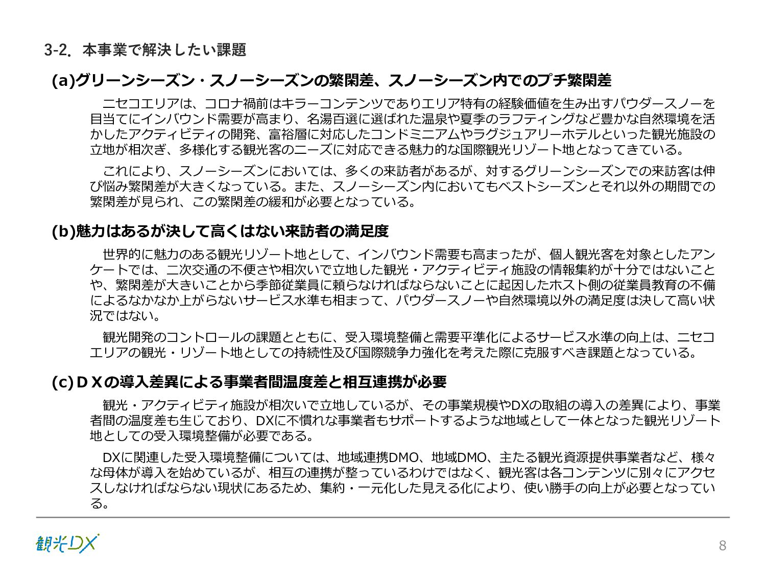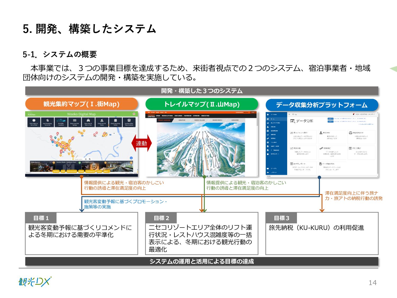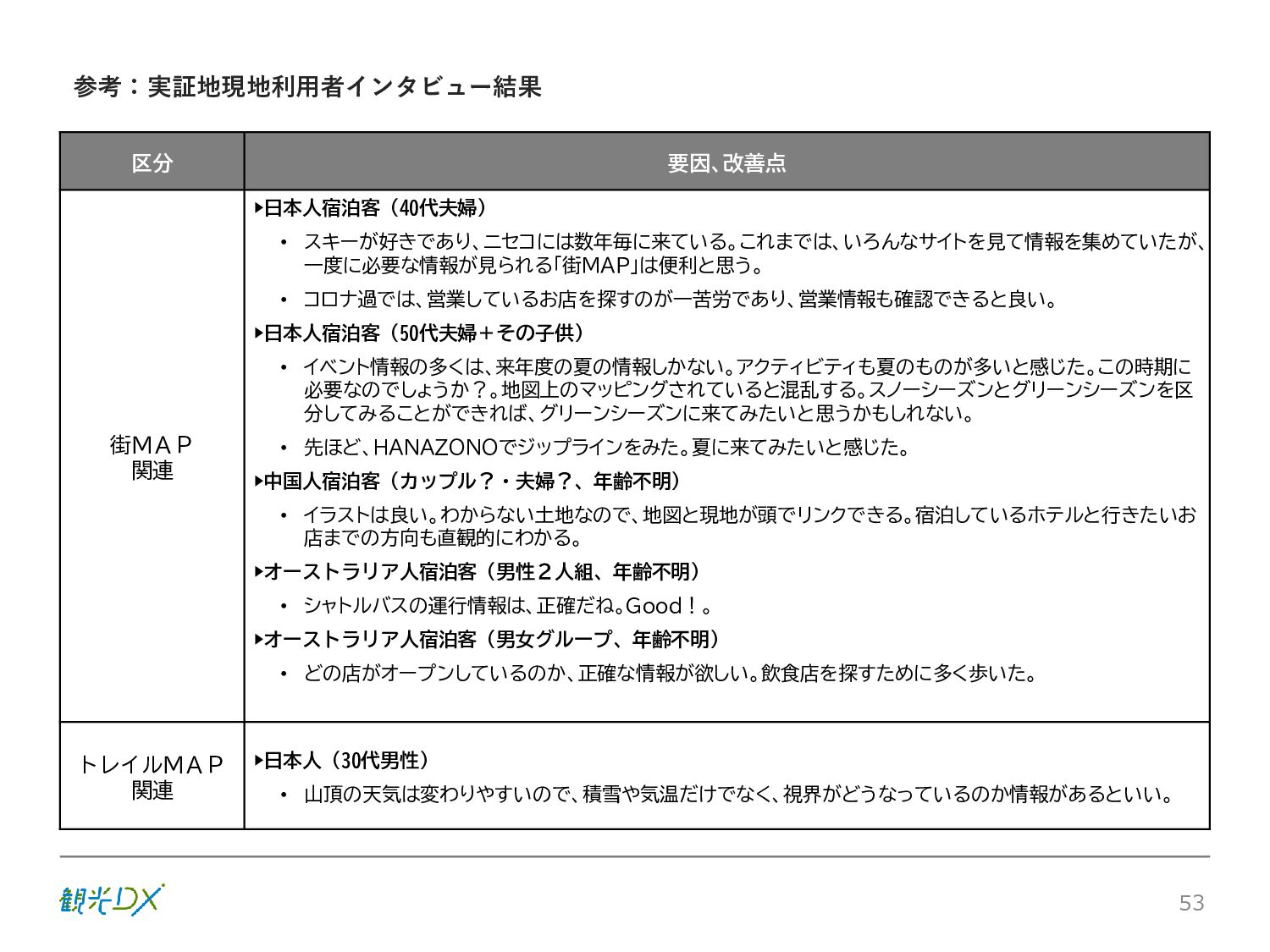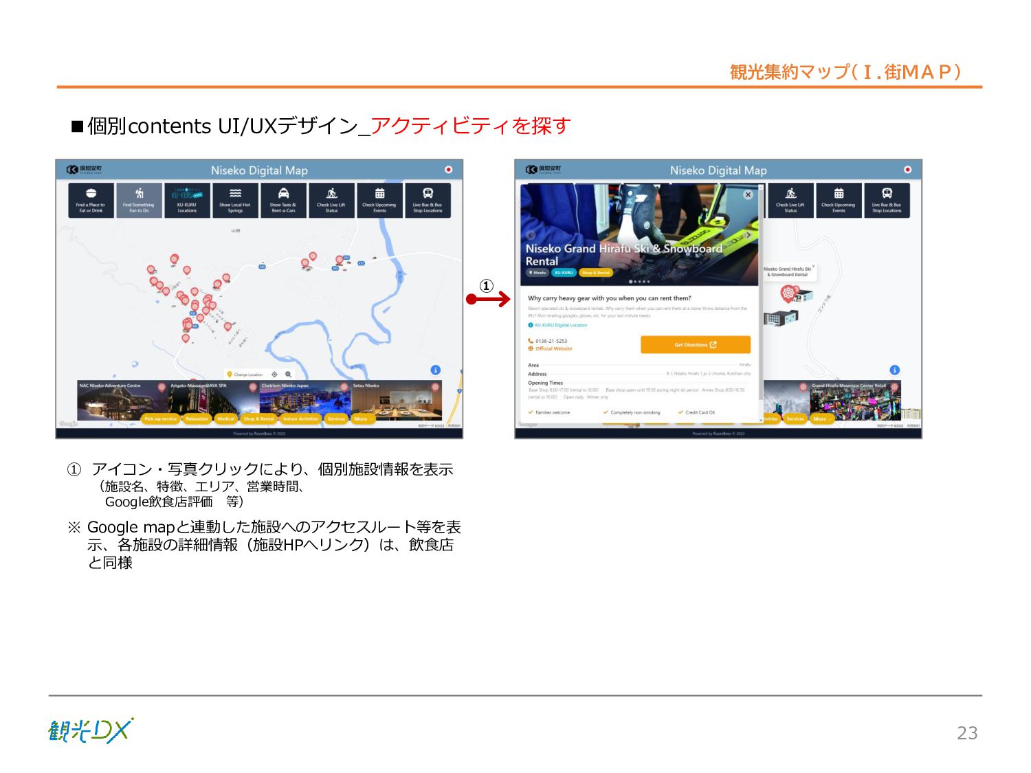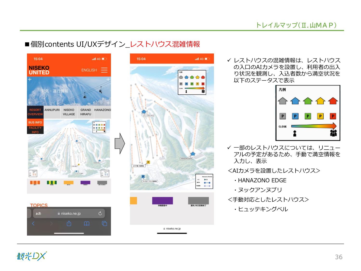 シーン 旅行者 の行動 ① 旅先の検索・選択 ② 旅行期間の選択、宿泊 先・交通機関予約(混ん でいる?。混雑で現地 で楽しめない?) ③ 旅先でのアクティビ ティの予約 ① 旅先での行動プランニ ング ② 天気予報の確認 (状況により予定変更) ③ 旅先の混雑状況確認 行動 思考 現時点で 接触できる ソリューション ✓ 旅先検索のきっかけと なるメールマガジン等 ✓ 観光系Webサイト ✓ 天気予報Webサイト ✓ WEBサイト(NISEKO UNITED)天気・運行 情報 ✓ WEBサイト (HANAZONO) 旅ナカ アクティビティ中 (観光・体験) アクティビティ後 (食事・宿泊) <通常時(現地到着)> ①ゲレンデ・ホテル間の移動方法の検索 ②空いているゲレンデは?、自身の趣向 にあったゲレンデの検索 (快適にスキーを楽しみたい) ③昼食時、開いている、空いているレスト ハウスはどこ? <悪天候時> ①悪天候でもスキー以外で楽しめるアク ティビティ等検索 ①食事(夕食)を楽しめるところは? ②夕食後の一杯(Bar等)を楽しみたい。 <翌日の行動予定> ①明日天気は?。スキー楽しめる? ②スキー以外で楽しめる観光は? ③お土産は何が良い?。ショッピングを 楽しむには? <通常時> ✓ WEBサイト(NISEKOUNITED)シャ トルバス時刻表 ✓ ㈱ニセコリゾート観光協会WEBサイト、 KU-KURU <悪天候時> ✓ ㈱ニセコリゾート観光協会WEBサイト、 KU-KURU ✓ その他、個別の観光情報サイト ✓ たべログなどの飲食Webサイト ✓ VACANMAP(飲食店混雑情報) <翌日の行動予定> ✓ 天気予報Webサイト ✓ WEBサイト(NISEKOUNITED)天 気・運行情報 ✓ ㈱ニセコリゾート観光協会WEBサイト、 KU-KURU ✓ その他、個別サイト 課題 タッチ ポイント ✓ 自宅 ✓ 自宅 ✓ 空港(出発) ✓ 空港(到着:千歳等) ✓ 鉄道駅(札幌駅、倶知安駅等) ✓ ホテル ✓ ゲレンデセンターハウス ✓ ホテル ✓ ニセコエリアを対象に、個別のリゾート情報サイトは あるが、旅行者の多様な行動パターンに即したまと まった情報提供サイトが不足 ✓ 現地の混雑情報に関する情報は取得できない。 ✓ ゲレンデの天候・リフト運行等の基礎的なリアルタイム情報は提供してい るが、旅行者が快適にかしこく現地で観光・アクティビティを楽しみなど、 滞在時満足度を高めるための情報が不足(ゲレンデ・飲食店の混雑情報、 バス運行情報など) ✓ より旅行者の満足度を高めるため、その時々に応じた多様な行動の選 択肢を提供するWEBサイトがない。 ✓ 情報がまとまっていない。 ①••で食べた食材、お酒を、自宅でも 楽しみたい ②違うシーズンでは楽しめる? 旅行者の満足度 向上に資する提 供すべき情報 ✓ ㈱ニセコリゾート観光協会WEBサイト、 KU-KURU ✓ 自宅 ✓ ニセコエリアを対象に、個別のリ ゾート情報サイトはあるが、旅行 者の多様な行動パターンに即し たまとまった情報提供サイトが 不足 ✓ 観光集約マップ(街Map) コンテンツ 飲食店情報、温泉施設情報、アクティビティ施設情報、リフト運行 情報、バス運行情報 ✓ トレイルマップ(山Map) コンテンツ ニセコ全山リフト運行状況、各リフトへのアクセス方法 レストハウス混雑状況、バス運行情報、駐車場混雑状況 天候情報(ゲレンデコンディション) ✓ 宿泊データ分析システムの活用 コンテンツ宿泊客予約データ 宿泊施設キャパシティデータ 宿泊施設の混雑情報の提供 ✓ KU-KURUの拡充 プロモーション性の高いWEBサ イトへの拡充 15 各システムは、観光客のカスタマージャーニーを踏まえつつ、利用イメージを確立した上で構築する。