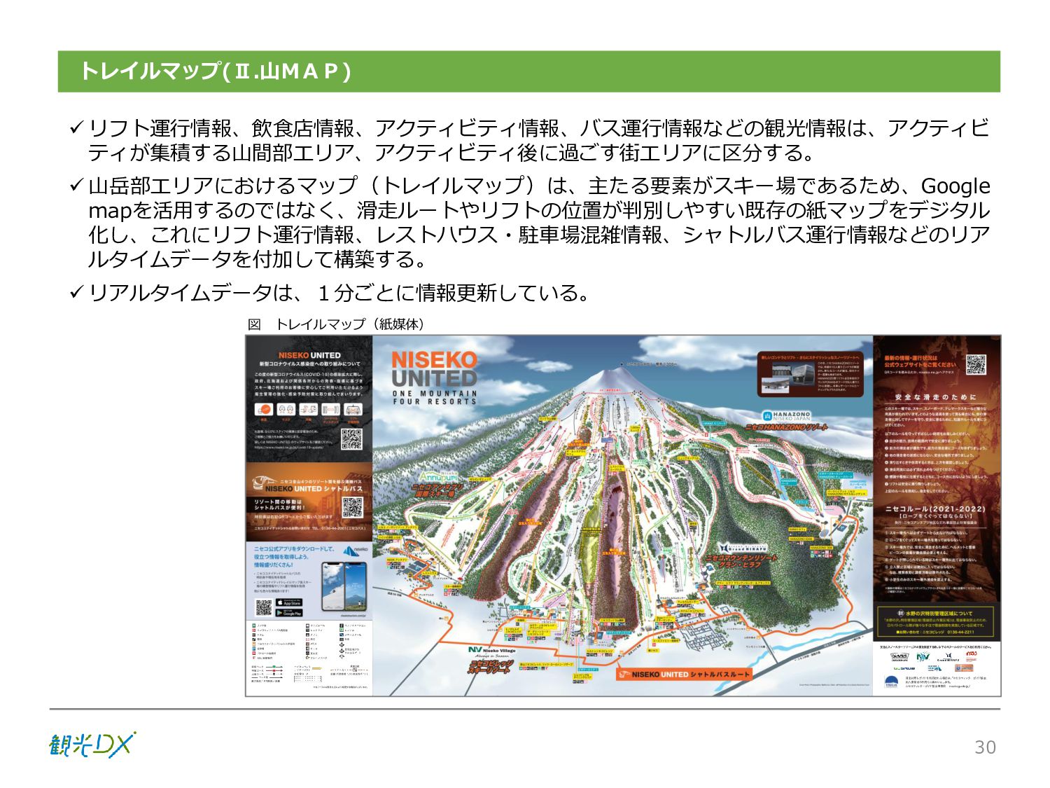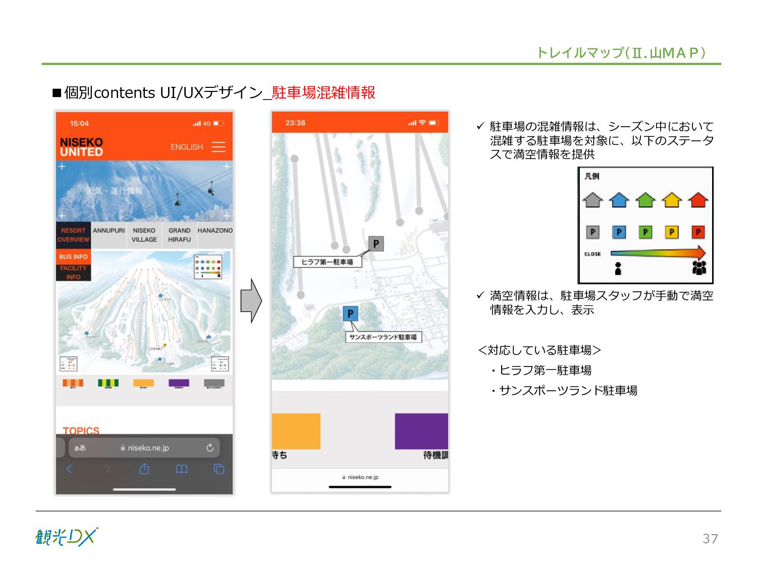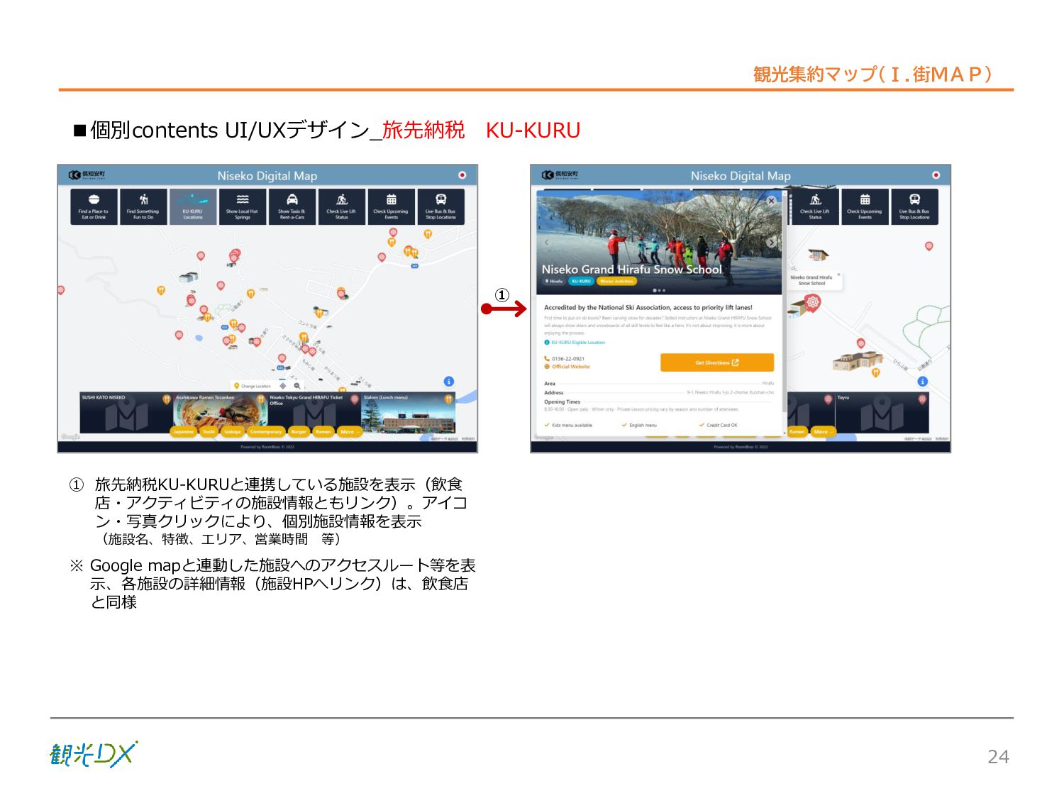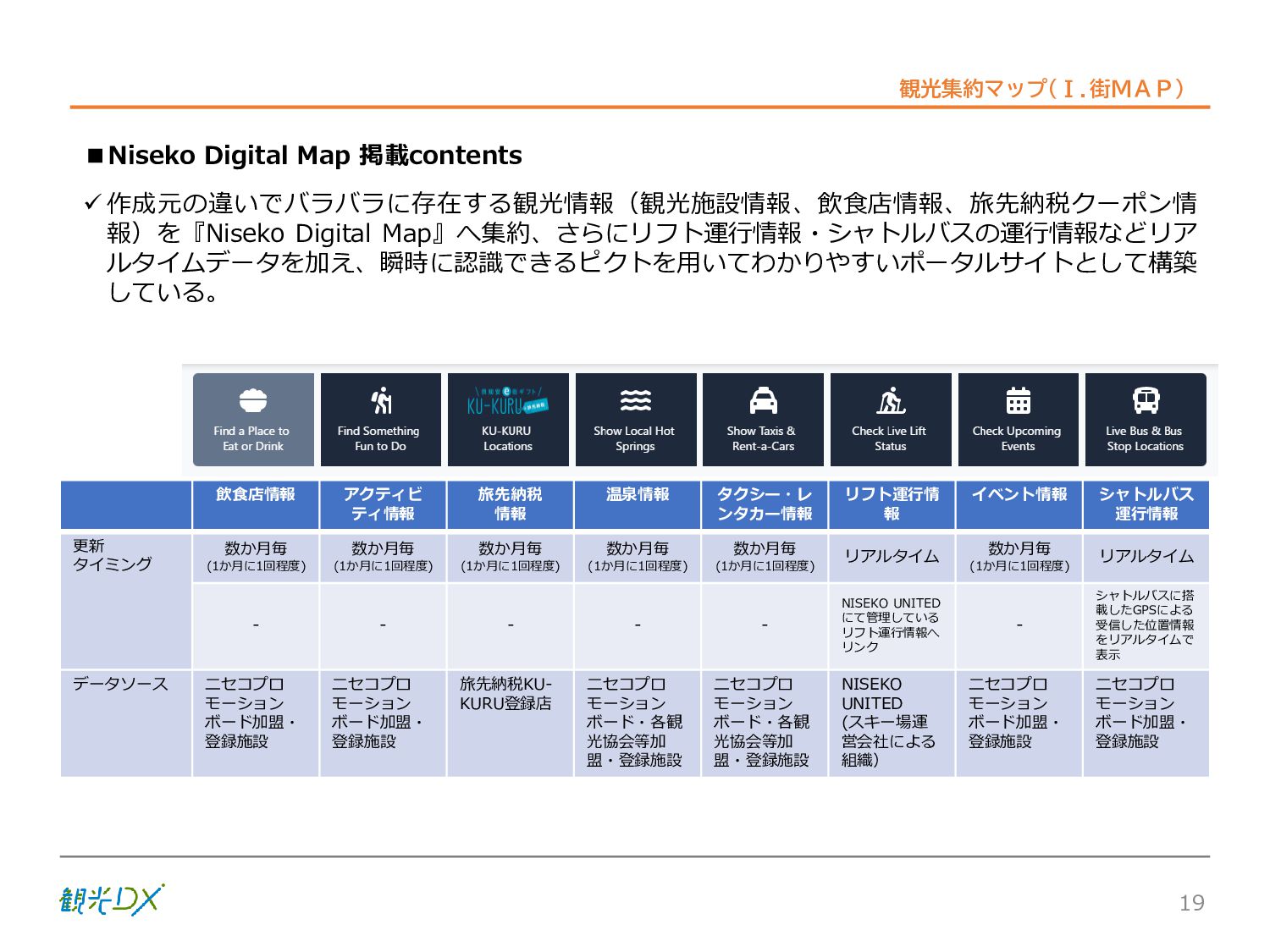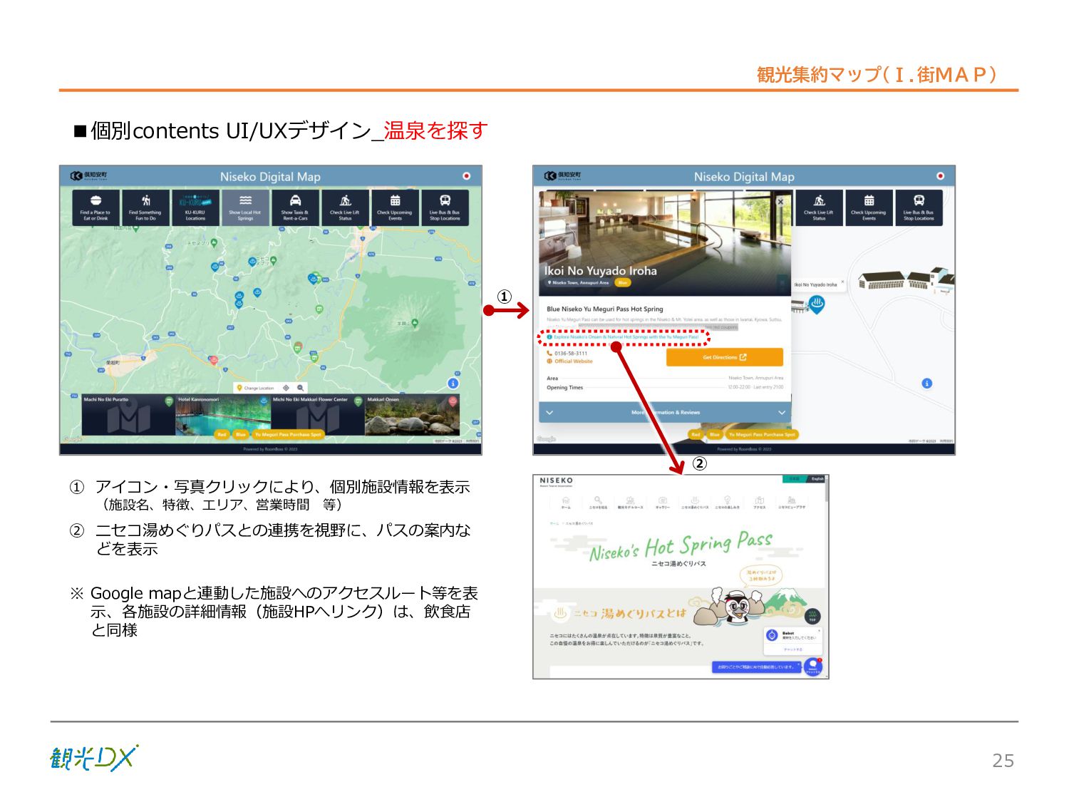 シーン 旅行者 の行動 ① 旅先の検索・選択 ② 旅行期間の選択、宿泊 先・交通機関予約(混ん でいる?。混雑で現地 で楽しめない?) ③ 旅先でのアクティビ ティの予約 ① 旅先での行動プランニ ング ② 天気予報の確認 (状況により予定変更) ③ 旅先の混雑状況確認 行動 思考 現時点で 接触できる ソリューション ✓ 旅先検索のきっかけと なるメールマガジン等 ✓ 観光系Webサイト ✓ 天気予報Webサイト ✓ WEBサイト(NISEKO UNITED)天気・運行 情報 ✓ WEBサイト (HANAZONO) 旅ナカ アクティビティ中 (観光・体験) アクティビティ後 (食事・宿泊) <通常時(現地到着)> ①ゲレンデ・ホテル間の移動方法の検索 ②空いているゲレンデは?、自身の趣向 にあったゲレンデの検索 (快適にスキーを楽しみたい) ③昼食時、開いている、空いているレスト ハウスはどこ? <悪天候時> ①悪天候でもスキー以外で楽しめるアク ティビティ等検索 ①食事(夕食)を楽しめるところは? ②夕食後の一杯(Bar等)を楽しみたい。 <翌日の行動予定> ①明日天気は?。スキー楽しめる? ②スキー以外で楽しめる観光は? ③お土産は何が良い?。ショッピングを 楽しむには? <通常時> ✓ WEBサイト(NISEKOUNITED)シャ トルバス時刻表 ✓ ㈱ニセコリゾート観光協会WEBサイト、 KU-KURU <悪天候時> ✓ ㈱ニセコリゾート観光協会WEBサイト、 KU-KURU ✓ その他、個別の観光情報サイト ✓ たべログなどの飲食Webサイト ✓ VACANMAP(飲食店混雑情報) <翌日の行動予定> ✓ 天気予報Webサイト ✓ WEBサイト(NISEKOUNITED)天 気・運行情報 ✓ ㈱ニセコリゾート観光協会WEBサイト、 KU-KURU ✓ その他、個別サイト 課題 タッチ ポイント ✓ 自宅 ✓ 自宅 ✓ 空港(出発) ✓ 空港(到着:千歳等) ✓ 鉄道駅(札幌駅、倶知安駅等) ✓ ホテル ✓ ゲレンデセンターハウス ✓ ホテル ✓ ニセコエリアを対象に、個別のリゾート情報サイトは あるが、旅行者の多様な行動パターンに即したまと まった情報提供サイトが不足 ✓ 現地の混雑情報に関する情報は取得できない。 ✓ ゲレンデの天候・リフト運行等の基礎的なリアルタイム情報は提供してい るが、旅行者が快適にかしこく現地で観光・アクティビティを楽しみなど、 滞在時満足度を高めるための情報が不足(ゲレンデ・飲食店の混雑情報、 バス運行情報など) ✓ より旅行者の満足度を高めるため、その時々に応じた多様な行動の選 択肢を提供するWEBサイトがない。 ✓ 情報がまとまっていない。 ①••で食べた食材、お酒を、自宅でも 楽しみたい ②違うシーズンでは楽しめる? 旅行者の満足度 向上に資する提 供すべき情報 ✓ ㈱ニセコリゾート観光協会WEBサイト、 KU-KURU ✓ 自宅 ✓ ニセコエリアを対象に、個別のリ ゾート情報サイトはあるが、旅行 者の多様な行動パターンに即し たまとまった情報提供サイトが 不足 ✓ 観光集約マップ(街Map) コンテンツ 飲食店情報、温泉施設情報、アクティビティ施設情報、リフト運行 情報、バス運行情報 ✓ トレイルマップ(山Map) コンテンツ ニセコ全山リフト運行状況、各リフトへのアクセス方法 レストハウス混雑状況、バス運行情報、駐車場混雑状況 天候情報(ゲレンデコンディション) ✓ 宿泊データ分析システムの活用 コンテンツ宿泊客予約データ 宿泊施設キャパシティデータ 宿泊施設の混雑情報の提供 ✓ KU-KURUの拡充 プロモーション性の高いWEBサ イトへの拡充 15 各システムは、観光客のカスタマージャーニーを踏まえつつ、利用イメージを確立した上で構築する。
