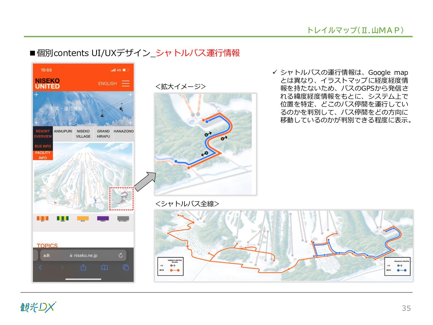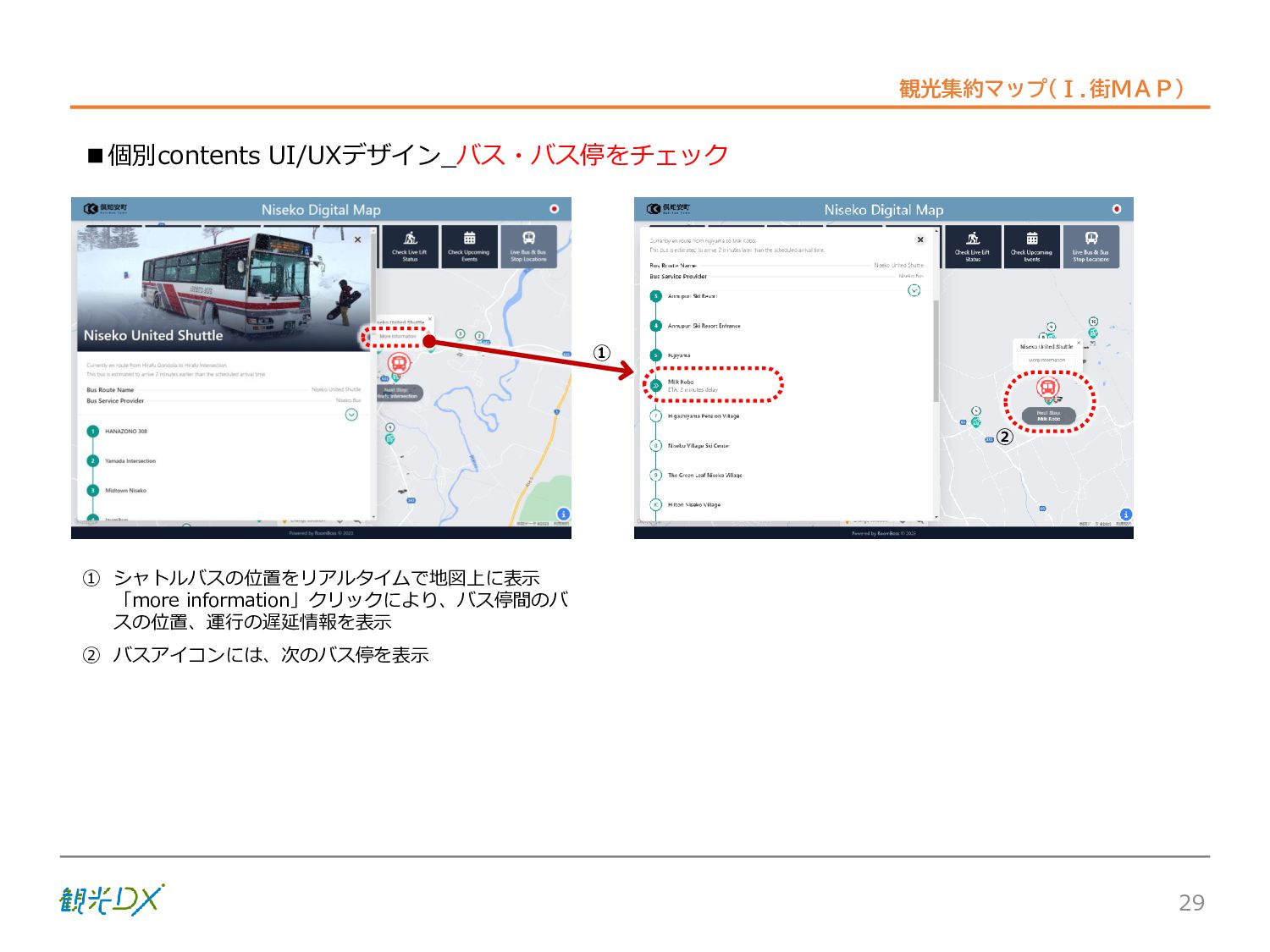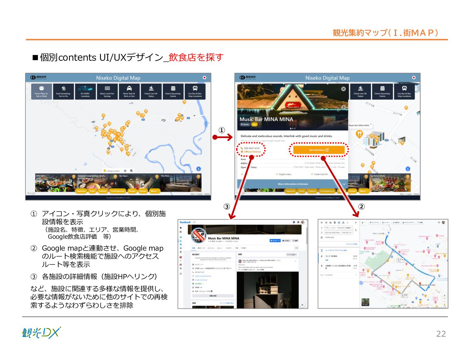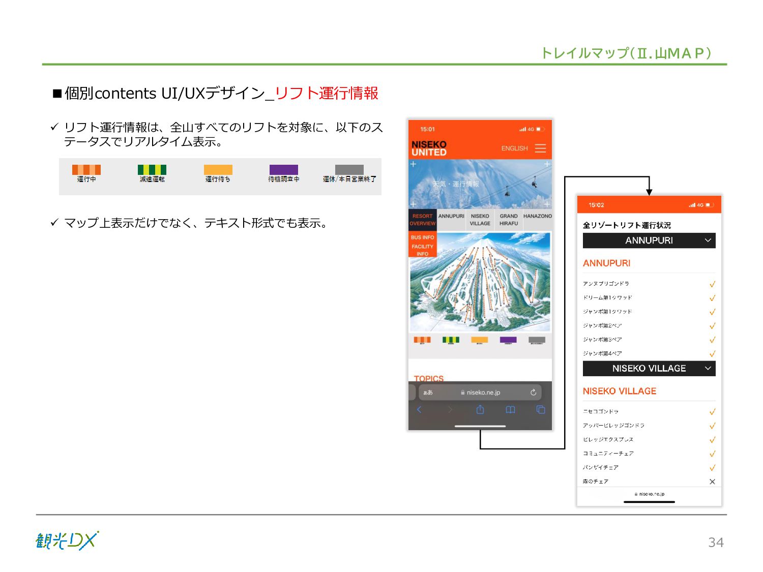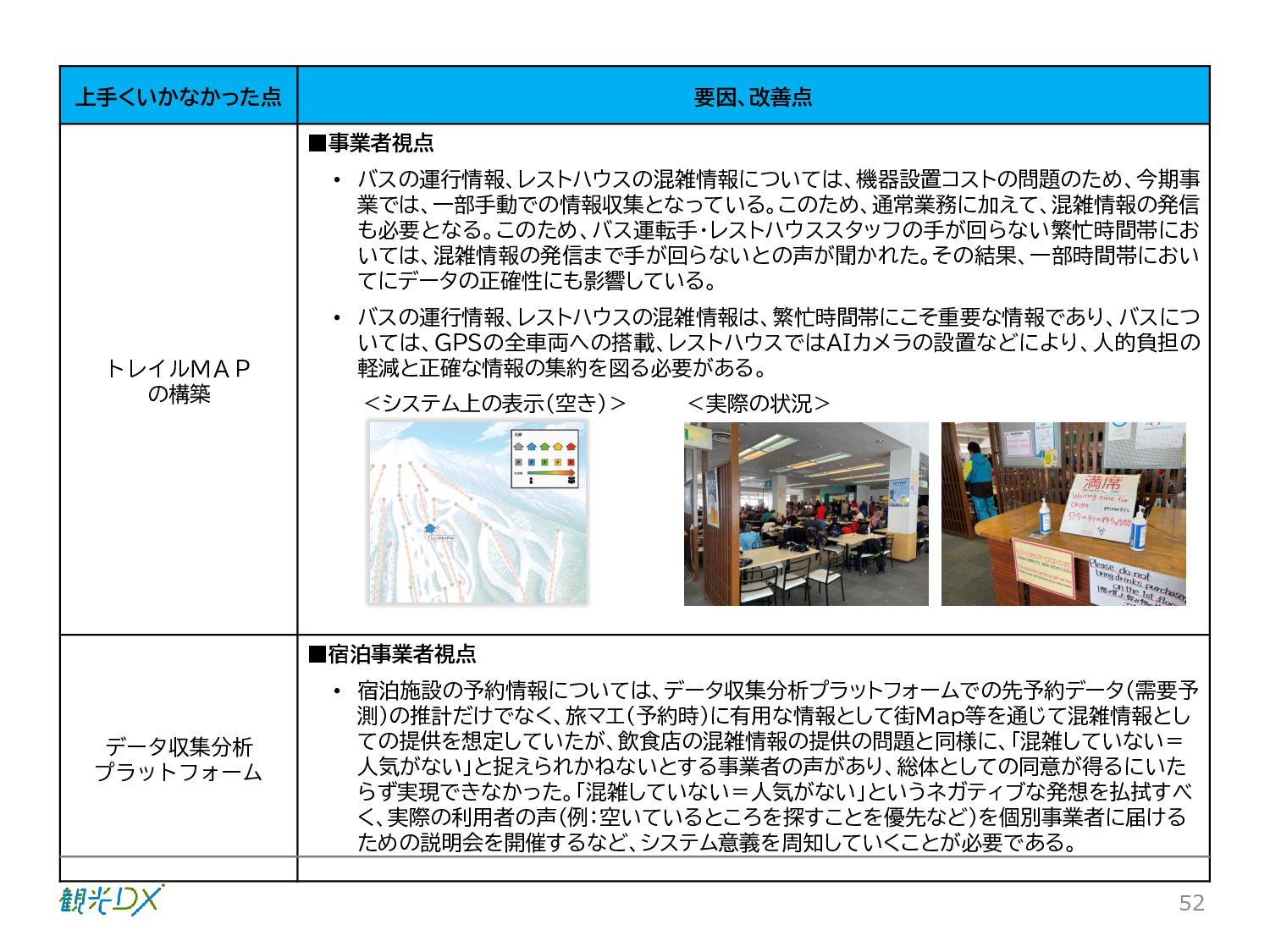 シーン 旅行者 の行動 ① 旅先の検索・選択 ② 旅行期間の選択、宿泊 先・交通機関予約(混ん でいる?。混雑で現地 で楽しめない?) ③ 旅先でのアクティビ ティの予約 ① 旅先での行動プランニ ング ② 天気予報の確認 (状況により予定変更) ③ 旅先の混雑状況確認 行動 思考 現時点で 接触できる ソリューション ✓ 旅先検索のきっかけと なるメールマガジン等 ✓ 観光系Webサイト ✓ 天気予報Webサイト ✓ WEBサイト(NISEKO UNITED)天気・運行 情報 ✓ WEBサイト (HANAZONO) 旅ナカ アクティビティ中 (観光・体験) アクティビティ後 (食事・宿泊) <通常時(現地到着)> ①ゲレンデ・ホテル間の移動方法の検索 ②空いているゲレンデは?、自身の趣向 にあったゲレンデの検索 (快適にスキーを楽しみたい) ③昼食時、開いている、空いているレスト ハウスはどこ? <悪天候時> ①悪天候でもスキー以外で楽しめるアク ティビティ等検索 ①食事(夕食)を楽しめるところは? ②夕食後の一杯(Bar等)を楽しみたい。 <翌日の行動予定> ①明日天気は?。スキー楽しめる? ②スキー以外で楽しめる観光は? ③お土産は何が良い?。ショッピングを 楽しむには? <通常時> ✓ WEBサイト(NISEKOUNITED)シャ トルバス時刻表 ✓ ㈱ニセコリゾート観光協会WEBサイト、 KU-KURU <悪天候時> ✓ ㈱ニセコリゾート観光協会WEBサイト、 KU-KURU ✓ その他、個別の観光情報サイト ✓ たべログなどの飲食Webサイト ✓ VACANMAP(飲食店混雑情報) <翌日の行動予定> ✓ 天気予報Webサイト ✓ WEBサイト(NISEKOUNITED)天 気・運行情報 ✓ ㈱ニセコリゾート観光協会WEBサイト、 KU-KURU ✓ その他、個別サイト 課題 タッチ ポイント ✓ 自宅 ✓ 自宅 ✓ 空港(出発) ✓ 空港(到着:千歳等) ✓ 鉄道駅(札幌駅、倶知安駅等) ✓ ホテル ✓ ゲレンデセンターハウス ✓ ホテル ✓ ニセコエリアを対象に、個別のリゾート情報サイトは あるが、旅行者の多様な行動パターンに即したまと まった情報提供サイトが不足 ✓ 現地の混雑情報に関する情報は取得できない。 ✓ ゲレンデの天候・リフト運行等の基礎的なリアルタイム情報は提供してい るが、旅行者が快適にかしこく現地で観光・アクティビティを楽しみなど、 滞在時満足度を高めるための情報が不足(ゲレンデ・飲食店の混雑情報、 バス運行情報など) ✓ より旅行者の満足度を高めるため、その時々に応じた多様な行動の選 択肢を提供するWEBサイトがない。 ✓ 情報がまとまっていない。 ①••で食べた食材、お酒を、自宅でも 楽しみたい ②違うシーズンでは楽しめる? 旅行者の満足度 向上に資する提 供すべき情報 ✓ ㈱ニセコリゾート観光協会WEBサイト、 KU-KURU ✓ 自宅 ✓ ニセコエリアを対象に、個別のリ ゾート情報サイトはあるが、旅行 者の多様な行動パターンに即し たまとまった情報提供サイトが 不足 ✓ 観光集約マップ(街Map) コンテンツ 飲食店情報、温泉施設情報、アクティビティ施設情報、リフト運行 情報、バス運行情報 ✓ トレイルマップ(山Map) コンテンツ ニセコ全山リフト運行状況、各リフトへのアクセス方法 レストハウス混雑状況、バス運行情報、駐車場混雑状況 天候情報(ゲレンデコンディション) ✓ 宿泊データ分析システムの活用 コンテンツ宿泊客予約データ 宿泊施設キャパシティデータ 宿泊施設の混雑情報の提供 ✓ KU-KURUの拡充 プロモーション性の高いWEBサ イトへの拡充 15 各システムは、観光客のカスタマージャーニーを踏まえつつ、利用イメージを確立した上で構築する。