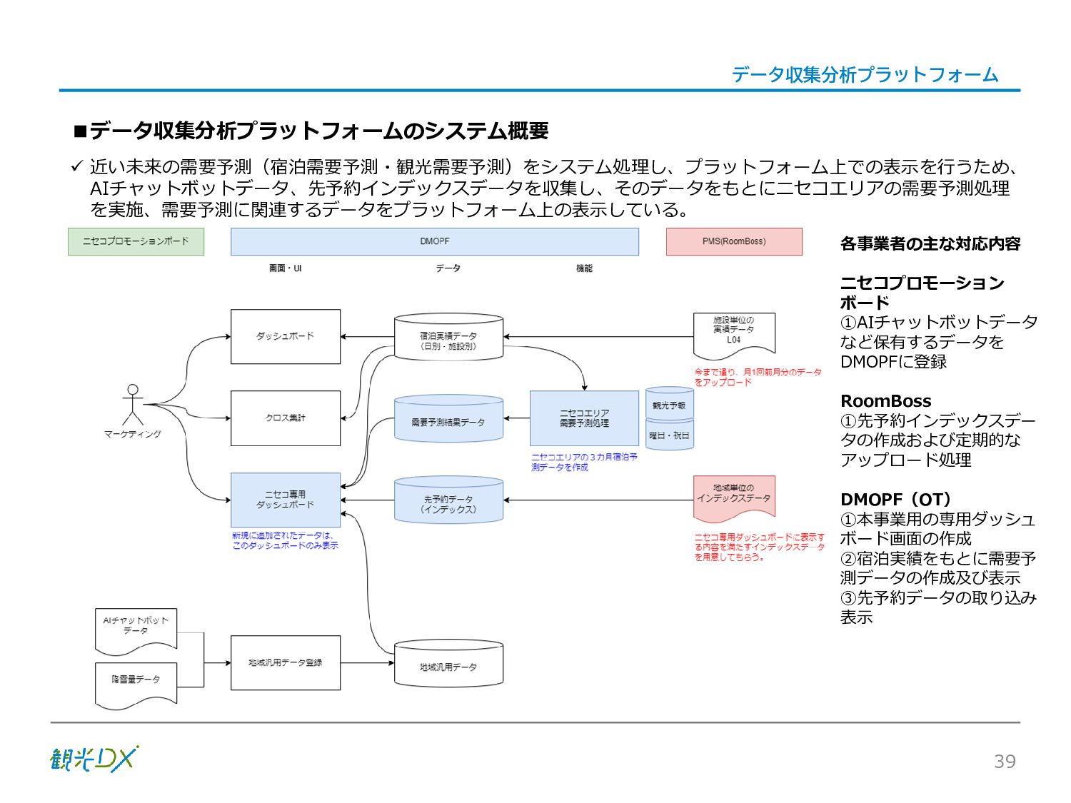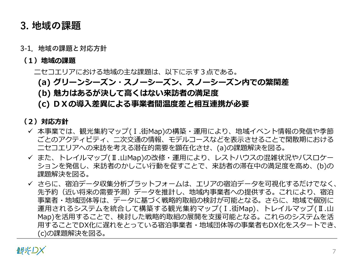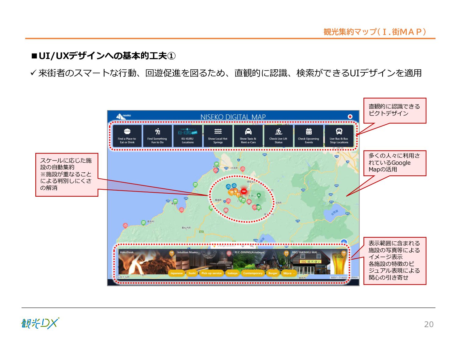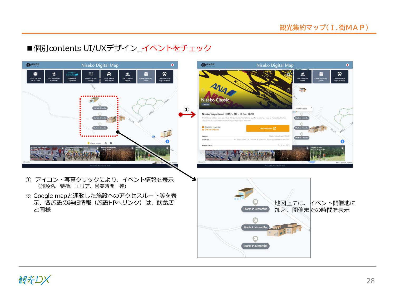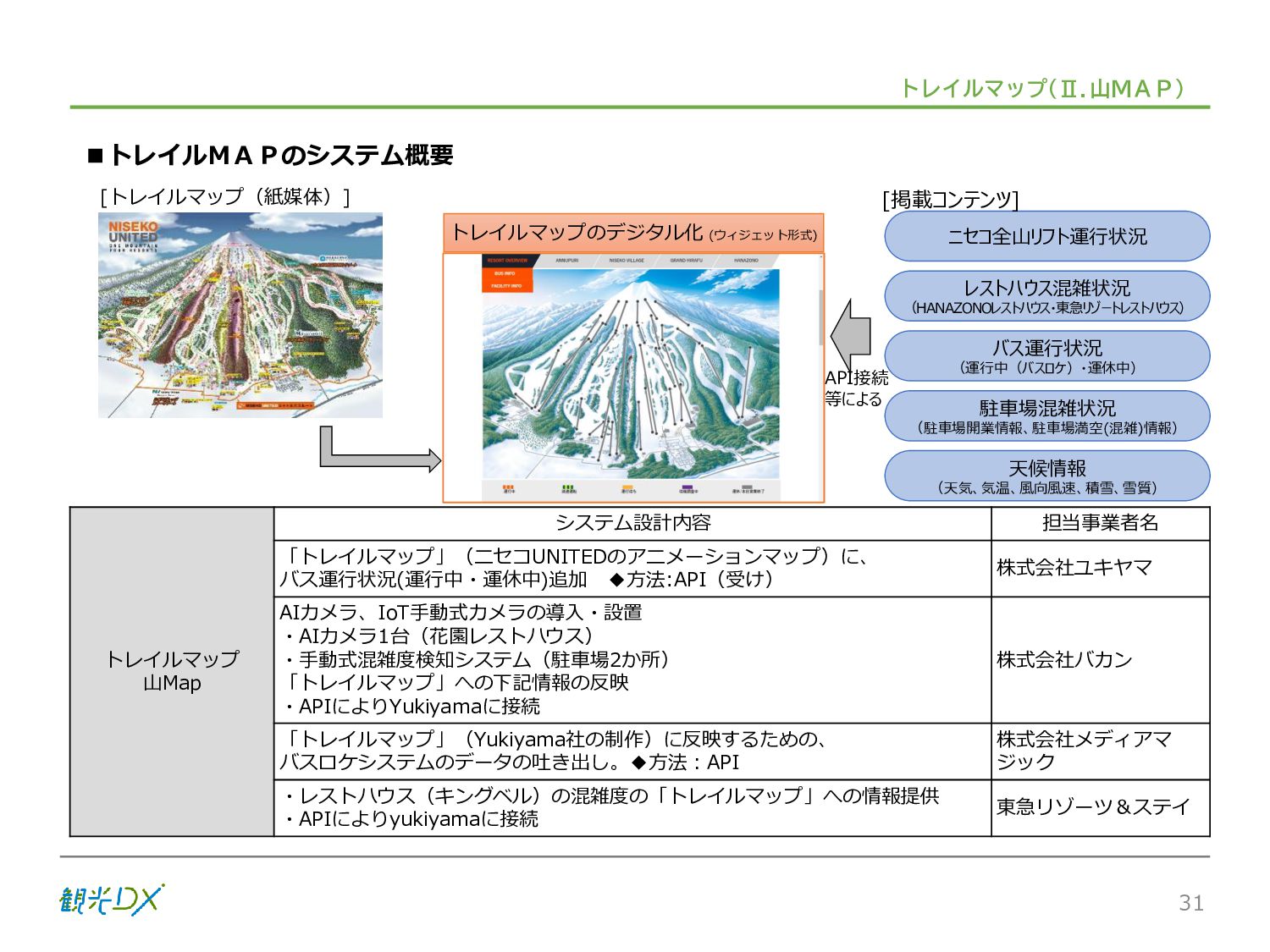 シーン 旅行者 の行動 ① 旅先の検索・選択 ② 旅行期間の選択、宿泊 先・交通機関予約(混ん でいる?。混雑で現地 で楽しめない?) ③ 旅先でのアクティビ ティの予約 ① 旅先での行動プランニ ング ② 天気予報の確認 (状況により予定変更) ③ 旅先の混雑状況確認 行動 思考 現時点で 接触できる ソリューション ✓ 旅先検索のきっかけと なるメールマガジン等 ✓ 観光系Webサイト ✓ 天気予報Webサイト ✓ WEBサイト(NISEKO UNITED)天気・運行 情報 ✓ WEBサイト (HANAZONO) 旅ナカ アクティビティ中 (観光・体験) アクティビティ後 (食事・宿泊) <通常時(現地到着)> ①ゲレンデ・ホテル間の移動方法の検索 ②空いているゲレンデは?、自身の趣向 にあったゲレンデの検索 (快適にスキーを楽しみたい) ③昼食時、開いている、空いているレスト ハウスはどこ? <悪天候時> ①悪天候でもスキー以外で楽しめるアク ティビティ等検索 ①食事(夕食)を楽しめるところは? ②夕食後の一杯(Bar等)を楽しみたい。 <翌日の行動予定> ①明日天気は?。スキー楽しめる? ②スキー以外で楽しめる観光は? ③お土産は何が良い?。ショッピングを 楽しむには? <通常時> ✓ WEBサイト(NISEKOUNITED)シャ トルバス時刻表 ✓ ㈱ニセコリゾート観光協会WEBサイト、 KU-KURU <悪天候時> ✓ ㈱ニセコリゾート観光協会WEBサイト、 KU-KURU ✓ その他、個別の観光情報サイト ✓ たべログなどの飲食Webサイト ✓ VACANMAP(飲食店混雑情報) <翌日の行動予定> ✓ 天気予報Webサイト ✓ WEBサイト(NISEKOUNITED)天 気・運行情報 ✓ ㈱ニセコリゾート観光協会WEBサイト、 KU-KURU ✓ その他、個別サイト 課題 タッチ ポイント ✓ 自宅 ✓ 自宅 ✓ 空港(出発) ✓ 空港(到着:千歳等) ✓ 鉄道駅(札幌駅、倶知安駅等) ✓ ホテル ✓ ゲレンデセンターハウス ✓ ホテル ✓ ニセコエリアを対象に、個別のリゾート情報サイトは あるが、旅行者の多様な行動パターンに即したまと まった情報提供サイトが不足 ✓ 現地の混雑情報に関する情報は取得できない。 ✓ ゲレンデの天候・リフト運行等の基礎的なリアルタイム情報は提供してい るが、旅行者が快適にかしこく現地で観光・アクティビティを楽しみなど、 滞在時満足度を高めるための情報が不足(ゲレンデ・飲食店の混雑情報、 バス運行情報など) ✓ より旅行者の満足度を高めるため、その時々に応じた多様な行動の選 択肢を提供するWEBサイトがない。 ✓ 情報がまとまっていない。 ①••で食べた食材、お酒を、自宅でも 楽しみたい ②違うシーズンでは楽しめる? 旅行者の満足度 向上に資する提 供すべき情報 ✓ ㈱ニセコリゾート観光協会WEBサイト、 KU-KURU ✓ 自宅 ✓ ニセコエリアを対象に、個別のリ ゾート情報サイトはあるが、旅行 者の多様な行動パターンに即し たまとまった情報提供サイトが 不足 ✓ 観光集約マップ(街Map) コンテンツ 飲食店情報、温泉施設情報、アクティビティ施設情報、リフト運行 情報、バス運行情報 ✓ トレイルマップ(山Map) コンテンツ ニセコ全山リフト運行状況、各リフトへのアクセス方法 レストハウス混雑状況、バス運行情報、駐車場混雑状況 天候情報(ゲレンデコンディション) ✓ 宿泊データ分析システムの活用 コンテンツ宿泊客予約データ 宿泊施設キャパシティデータ 宿泊施設の混雑情報の提供 ✓ KU-KURUの拡充 プロモーション性の高いWEBサ イトへの拡充 15 各システムは、観光客のカスタマージャーニーを踏まえつつ、利用イメージを確立した上で構築する。
