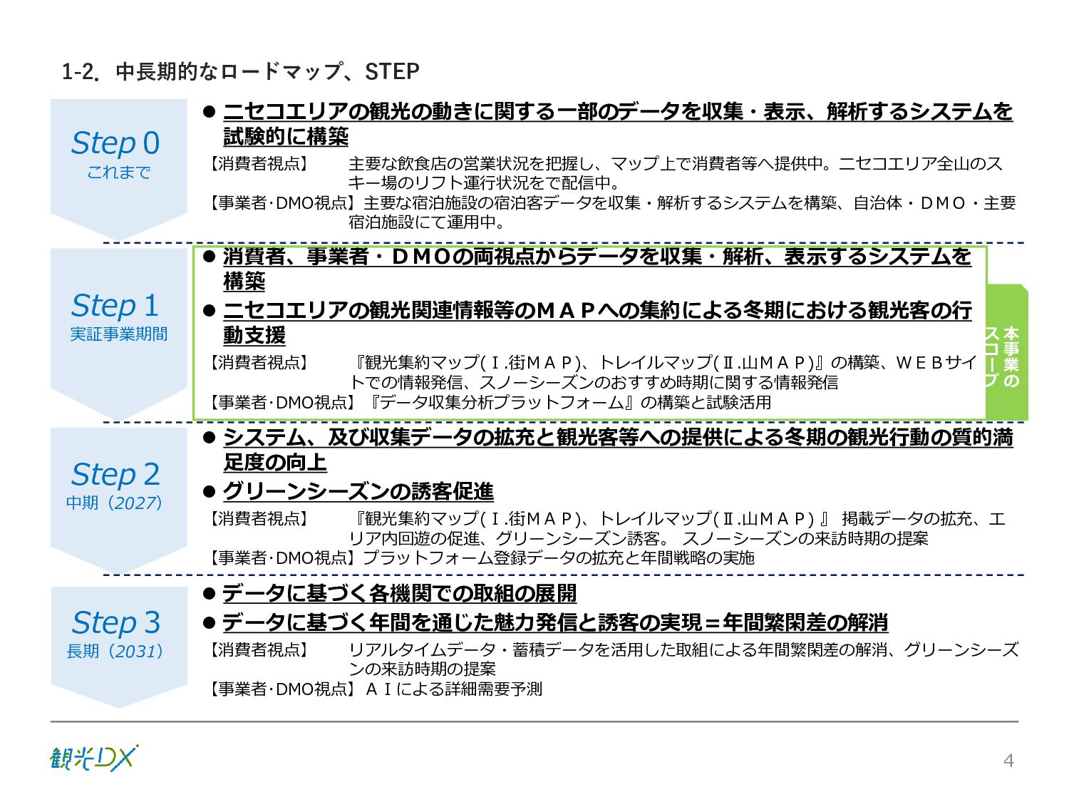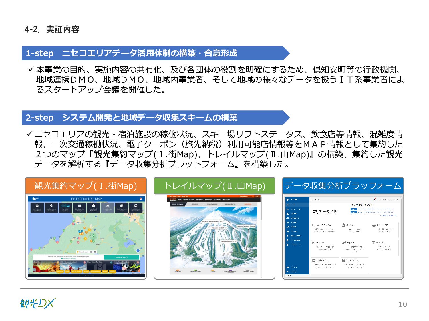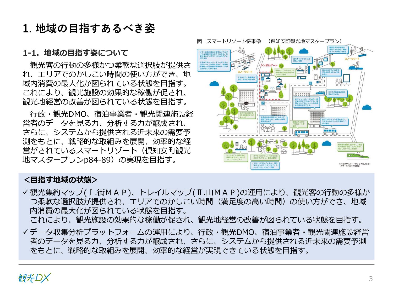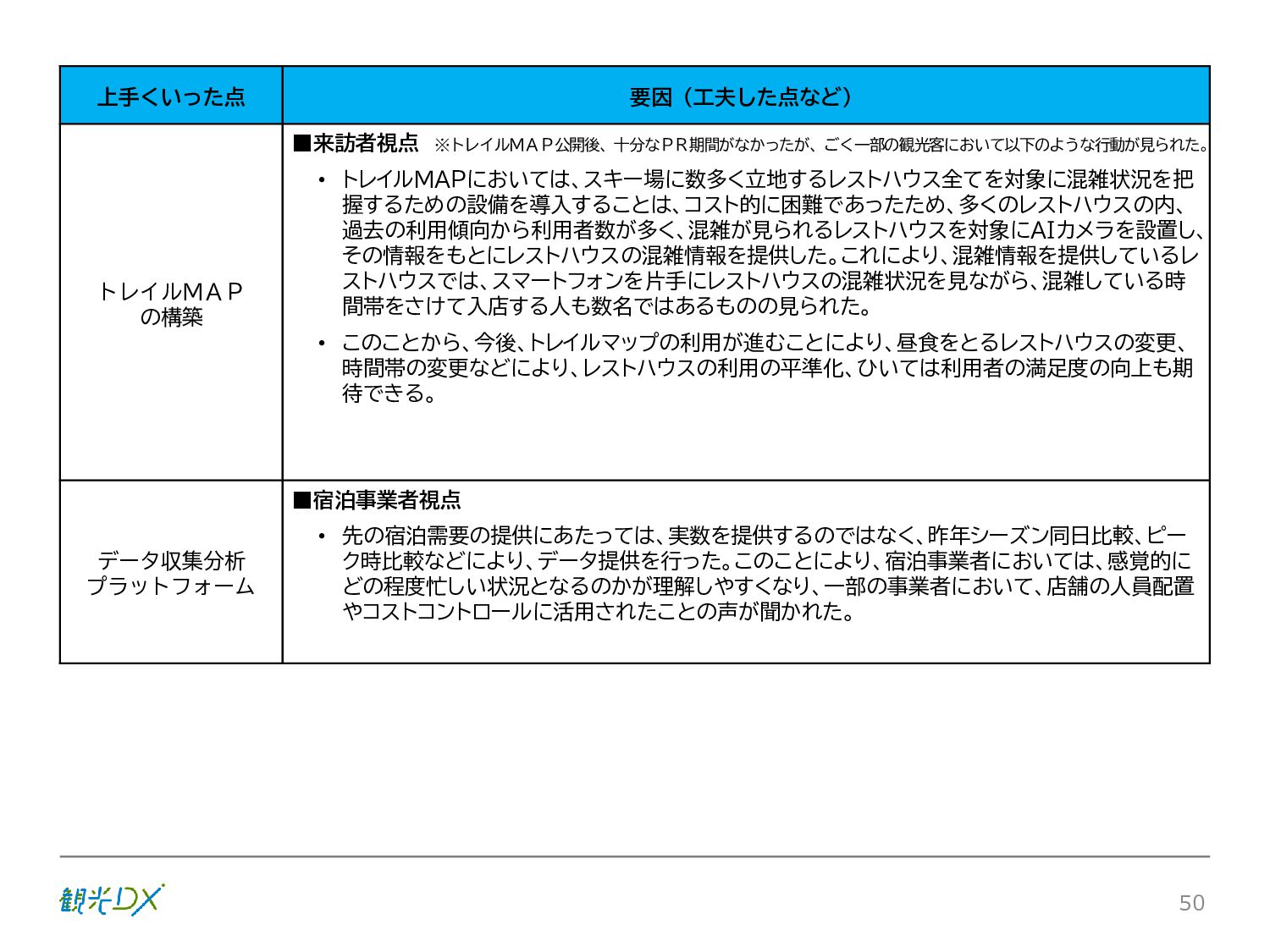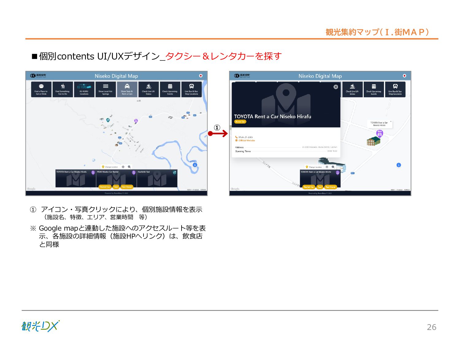 シーン 旅行者 の行動 ① 旅先の検索・選択 ② 旅行期間の選択、宿泊 先・交通機関予約(混ん でいる?。混雑で現地 で楽しめない?) ③ 旅先でのアクティビ ティの予約 ① 旅先での行動プランニ ング ② 天気予報の確認 (状況により予定変更) ③ 旅先の混雑状況確認 行動 思考 現時点で 接触できる ソリューション ✓ 旅先検索のきっかけと なるメールマガジン等 ✓ 観光系Webサイト ✓ 天気予報Webサイト ✓ WEBサイト(NISEKO UNITED)天気・運行 情報 ✓ WEBサイト (HANAZONO) 旅ナカ アクティビティ中 (観光・体験) アクティビティ後 (食事・宿泊) <通常時(現地到着)> ①ゲレンデ・ホテル間の移動方法の検索 ②空いているゲレンデは?、自身の趣向 にあったゲレンデの検索 (快適にスキーを楽しみたい) ③昼食時、開いている、空いているレスト ハウスはどこ? <悪天候時> ①悪天候でもスキー以外で楽しめるアク ティビティ等検索 ①食事(夕食)を楽しめるところは? ②夕食後の一杯(Bar等)を楽しみたい。 <翌日の行動予定> ①明日天気は?。スキー楽しめる? ②スキー以外で楽しめる観光は? ③お土産は何が良い?。ショッピングを 楽しむには? <通常時> ✓ WEBサイト(NISEKOUNITED)シャ トルバス時刻表 ✓ ㈱ニセコリゾート観光協会WEBサイト、 KU-KURU <悪天候時> ✓ ㈱ニセコリゾート観光協会WEBサイト、 KU-KURU ✓ その他、個別の観光情報サイト ✓ たべログなどの飲食Webサイト ✓ VACANMAP(飲食店混雑情報) <翌日の行動予定> ✓ 天気予報Webサイト ✓ WEBサイト(NISEKOUNITED)天 気・運行情報 ✓ ㈱ニセコリゾート観光協会WEBサイト、 KU-KURU ✓ その他、個別サイト 課題 タッチ ポイント ✓ 自宅 ✓ 自宅 ✓ 空港(出発) ✓ 空港(到着:千歳等) ✓ 鉄道駅(札幌駅、倶知安駅等) ✓ ホテル ✓ ゲレンデセンターハウス ✓ ホテル ✓ ニセコエリアを対象に、個別のリゾート情報サイトは あるが、旅行者の多様な行動パターンに即したまと まった情報提供サイトが不足 ✓ 現地の混雑情報に関する情報は取得できない。 ✓ ゲレンデの天候・リフト運行等の基礎的なリアルタイム情報は提供してい るが、旅行者が快適にかしこく現地で観光・アクティビティを楽しみなど、 滞在時満足度を高めるための情報が不足(ゲレンデ・飲食店の混雑情報、 バス運行情報など) ✓ より旅行者の満足度を高めるため、その時々に応じた多様な行動の選 択肢を提供するWEBサイトがない。 ✓ 情報がまとまっていない。 ①••で食べた食材、お酒を、自宅でも 楽しみたい ②違うシーズンでは楽しめる? 旅行者の満足度 向上に資する提 供すべき情報 ✓ ㈱ニセコリゾート観光協会WEBサイト、 KU-KURU ✓ 自宅 ✓ ニセコエリアを対象に、個別のリ ゾート情報サイトはあるが、旅行 者の多様な行動パターンに即し たまとまった情報提供サイトが 不足 ✓ 観光集約マップ(街Map) コンテンツ 飲食店情報、温泉施設情報、アクティビティ施設情報、リフト運行 情報、バス運行情報 ✓ トレイルマップ(山Map) コンテンツ ニセコ全山リフト運行状況、各リフトへのアクセス方法 レストハウス混雑状況、バス運行情報、駐車場混雑状況 天候情報(ゲレンデコンディション) ✓ 宿泊データ分析システムの活用 コンテンツ宿泊客予約データ 宿泊施設キャパシティデータ 宿泊施設の混雑情報の提供 ✓ KU-KURUの拡充 プロモーション性の高いWEBサ イトへの拡充 15 各システムは、観光客のカスタマージャーニーを踏まえつつ、利用イメージを確立した上で構築する。
