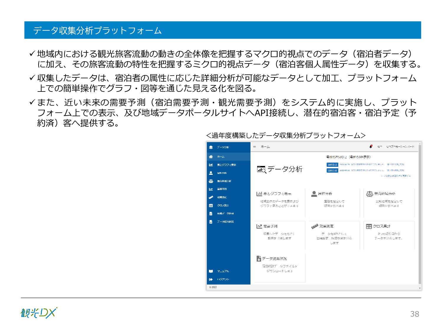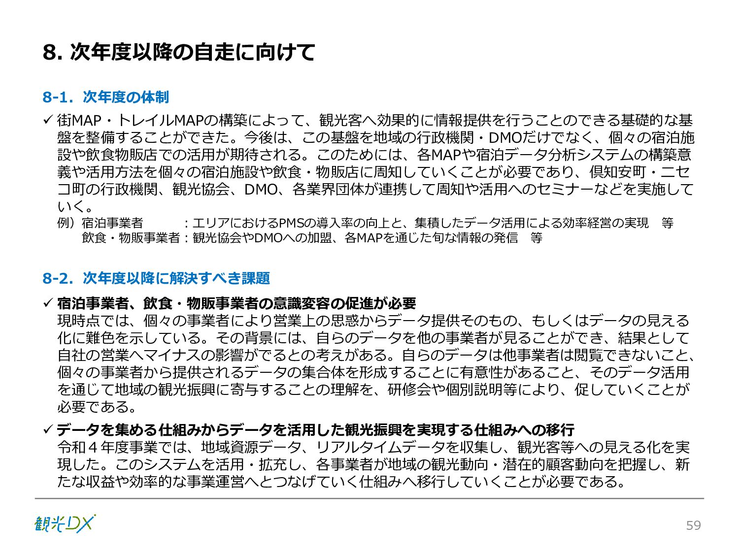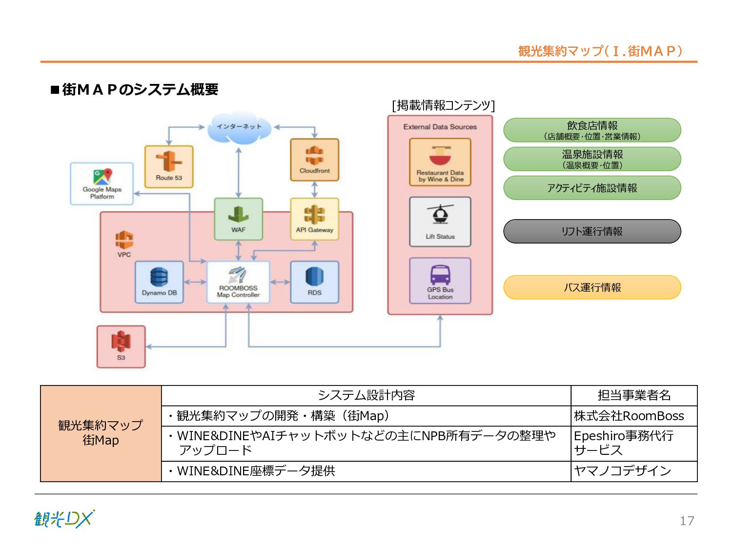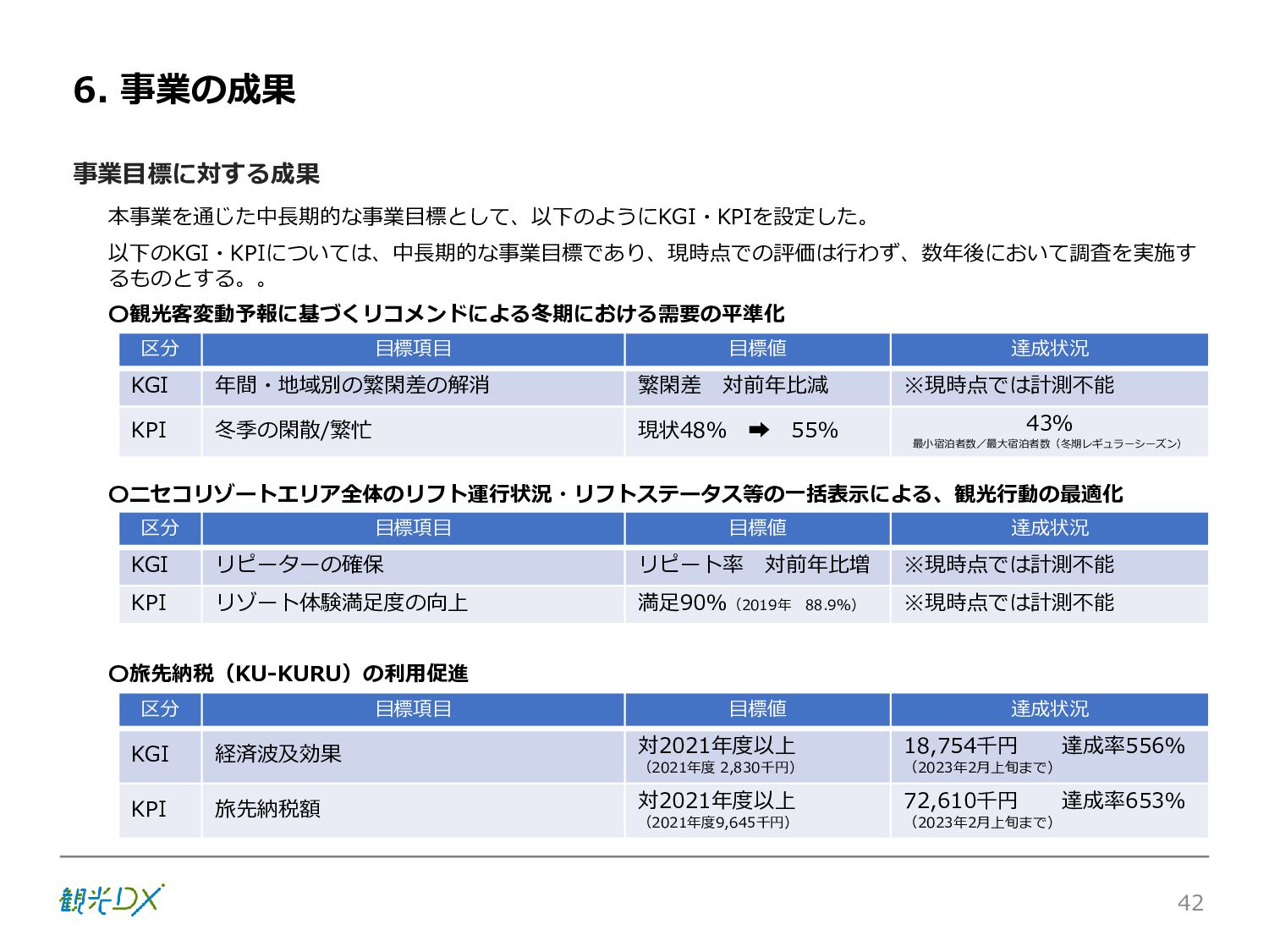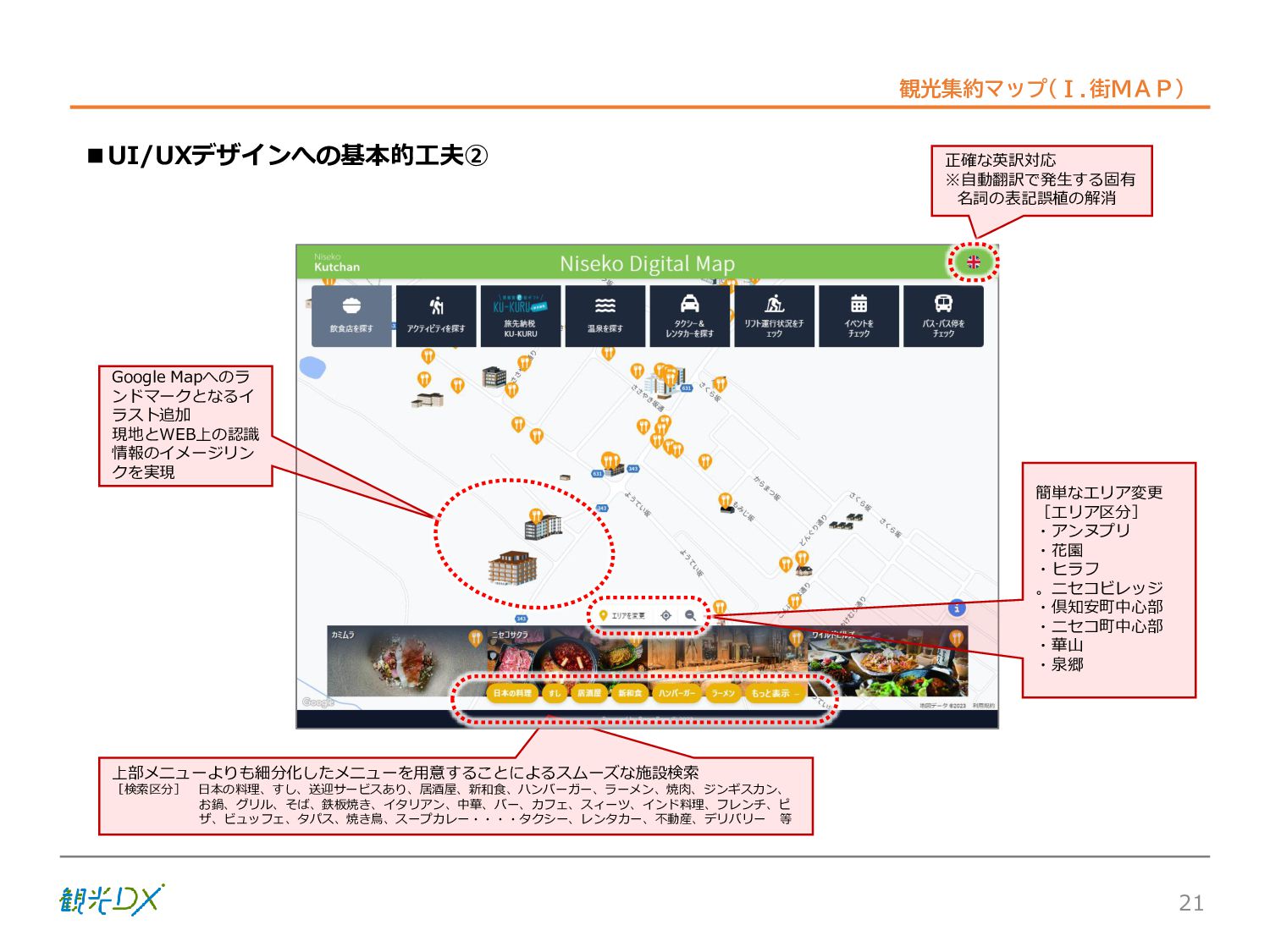 シーン 旅行者 の行動 ① 旅先の検索・選択 ② 旅行期間の選択、宿泊 先・交通機関予約(混ん でいる?。混雑で現地 で楽しめない?) ③ 旅先でのアクティビ ティの予約 ① 旅先での行動プランニ ング ② 天気予報の確認 (状況により予定変更) ③ 旅先の混雑状況確認 行動 思考 現時点で 接触できる ソリューション ✓ 旅先検索のきっかけと なるメールマガジン等 ✓ 観光系Webサイト ✓ 天気予報Webサイト ✓ WEBサイト(NISEKO UNITED)天気・運行 情報 ✓ WEBサイト (HANAZONO) 旅ナカ アクティビティ中 (観光・体験) アクティビティ後 (食事・宿泊) <通常時(現地到着)> ①ゲレンデ・ホテル間の移動方法の検索 ②空いているゲレンデは?、自身の趣向 にあったゲレンデの検索 (快適にスキーを楽しみたい) ③昼食時、開いている、空いているレスト ハウスはどこ? <悪天候時> ①悪天候でもスキー以外で楽しめるアク ティビティ等検索 ①食事(夕食)を楽しめるところは? ②夕食後の一杯(Bar等)を楽しみたい。 <翌日の行動予定> ①明日天気は?。スキー楽しめる? ②スキー以外で楽しめる観光は? ③お土産は何が良い?。ショッピングを 楽しむには? <通常時> ✓ WEBサイト(NISEKOUNITED)シャ トルバス時刻表 ✓ ㈱ニセコリゾート観光協会WEBサイト、 KU-KURU <悪天候時> ✓ ㈱ニセコリゾート観光協会WEBサイト、 KU-KURU ✓ その他、個別の観光情報サイト ✓ たべログなどの飲食Webサイト ✓ VACANMAP(飲食店混雑情報) <翌日の行動予定> ✓ 天気予報Webサイト ✓ WEBサイト(NISEKOUNITED)天 気・運行情報 ✓ ㈱ニセコリゾート観光協会WEBサイト、 KU-KURU ✓ その他、個別サイト 課題 タッチ ポイント ✓ 自宅 ✓ 自宅 ✓ 空港(出発) ✓ 空港(到着:千歳等) ✓ 鉄道駅(札幌駅、倶知安駅等) ✓ ホテル ✓ ゲレンデセンターハウス ✓ ホテル ✓ ニセコエリアを対象に、個別のリゾート情報サイトは あるが、旅行者の多様な行動パターンに即したまと まった情報提供サイトが不足 ✓ 現地の混雑情報に関する情報は取得できない。 ✓ ゲレンデの天候・リフト運行等の基礎的なリアルタイム情報は提供してい るが、旅行者が快適にかしこく現地で観光・アクティビティを楽しみなど、 滞在時満足度を高めるための情報が不足(ゲレンデ・飲食店の混雑情報、 バス運行情報など) ✓ より旅行者の満足度を高めるため、その時々に応じた多様な行動の選 択肢を提供するWEBサイトがない。 ✓ 情報がまとまっていない。 ①••で食べた食材、お酒を、自宅でも 楽しみたい ②違うシーズンでは楽しめる? 旅行者の満足度 向上に資する提 供すべき情報 ✓ ㈱ニセコリゾート観光協会WEBサイト、 KU-KURU ✓ 自宅 ✓ ニセコエリアを対象に、個別のリ ゾート情報サイトはあるが、旅行 者の多様な行動パターンに即し たまとまった情報提供サイトが 不足 ✓ 観光集約マップ(街Map) コンテンツ 飲食店情報、温泉施設情報、アクティビティ施設情報、リフト運行 情報、バス運行情報 ✓ トレイルマップ(山Map) コンテンツ ニセコ全山リフト運行状況、各リフトへのアクセス方法 レストハウス混雑状況、バス運行情報、駐車場混雑状況 天候情報(ゲレンデコンディション) ✓ 宿泊データ分析システムの活用 コンテンツ宿泊客予約データ 宿泊施設キャパシティデータ 宿泊施設の混雑情報の提供 ✓ KU-KURUの拡充 プロモーション性の高いWEBサ イトへの拡充 15 各システムは、観光客のカスタマージャーニーを踏まえつつ、利用イメージを確立した上で構築する。