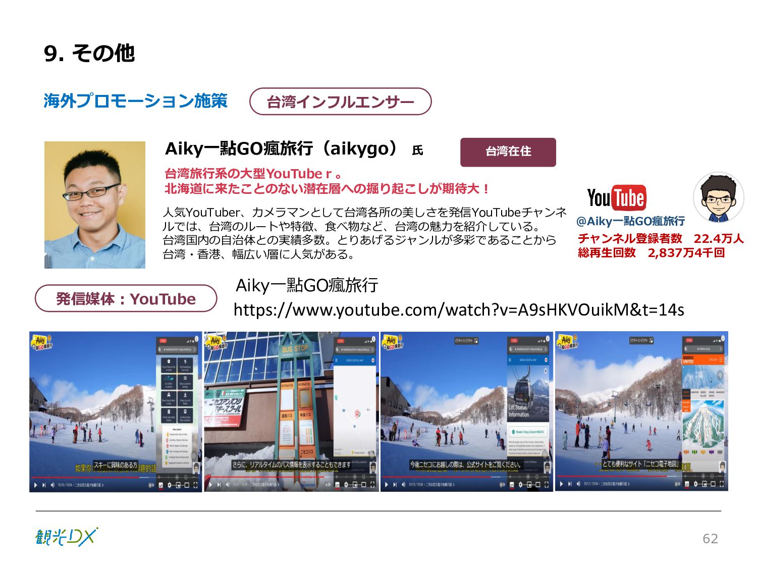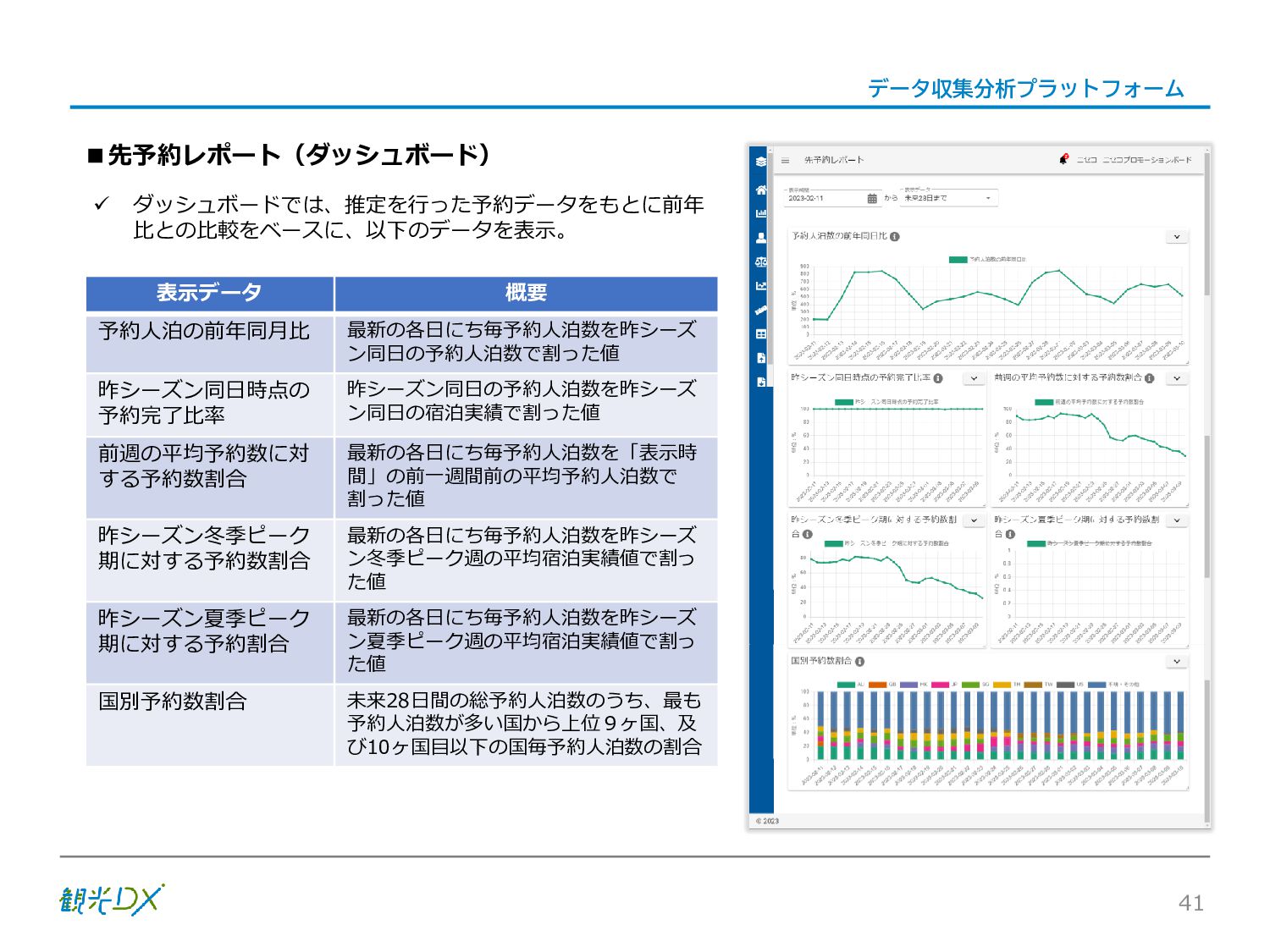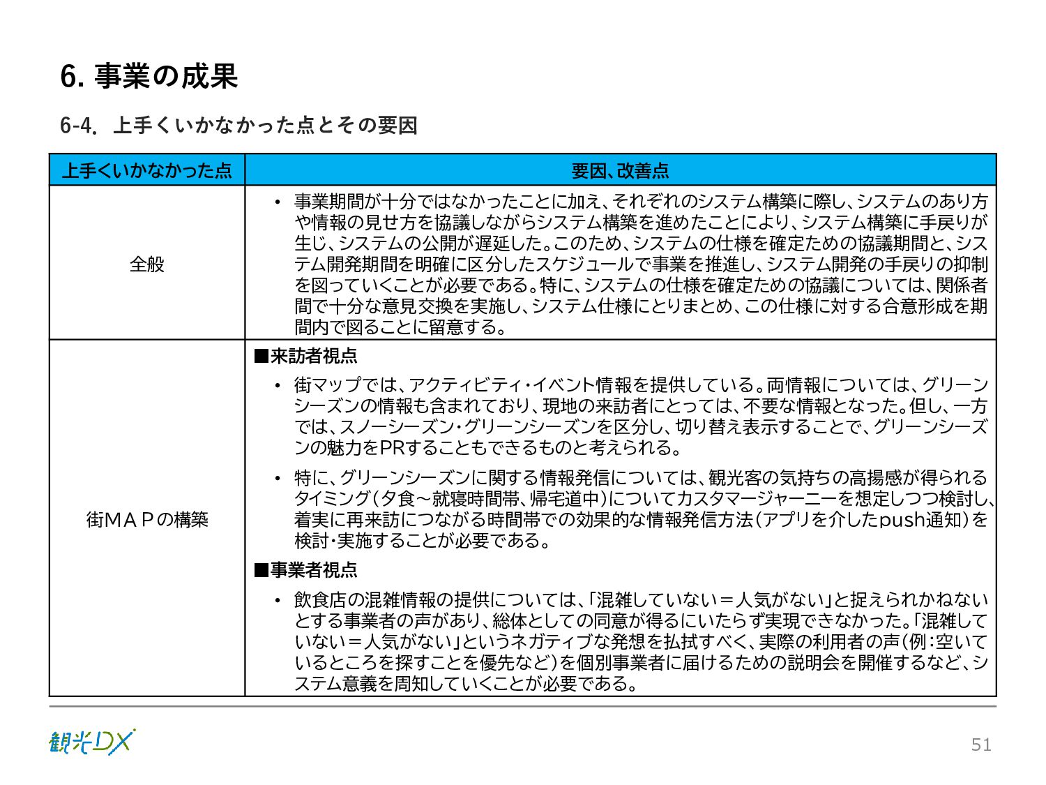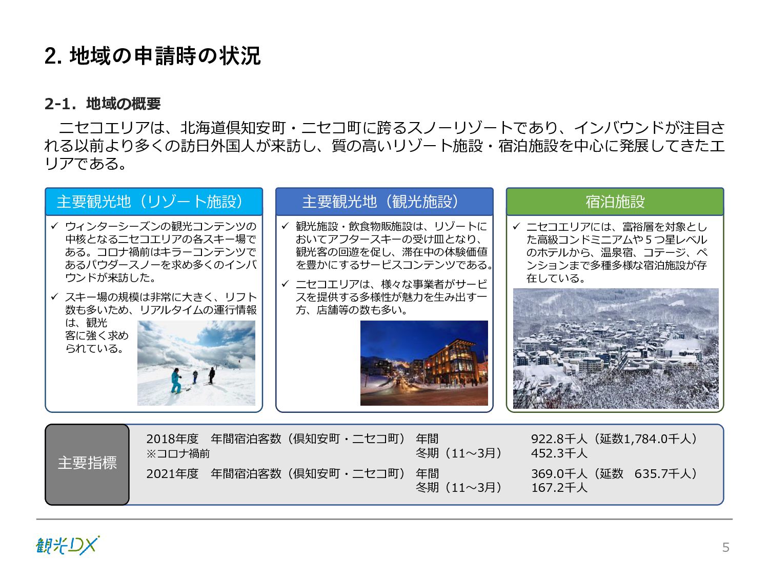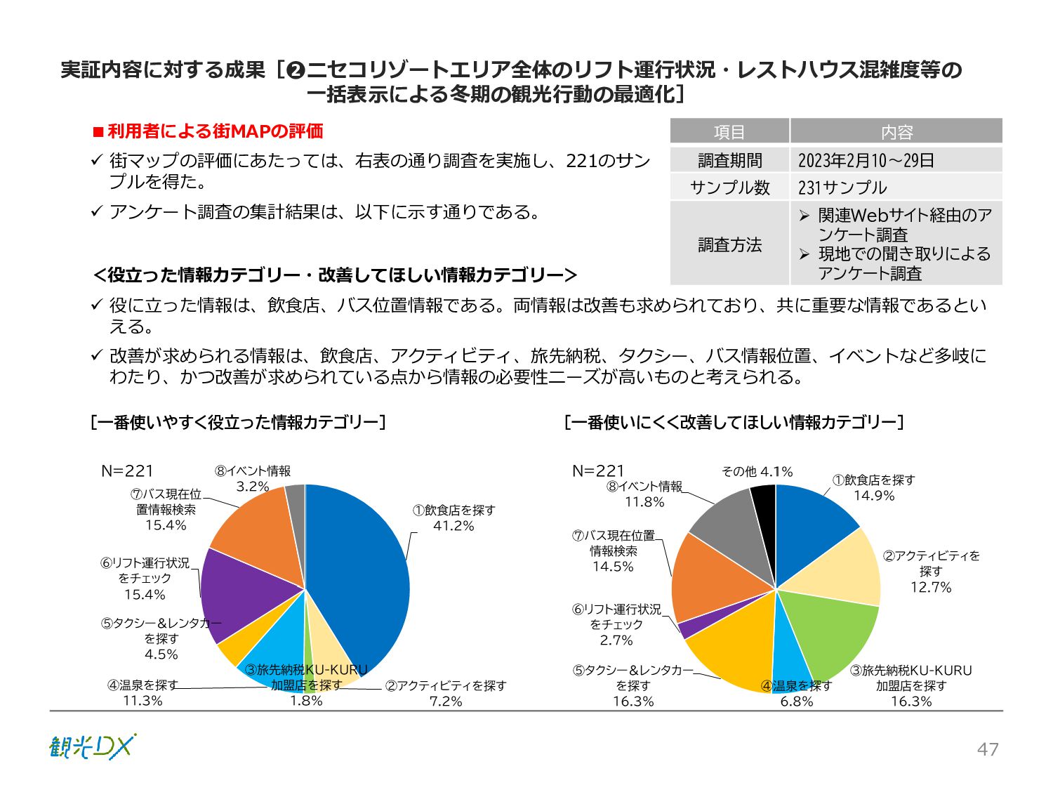 シーン 旅行者 の行動 ① 旅先の検索・選択 ② 旅行期間の選択、宿泊 先・交通機関予約(混ん でいる?。混雑で現地 で楽しめない?) ③ 旅先でのアクティビ ティの予約 ① 旅先での行動プランニ ング ② 天気予報の確認 (状況により予定変更) ③ 旅先の混雑状況確認 行動 思考 現時点で 接触できる ソリューション ✓ 旅先検索のきっかけと なるメールマガジン等 ✓ 観光系Webサイト ✓ 天気予報Webサイト ✓ WEBサイト(NISEKO UNITED)天気・運行 情報 ✓ WEBサイト (HANAZONO) 旅ナカ アクティビティ中 (観光・体験) アクティビティ後 (食事・宿泊) <通常時(現地到着)> ①ゲレンデ・ホテル間の移動方法の検索 ②空いているゲレンデは?、自身の趣向 にあったゲレンデの検索 (快適にスキーを楽しみたい) ③昼食時、開いている、空いているレスト ハウスはどこ? <悪天候時> ①悪天候でもスキー以外で楽しめるアク ティビティ等検索 ①食事(夕食)を楽しめるところは? ②夕食後の一杯(Bar等)を楽しみたい。 <翌日の行動予定> ①明日天気は?。スキー楽しめる? ②スキー以外で楽しめる観光は? ③お土産は何が良い?。ショッピングを 楽しむには? <通常時> ✓ WEBサイト(NISEKOUNITED)シャ トルバス時刻表 ✓ ㈱ニセコリゾート観光協会WEBサイト、 KU-KURU <悪天候時> ✓ ㈱ニセコリゾート観光協会WEBサイト、 KU-KURU ✓ その他、個別の観光情報サイト ✓ たべログなどの飲食Webサイト ✓ VACANMAP(飲食店混雑情報) <翌日の行動予定> ✓ 天気予報Webサイト ✓ WEBサイト(NISEKOUNITED)天 気・運行情報 ✓ ㈱ニセコリゾート観光協会WEBサイト、 KU-KURU ✓ その他、個別サイト 課題 タッチ ポイント ✓ 自宅 ✓ 自宅 ✓ 空港(出発) ✓ 空港(到着:千歳等) ✓ 鉄道駅(札幌駅、倶知安駅等) ✓ ホテル ✓ ゲレンデセンターハウス ✓ ホテル ✓ ニセコエリアを対象に、個別のリゾート情報サイトは あるが、旅行者の多様な行動パターンに即したまと まった情報提供サイトが不足 ✓ 現地の混雑情報に関する情報は取得できない。 ✓ ゲレンデの天候・リフト運行等の基礎的なリアルタイム情報は提供してい るが、旅行者が快適にかしこく現地で観光・アクティビティを楽しみなど、 滞在時満足度を高めるための情報が不足(ゲレンデ・飲食店の混雑情報、 バス運行情報など) ✓ より旅行者の満足度を高めるため、その時々に応じた多様な行動の選 択肢を提供するWEBサイトがない。 ✓ 情報がまとまっていない。 ①••で食べた食材、お酒を、自宅でも 楽しみたい ②違うシーズンでは楽しめる? 旅行者の満足度 向上に資する提 供すべき情報 ✓ ㈱ニセコリゾート観光協会WEBサイト、 KU-KURU ✓ 自宅 ✓ ニセコエリアを対象に、個別のリ ゾート情報サイトはあるが、旅行 者の多様な行動パターンに即し たまとまった情報提供サイトが 不足 ✓ 観光集約マップ(街Map) コンテンツ 飲食店情報、温泉施設情報、アクティビティ施設情報、リフト運行 情報、バス運行情報 ✓ トレイルマップ(山Map) コンテンツ ニセコ全山リフト運行状況、各リフトへのアクセス方法 レストハウス混雑状況、バス運行情報、駐車場混雑状況 天候情報(ゲレンデコンディション) ✓ 宿泊データ分析システムの活用 コンテンツ宿泊客予約データ 宿泊施設キャパシティデータ 宿泊施設の混雑情報の提供 ✓ KU-KURUの拡充 プロモーション性の高いWEBサ イトへの拡充 15 各システムは、観光客のカスタマージャーニーを踏まえつつ、利用イメージを確立した上で構築する。