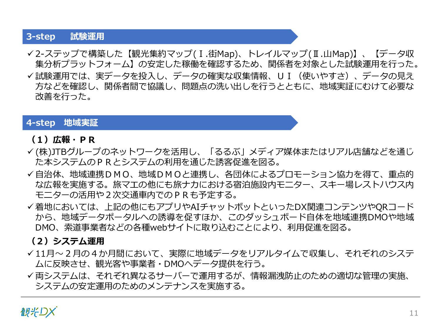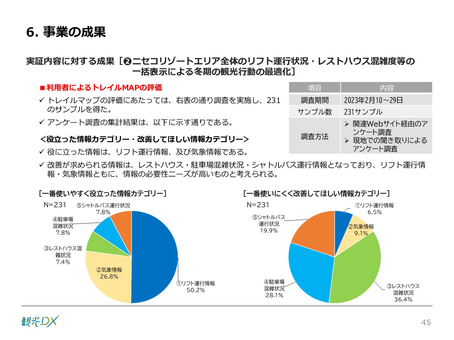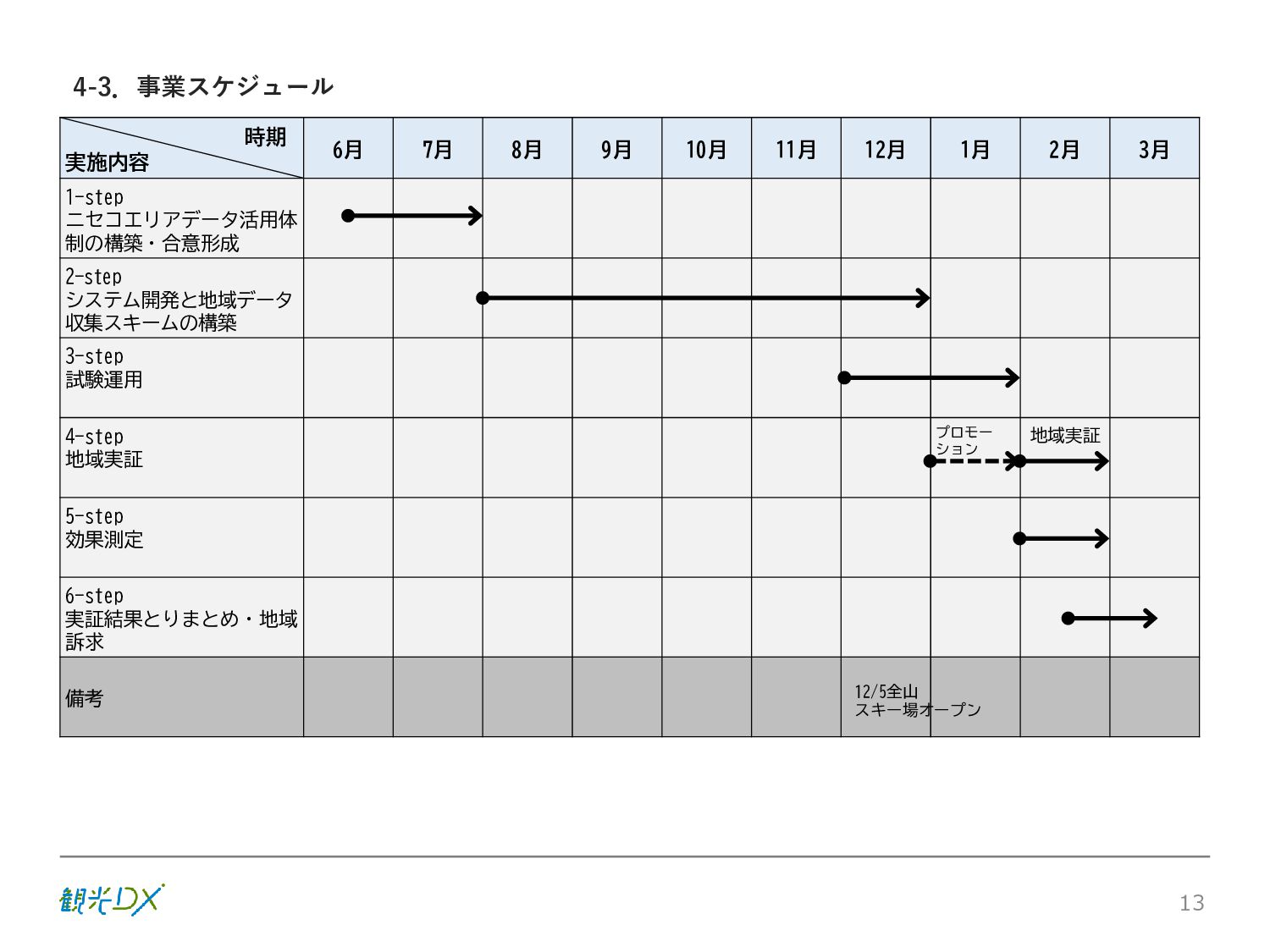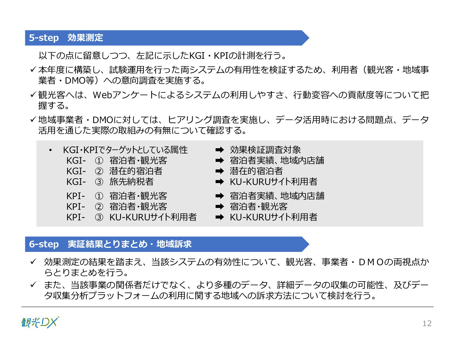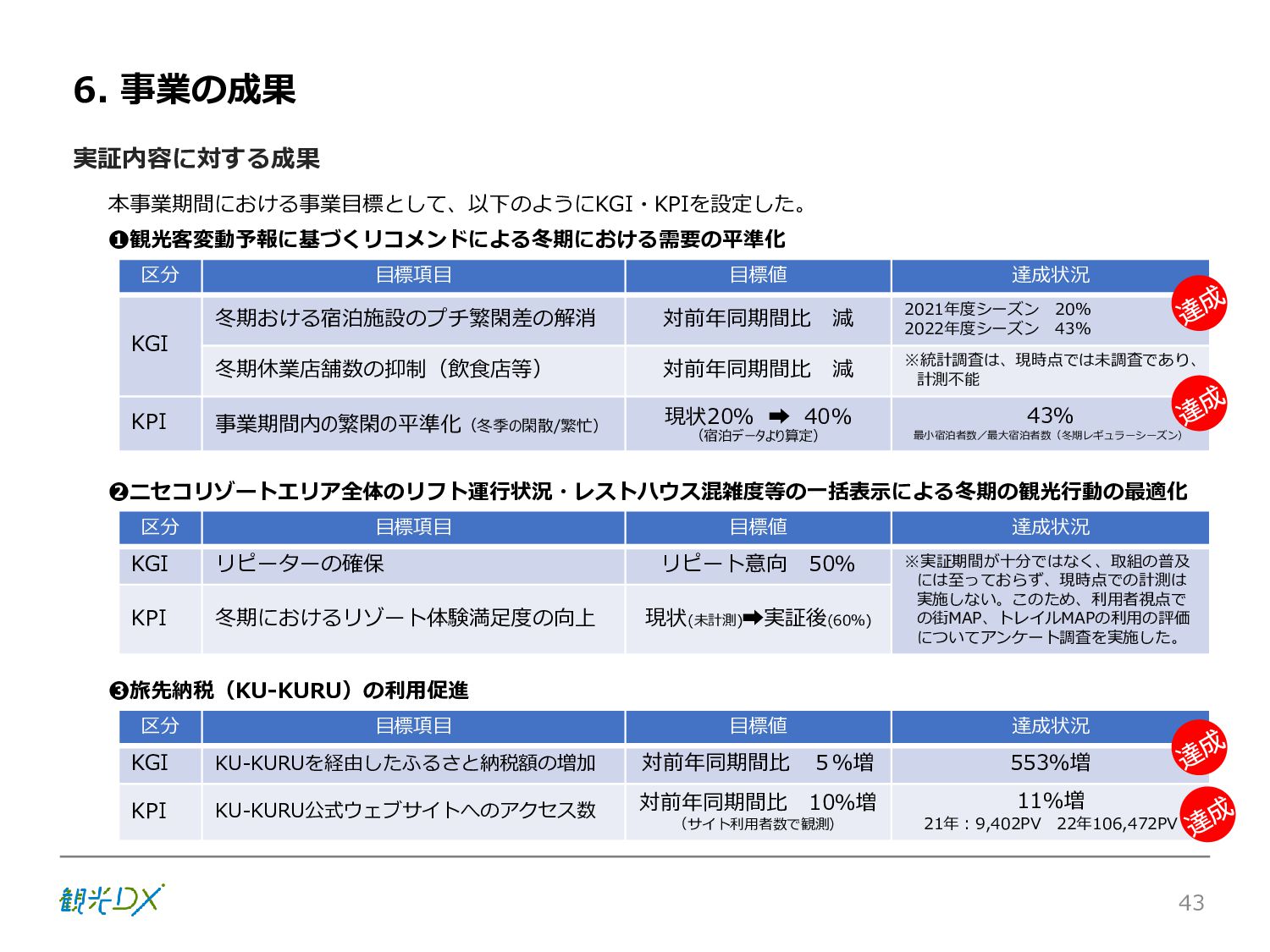 シーン 旅行者 の行動 ① 旅先の検索・選択 ② 旅行期間の選択、宿泊 先・交通機関予約(混ん でいる?。混雑で現地 で楽しめない?) ③ 旅先でのアクティビ ティの予約 ① 旅先での行動プランニ ング ② 天気予報の確認 (状況により予定変更) ③ 旅先の混雑状況確認 行動 思考 現時点で 接触できる ソリューション ✓ 旅先検索のきっかけと なるメールマガジン等 ✓ 観光系Webサイト ✓ 天気予報Webサイト ✓ WEBサイト(NISEKO UNITED)天気・運行 情報 ✓ WEBサイト (HANAZONO) 旅ナカ アクティビティ中 (観光・体験) アクティビティ後 (食事・宿泊) <通常時(現地到着)> ①ゲレンデ・ホテル間の移動方法の検索 ②空いているゲレンデは?、自身の趣向 にあったゲレンデの検索 (快適にスキーを楽しみたい) ③昼食時、開いている、空いているレスト ハウスはどこ? <悪天候時> ①悪天候でもスキー以外で楽しめるアク ティビティ等検索 ①食事(夕食)を楽しめるところは? ②夕食後の一杯(Bar等)を楽しみたい。 <翌日の行動予定> ①明日天気は?。スキー楽しめる? ②スキー以外で楽しめる観光は? ③お土産は何が良い?。ショッピングを 楽しむには? <通常時> ✓ WEBサイト(NISEKOUNITED)シャ トルバス時刻表 ✓ ㈱ニセコリゾート観光協会WEBサイト、 KU-KURU <悪天候時> ✓ ㈱ニセコリゾート観光協会WEBサイト、 KU-KURU ✓ その他、個別の観光情報サイト ✓ たべログなどの飲食Webサイト ✓ VACANMAP(飲食店混雑情報) <翌日の行動予定> ✓ 天気予報Webサイト ✓ WEBサイト(NISEKOUNITED)天 気・運行情報 ✓ ㈱ニセコリゾート観光協会WEBサイト、 KU-KURU ✓ その他、個別サイト 課題 タッチ ポイント ✓ 自宅 ✓ 自宅 ✓ 空港(出発) ✓ 空港(到着:千歳等) ✓ 鉄道駅(札幌駅、倶知安駅等) ✓ ホテル ✓ ゲレンデセンターハウス ✓ ホテル ✓ ニセコエリアを対象に、個別のリゾート情報サイトは あるが、旅行者の多様な行動パターンに即したまと まった情報提供サイトが不足 ✓ 現地の混雑情報に関する情報は取得できない。 ✓ ゲレンデの天候・リフト運行等の基礎的なリアルタイム情報は提供してい るが、旅行者が快適にかしこく現地で観光・アクティビティを楽しみなど、 滞在時満足度を高めるための情報が不足(ゲレンデ・飲食店の混雑情報、 バス運行情報など) ✓ より旅行者の満足度を高めるため、その時々に応じた多様な行動の選 択肢を提供するWEBサイトがない。 ✓ 情報がまとまっていない。 ①••で食べた食材、お酒を、自宅でも 楽しみたい ②違うシーズンでは楽しめる? 旅行者の満足度 向上に資する提 供すべき情報 ✓ ㈱ニセコリゾート観光協会WEBサイト、 KU-KURU ✓ 自宅 ✓ ニセコエリアを対象に、個別のリ ゾート情報サイトはあるが、旅行 者の多様な行動パターンに即し たまとまった情報提供サイトが 不足 ✓ 観光集約マップ(街Map) コンテンツ 飲食店情報、温泉施設情報、アクティビティ施設情報、リフト運行 情報、バス運行情報 ✓ トレイルマップ(山Map) コンテンツ ニセコ全山リフト運行状況、各リフトへのアクセス方法 レストハウス混雑状況、バス運行情報、駐車場混雑状況 天候情報(ゲレンデコンディション) ✓ 宿泊データ分析システムの活用 コンテンツ宿泊客予約データ 宿泊施設キャパシティデータ 宿泊施設の混雑情報の提供 ✓ KU-KURUの拡充 プロモーション性の高いWEBサ イトへの拡充 15 各システムは、観光客のカスタマージャーニーを踏まえつつ、利用イメージを確立した上で構築する。